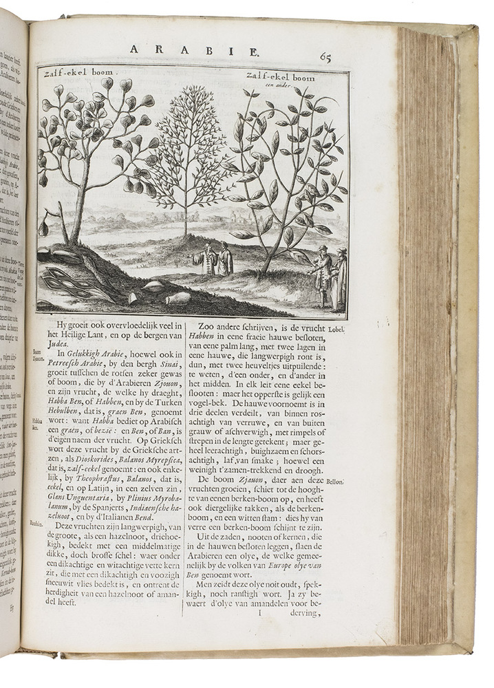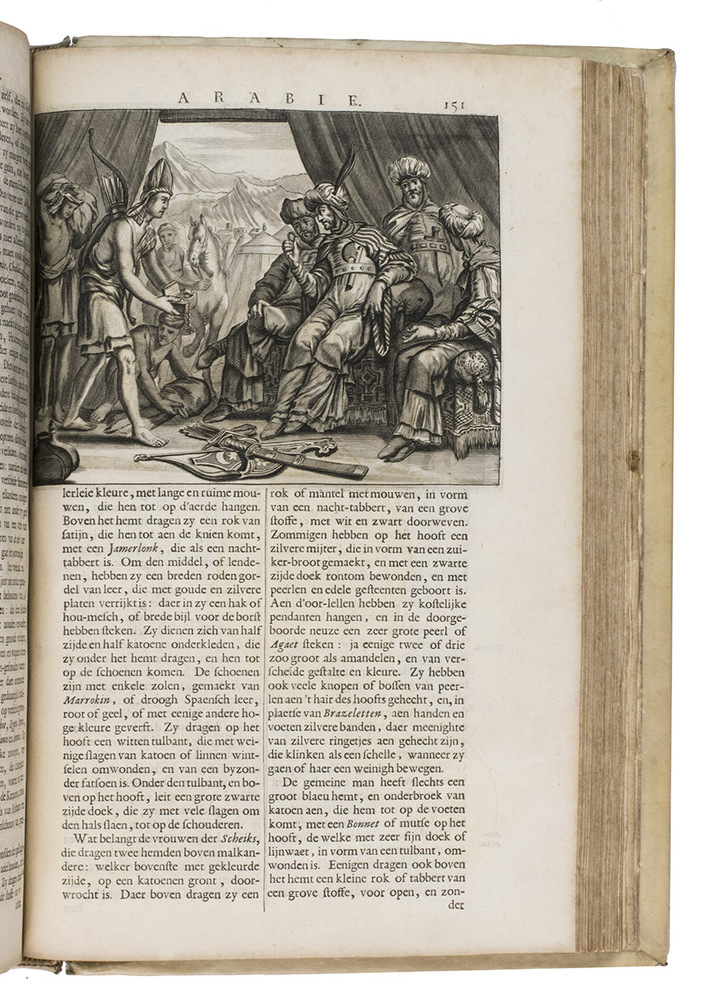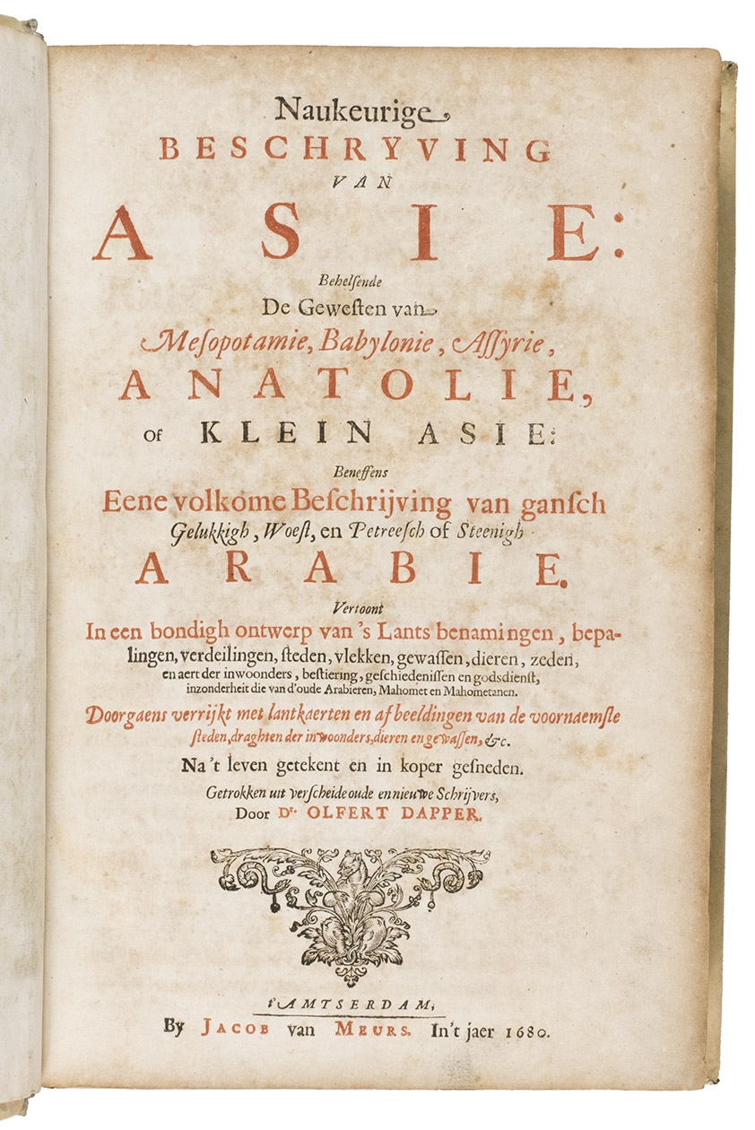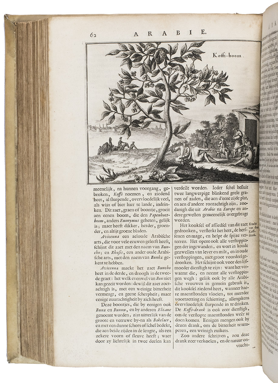 First edition of Olfert Dapper's important description of the Middle East. The first part is devoted to Mesopotamia or Algizira, Babylonia, Assyria and Anatolia, while the second is entirely devoted to Arabia. The work is especially important for the original and new information on Islam, Arabic science, astronomy, philosophy and historiography. The fine plates and illustrations include views of Mount Sinai, Bagdad, Basra, Nineveh, Abydos, Smyrna, Aden, Muscat and Mocha. The second part includes a description of coffee: "In Arabia Felix alone, and in no other place of the whole world, there grows a seed or corn or bean shrub which the Arabs call 'Bon' or 'Ban', of which they prepare a drink by cooking it in water over the fire . . ." (part 2, pp. 61-62).