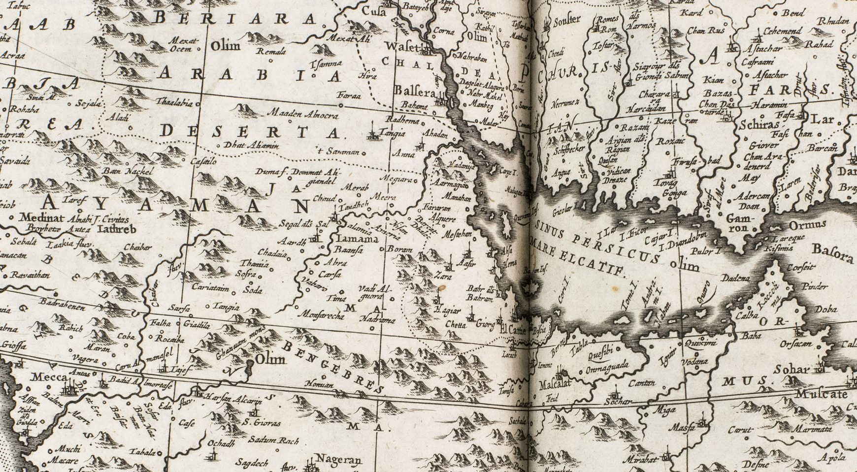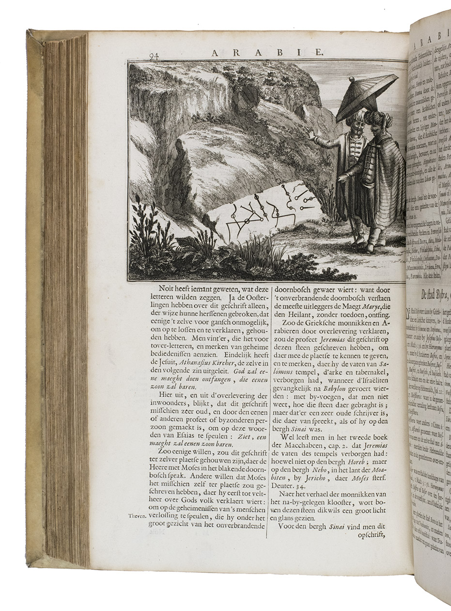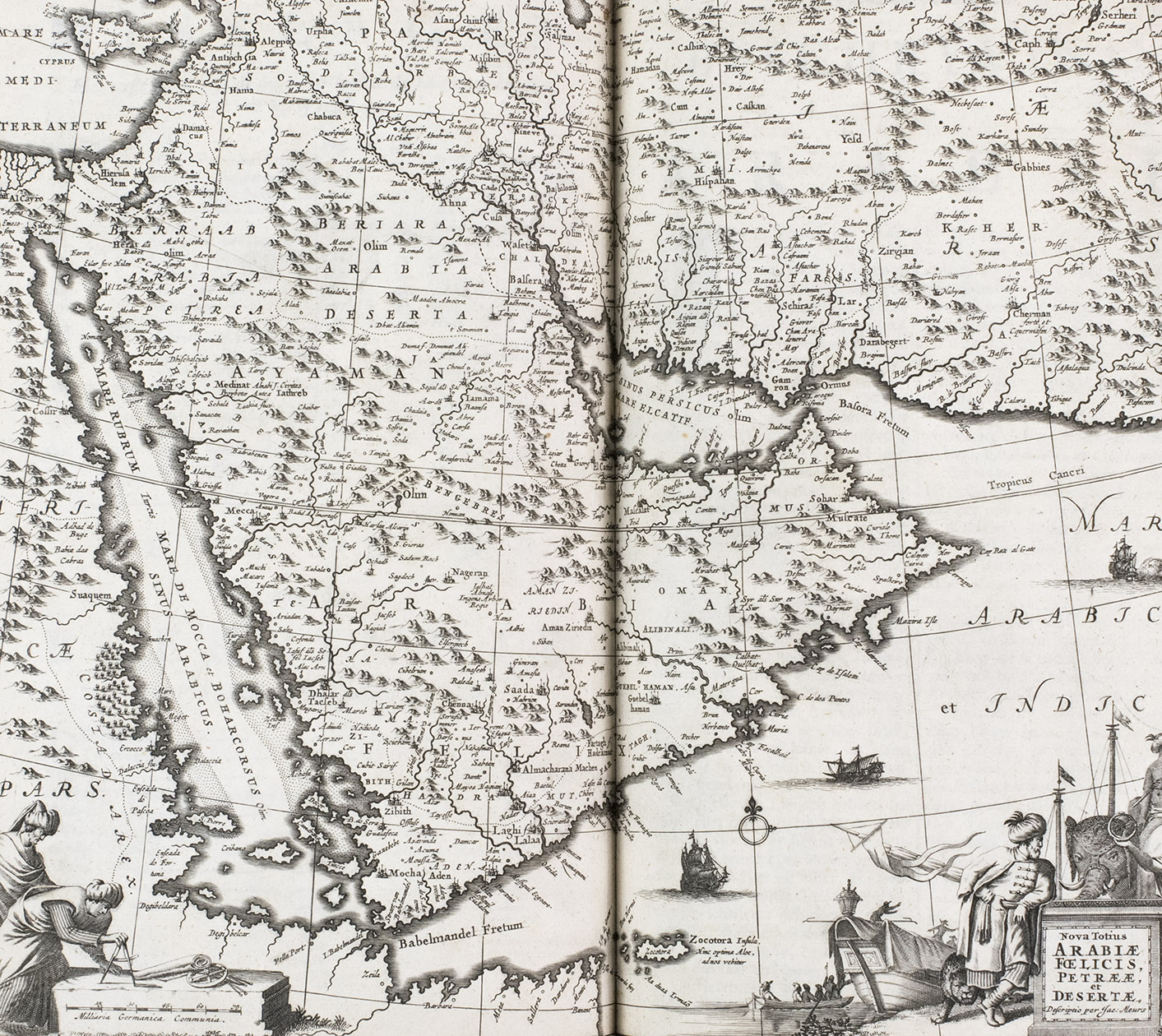 First edition of Olfert Dapper's important description of the Middle East. The first part is devoted to Mesopotamia or Algizira, Babylonia, Assyria and Anatolia, while the second is entirely devoted to Arabia. The work is especially important for the original and new information on Islam, Arabic science, astronomy, philosophy and historiography. The fine plates and illustrations include views of Mount Sinai, Bagdad, Basra, Nineveh, Abydos, Smyrna, Aden, Muscat and Mocha. The second part includes a description of coffee: "In Arabia Felix alone, and in no other place of the whole world, there grows a seed or corn or bean shrub which the Arabs call 'Bon' or 'Ban', of which they prepare a drink by cooking it in water over the fire . . ." (part 2, pp. 61-62).