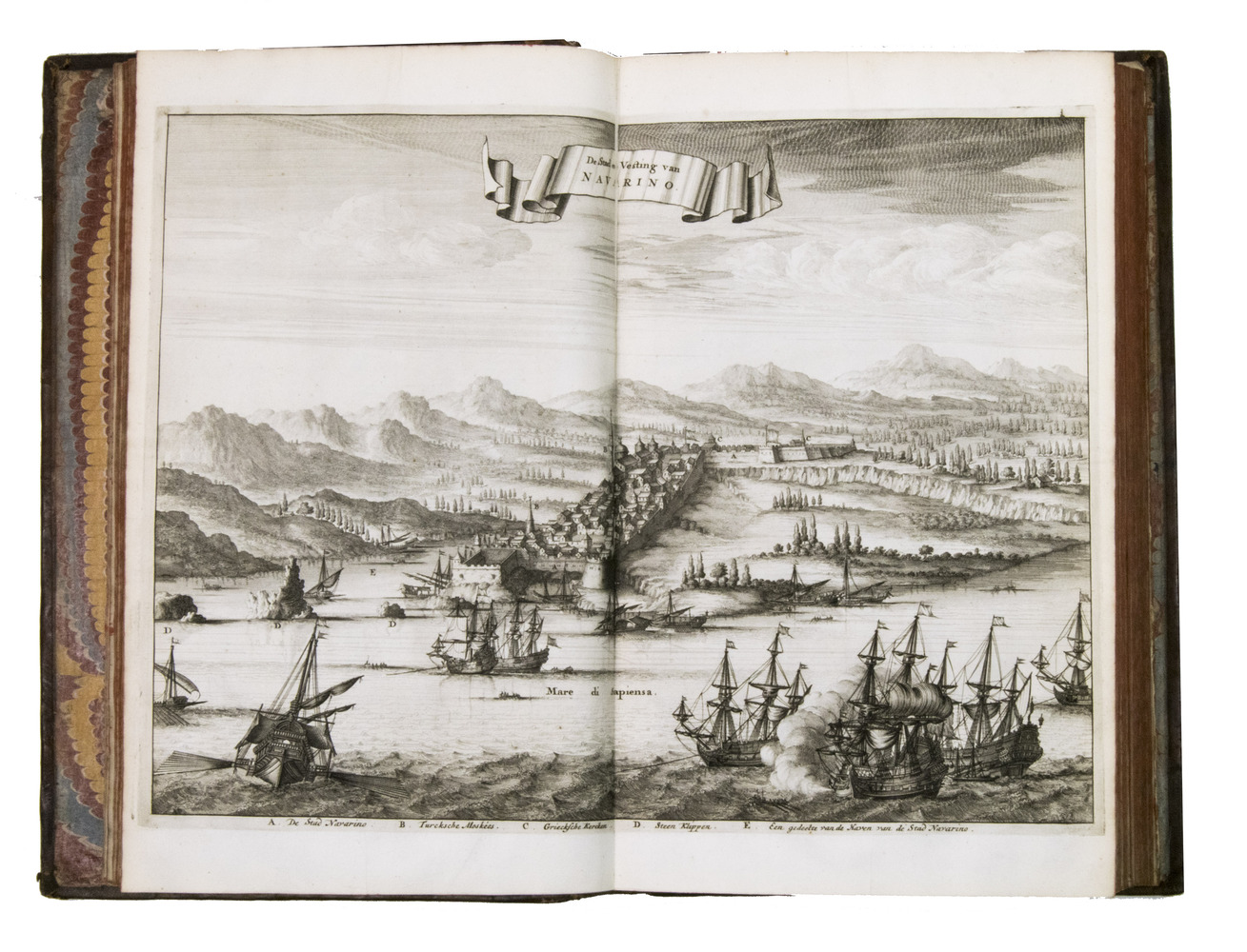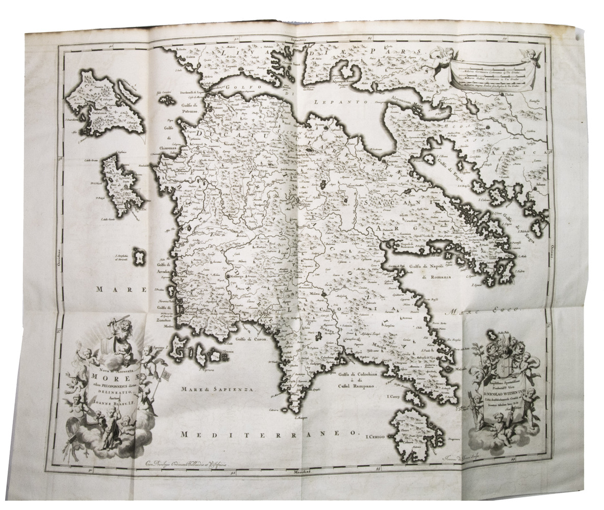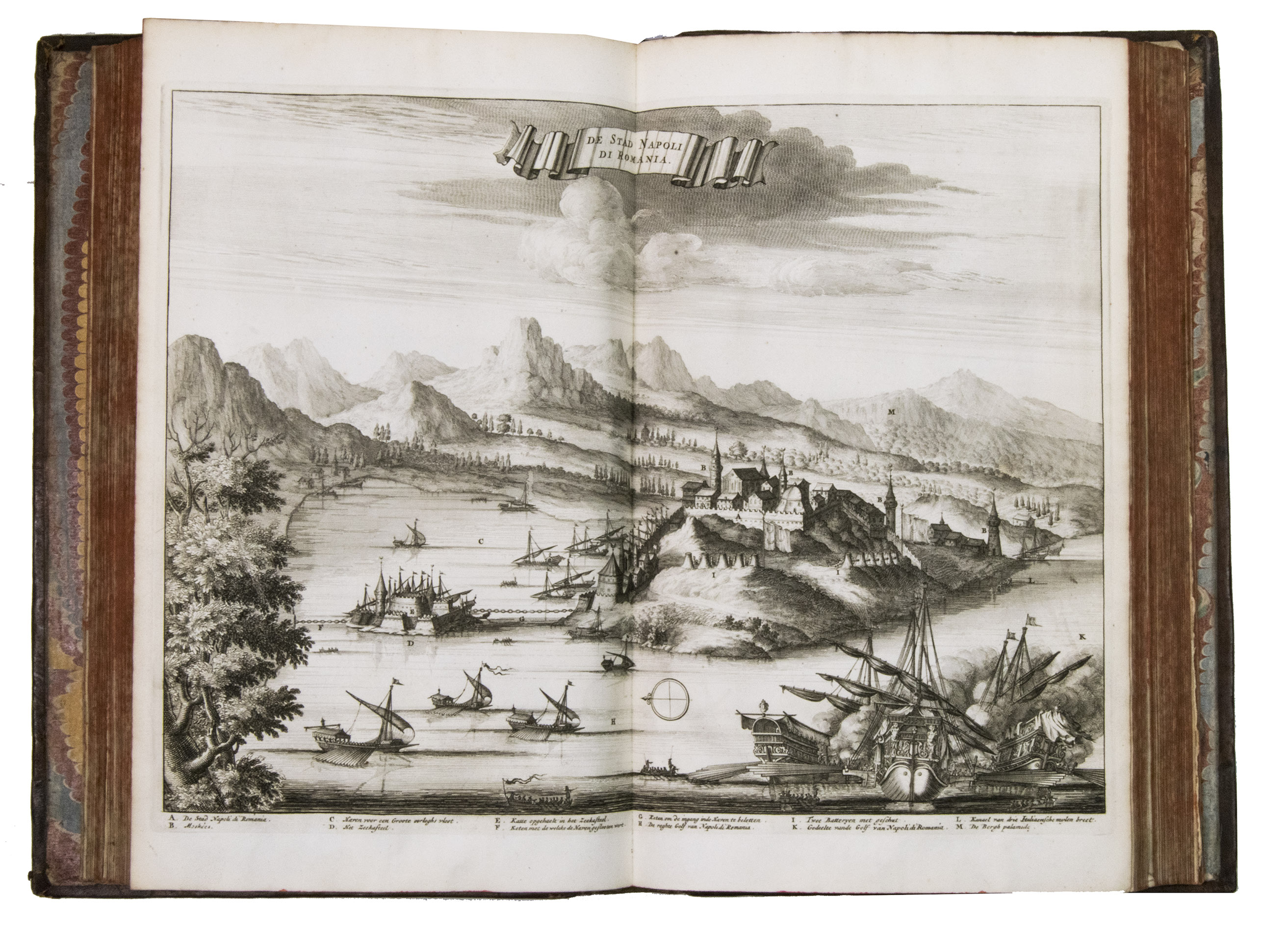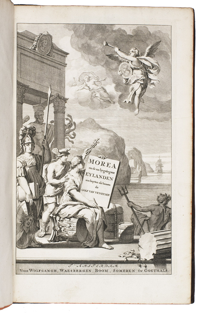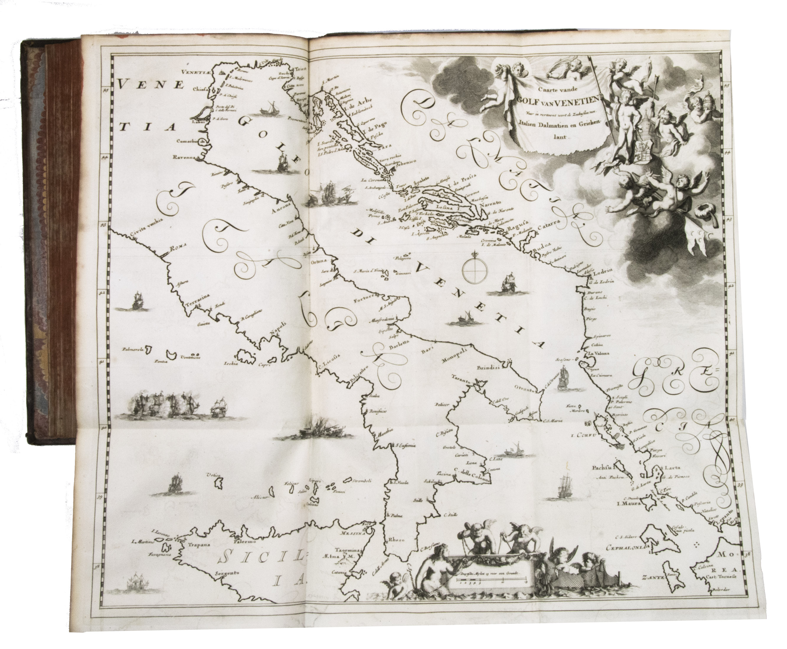First and only edition of an important and richly illustrated work on the Peloponnese and the Adriatic Sea, with descriptions of Venice, the Dalmatian coast, and several of the major Greek Islands. The work is notable for its fine plates, after Vincenzo Maria Coronelli (1650-1718), Jacob van Meurs (ca. 1620-1679), Joan Blaeu (ca. 1598-1673) and others. It was probably published in response to the Morean War (1684-1699), the sixth conflict between the Republic of Venice and the Ottoman Empire, in which Venice took control of the Peloponnese peninsula (also known as Morea). The maps show various locations from this battle.