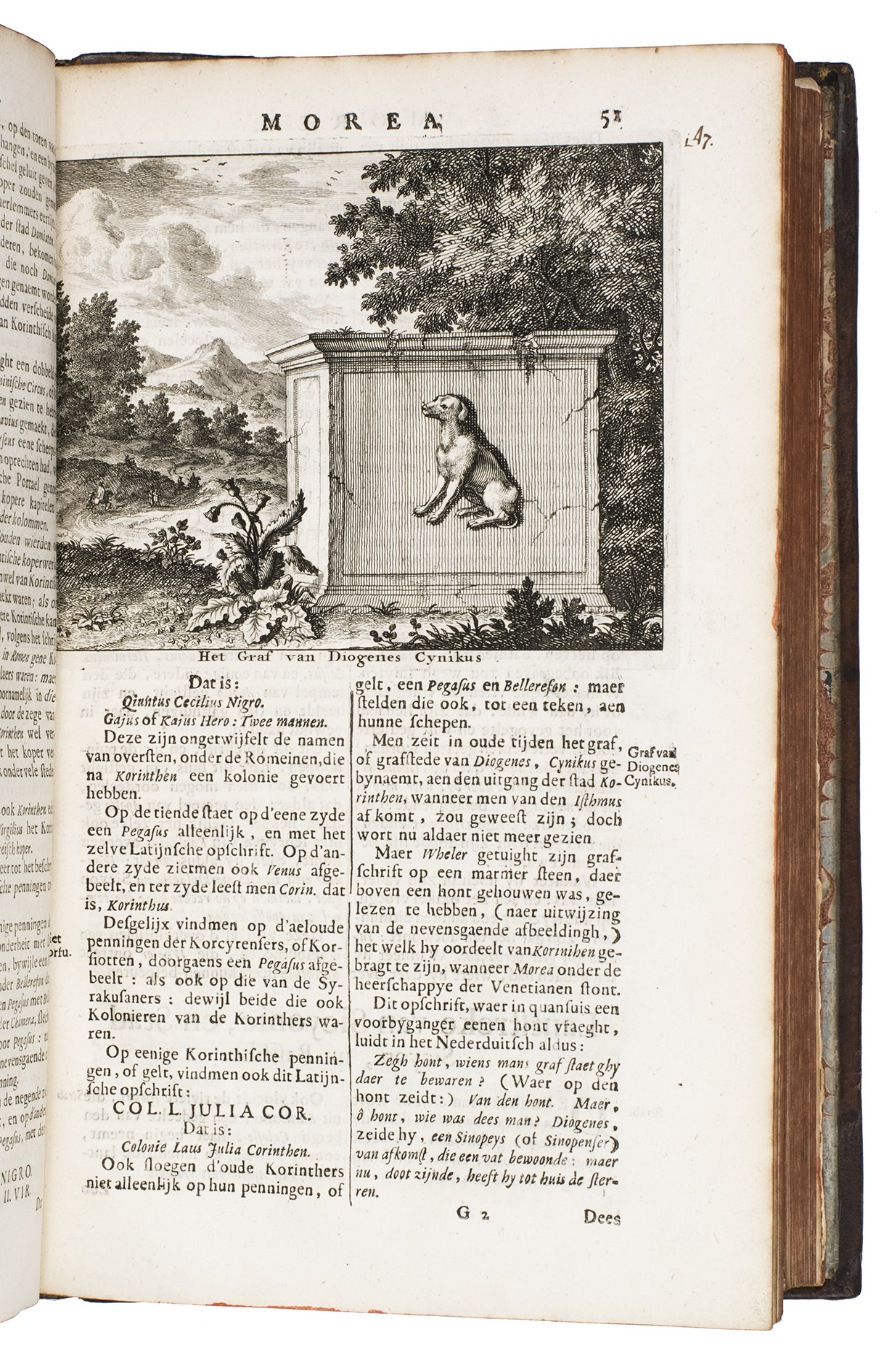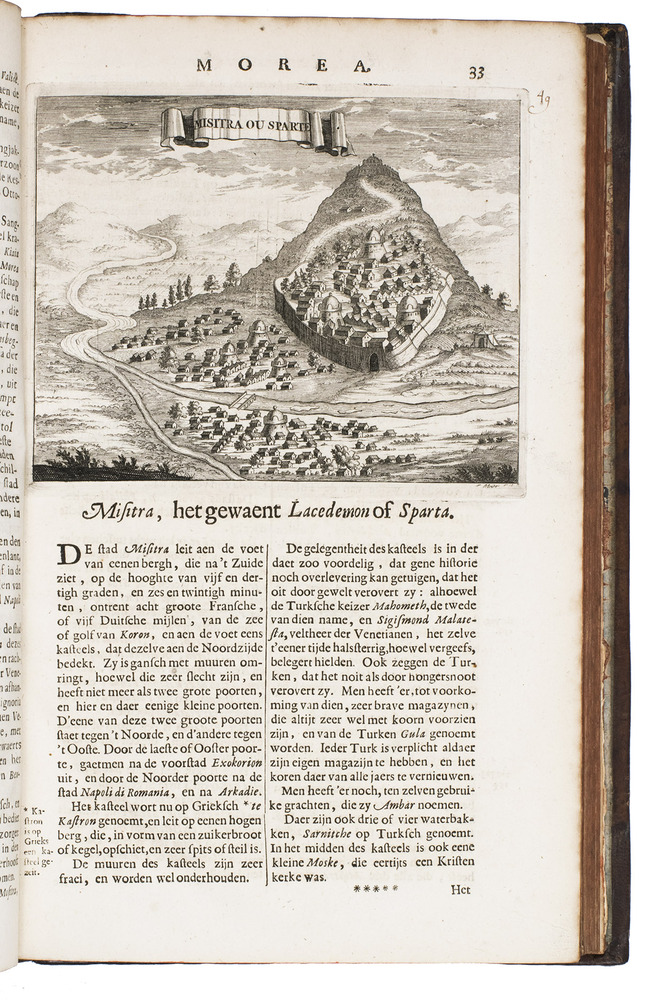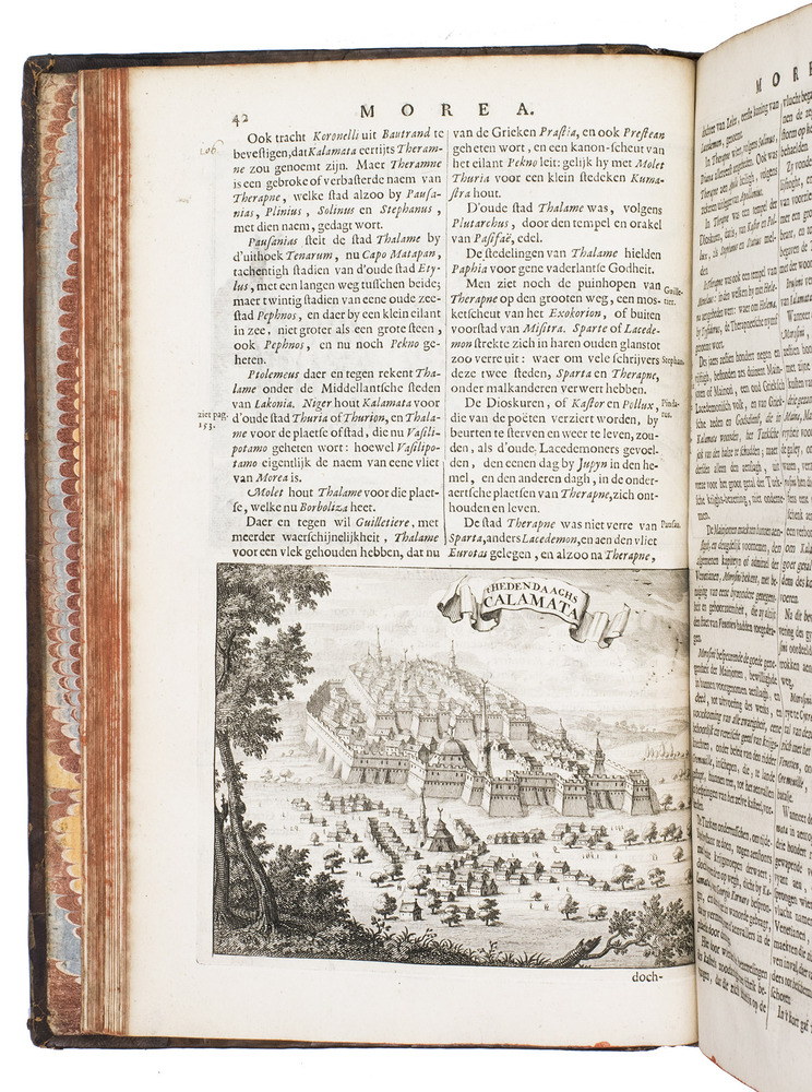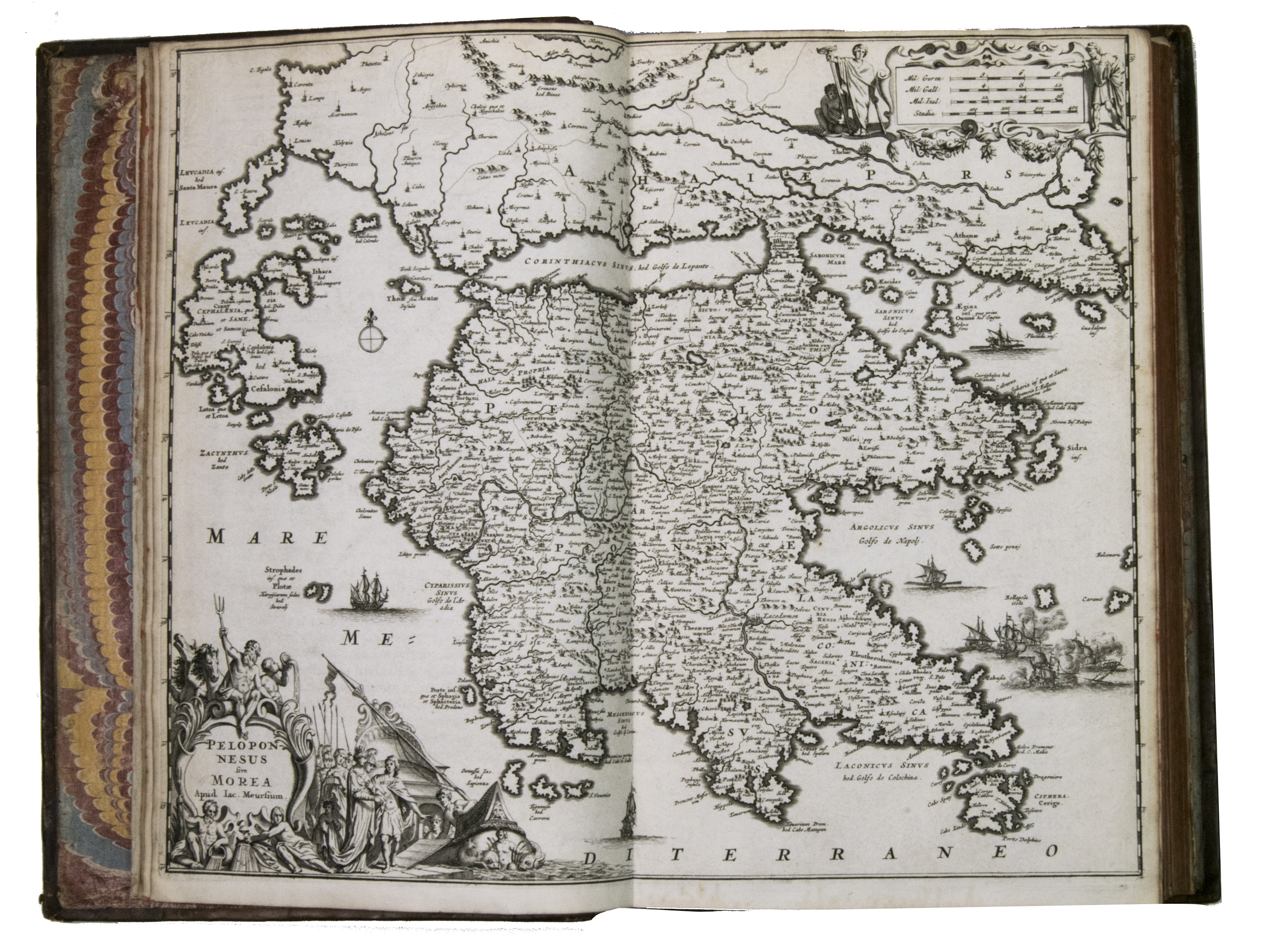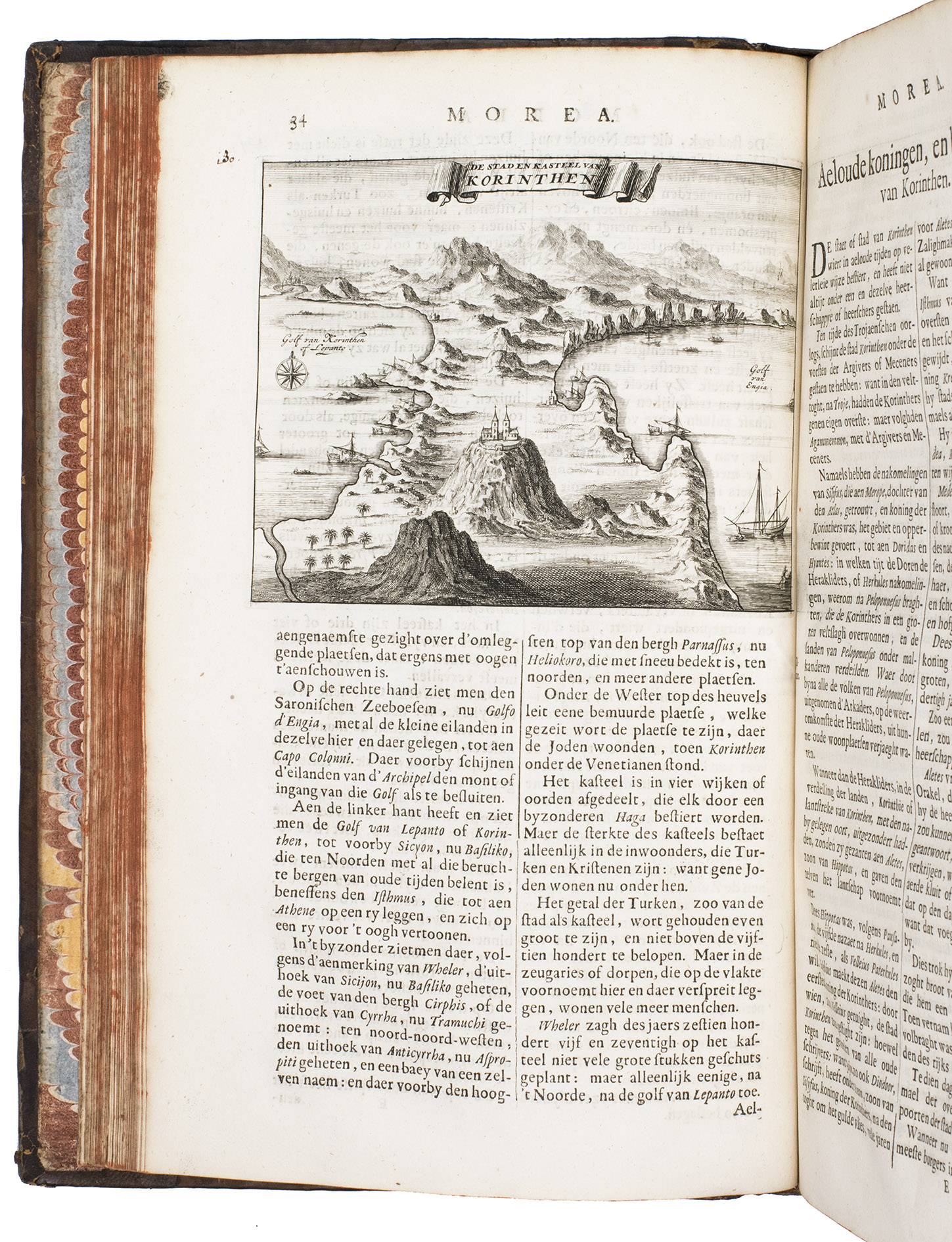 First and only edition of an important and richly illustrated work on the Peloponnese and the Adriatic Sea, with descriptions of Venice, the Dalmatian coast, and several of the major Greek Islands. The work is notable for its fine plates, after Vincenzo Maria Coronelli (1650-1718), Jacob van Meurs (ca. 1620-1679), Joan Blaeu (ca. 1598-1673) and others. It was probably published in response to the Morean War (1684-1699), the sixth conflict between the Republic of Venice and the Ottoman Empire, in which Venice took control of the Peloponnese peninsula (also known as Morea). The maps show various locations from this battle.