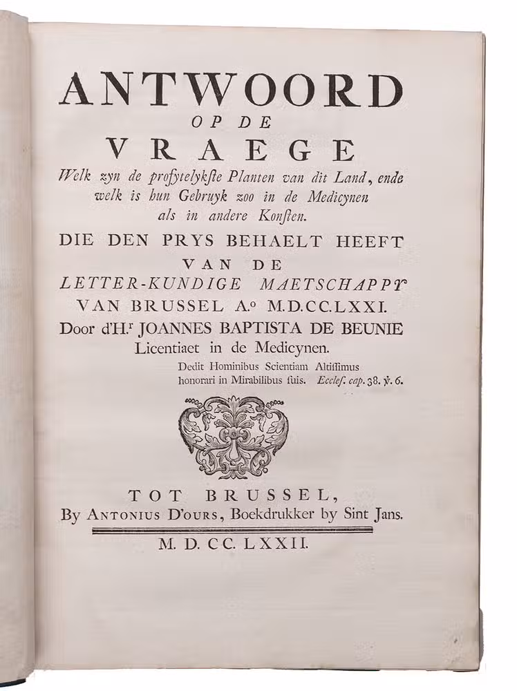 Three rare related treatises concerning the uses of certain plants. The two by the licentiate in medicine Joannes Baptista De Beunie are the winning answers to a competition of the Letterkundige Maatschappij van Brussel (Literary Society of Brussels) and treat the medical and other applications of plants from the Low Countries, especially the dyeing of cloth. Du Rondeau made some observations concerning the first question and treats the growing of Rhubarb, dyeing with fresh madder and tanning leather.