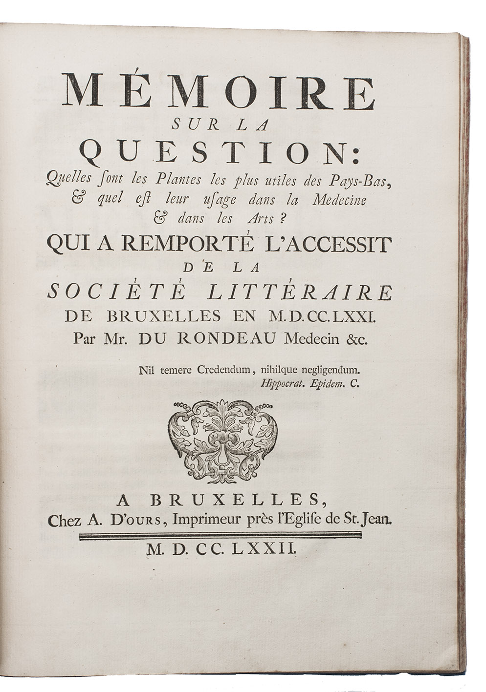 (2) DU RONDEAU, François. Mémoires sur la question: quelles sont les plantes les plus utiles des Pays-Bas, & que lest leur usage dans la medicine & dans les arts.