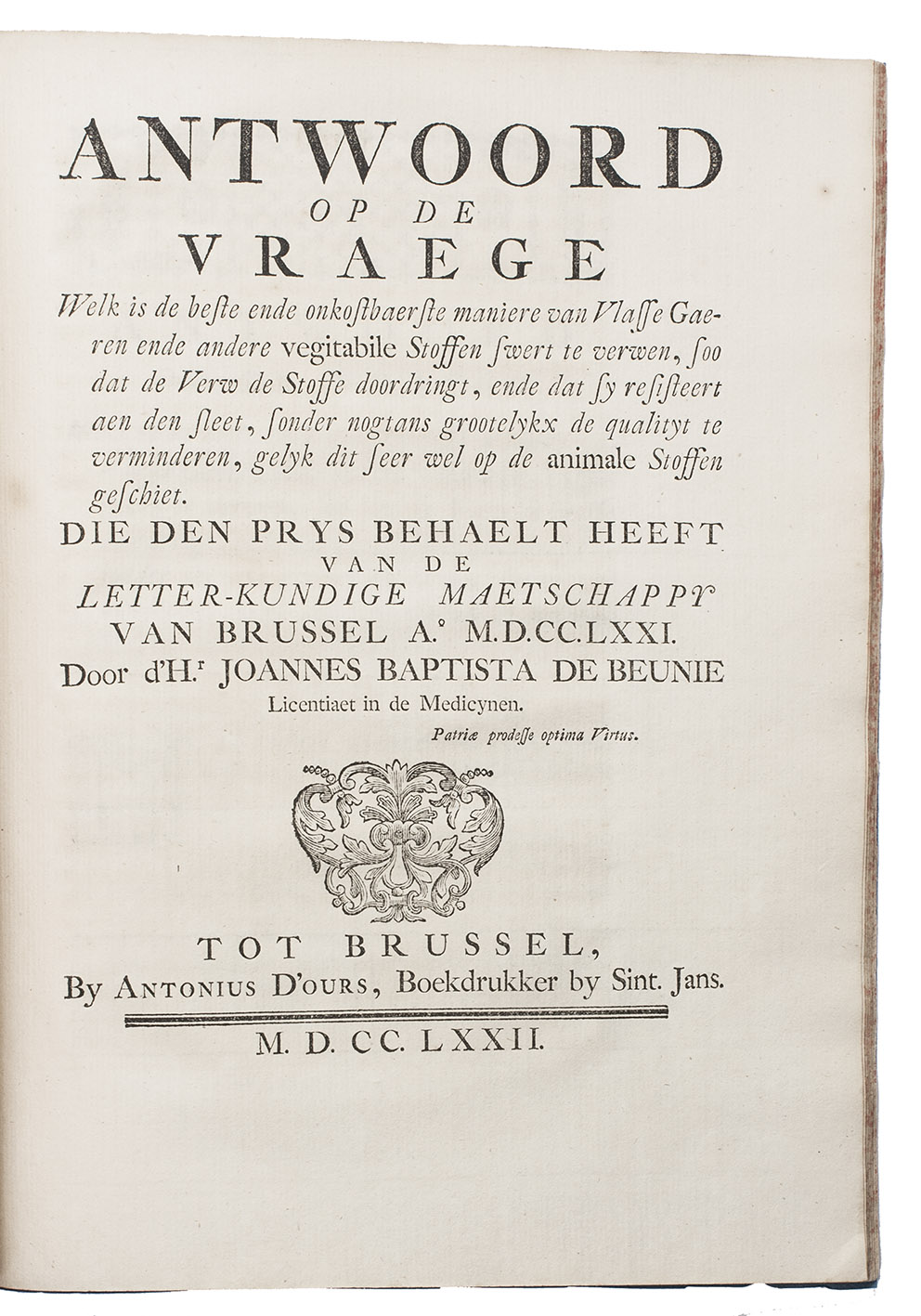 (3) DE BEUNIE, Joannes Baptista. Antwoord op de vraege welk is de beste ende onkostbaerste maniere van vlasse gaeren ende andere vegitabile stoffen swert te verwen, ...