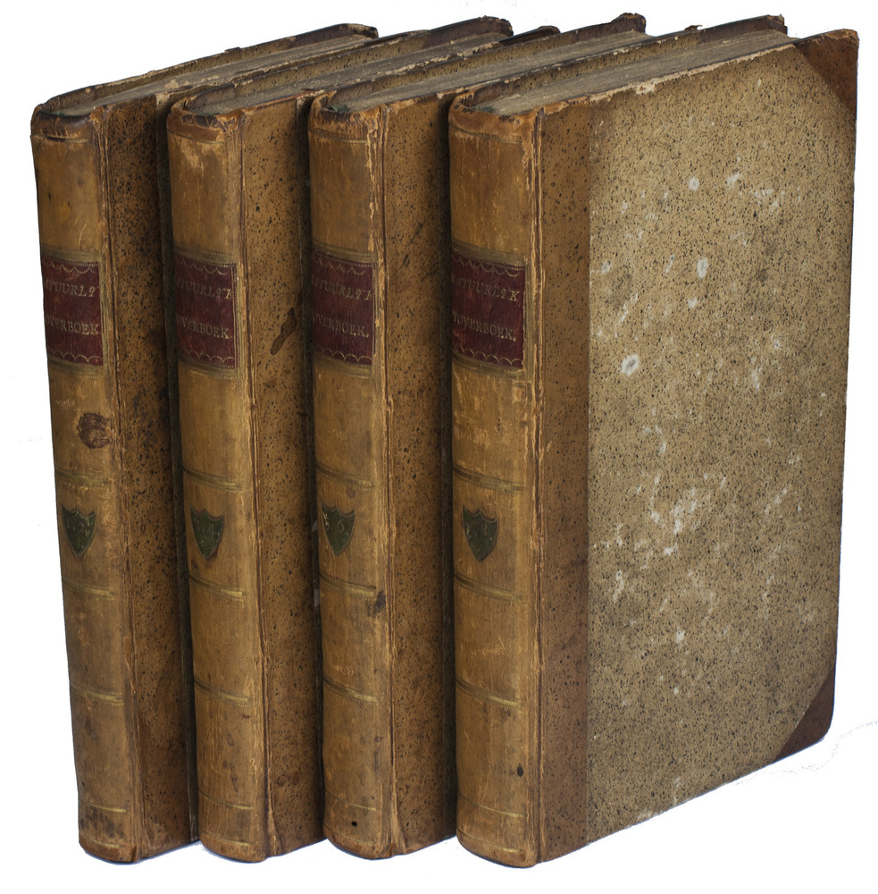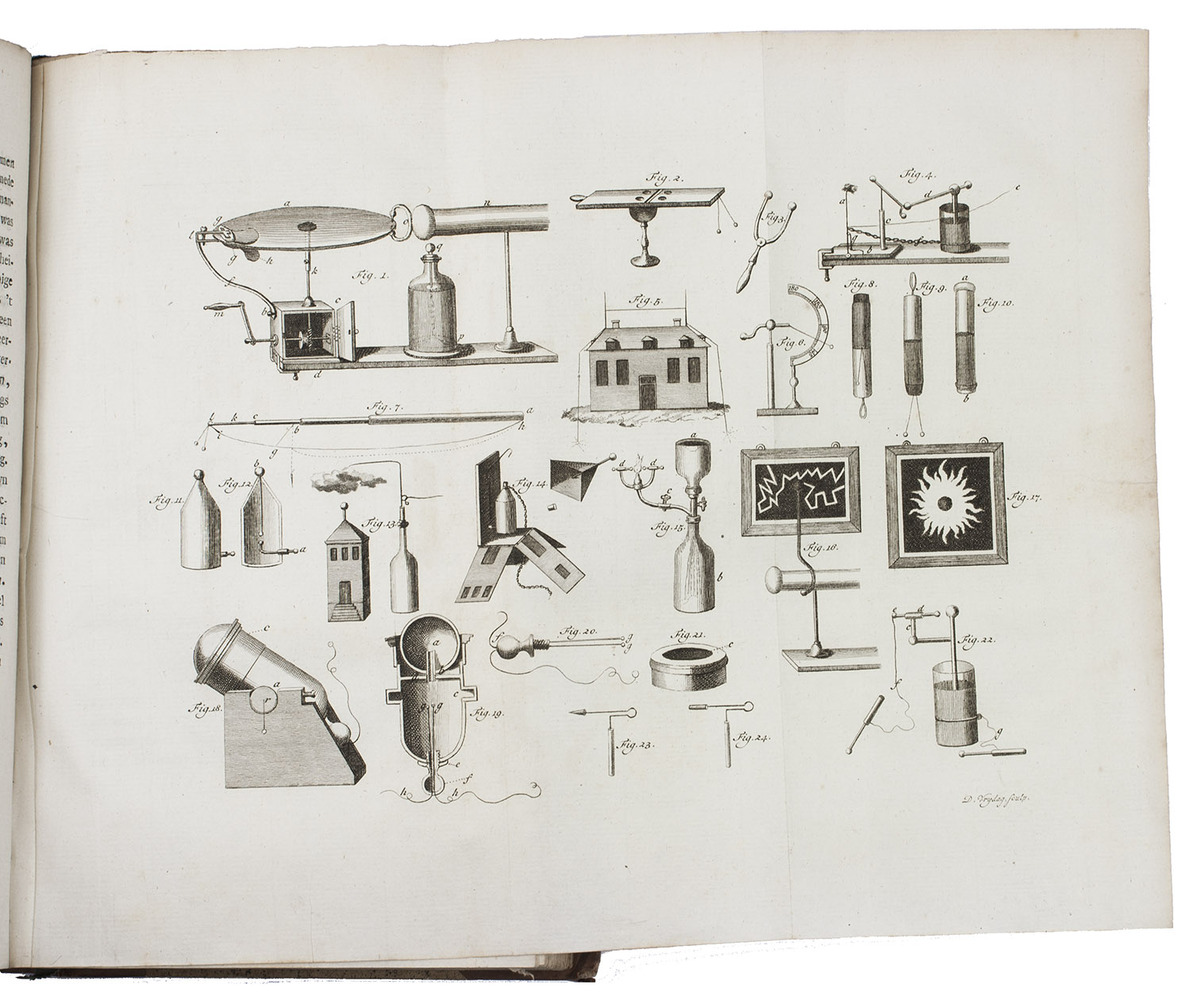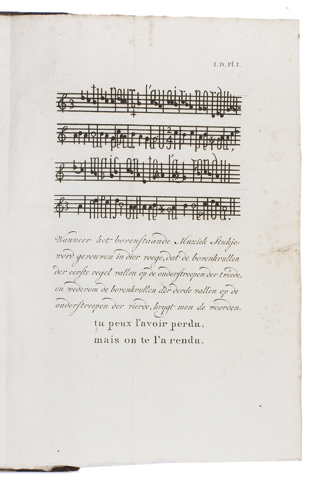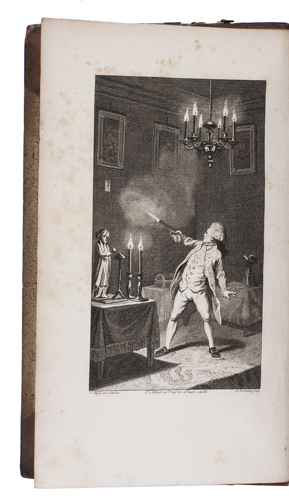 Amsterdam, Johannes Allart; Harlingen, Volkert van der Plaats, 1791-1794. 8 parts in 4 volumes. 8vo. With an engraved frontispiece by P.H. Jonxis after J. Buys in the first volume, and 12 engraved plates (including 9 folding), each depicting several figures and 1 including 4 lines of engraved music (round-headed notes on a 5-line staff). Contemporary half calf, gold-tooled spines. [2], 174 [1], [1 blank]; 104; [2], 159, [1]; 176; [2], 164; 123, [1 blank]; [2], 130; 243, [1 blank] pp.