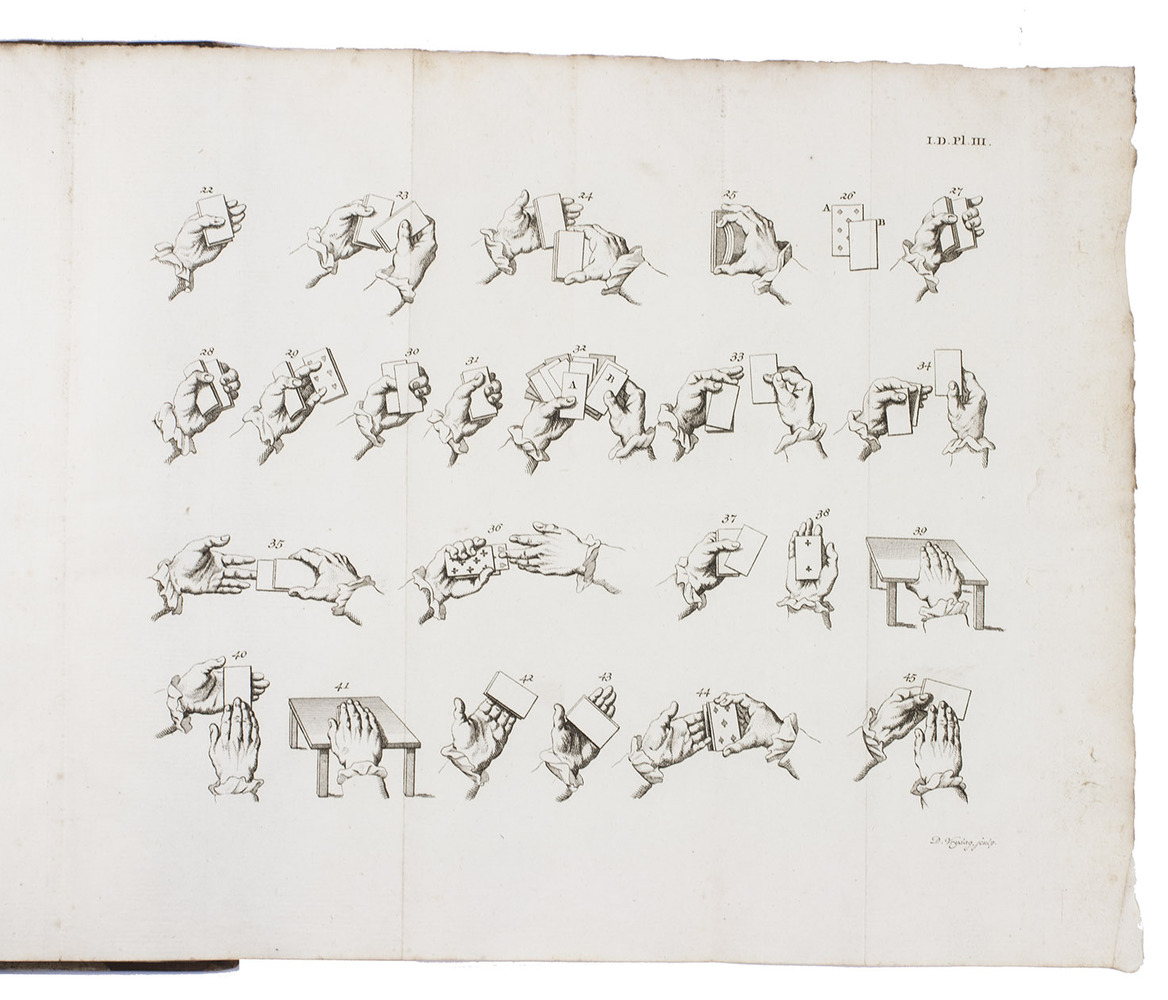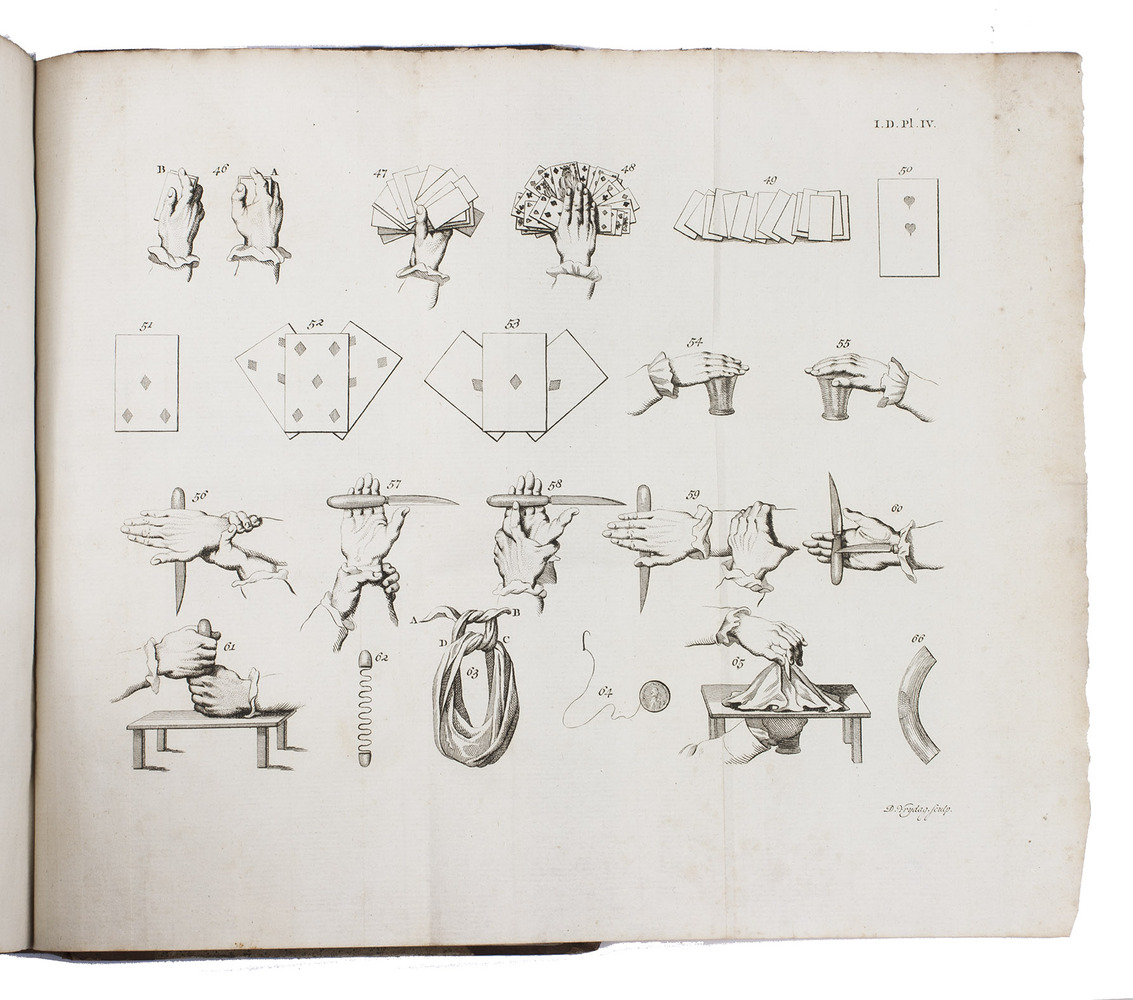 First edition of a Dutch encyclopedic textbook on the art of conjuring, anonymously published in 4 volumes over 4 years. The book contains information on "white magic", based on many earlier published works of that time, describing and explaining numerous conjuring tricks with ropes, knives, watches, playing cards, etc, most of them clarified in the illustrations. Also explained are various disappearing tricks, mind reading, chemical tricks, number and word tricks, secret alphabets, etc. The author gives 13 basic rules for performing magicians, which derive from the Testament de Jerome Sharp, which was included in Henri Decremps's La magie blanche dévoilée.