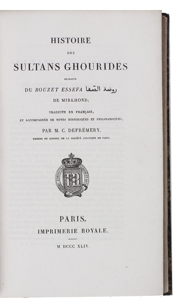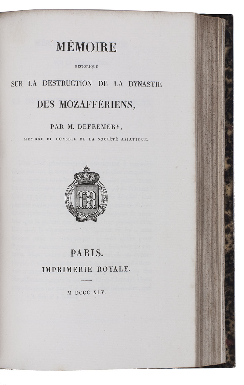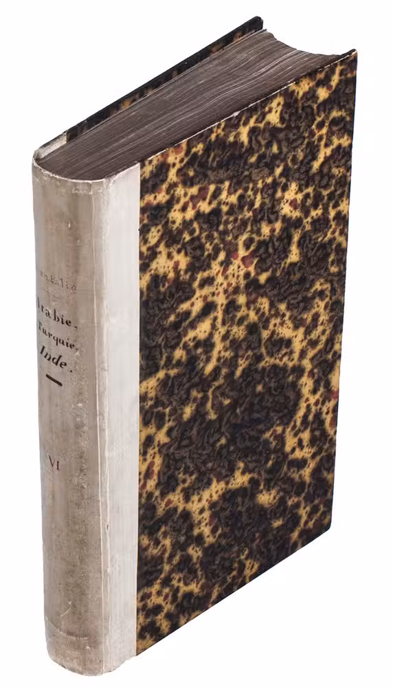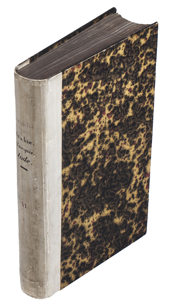 With a manuscript index to the articles. A couple leaves slightly browned and a small tear in the title-page of the third article, otherwise in very good condition. Binding very good as well. Cf. Irwin, For lust of knowing, p. 148; for Defrémery: Cooper, Men of the time (1884), pp. 330.