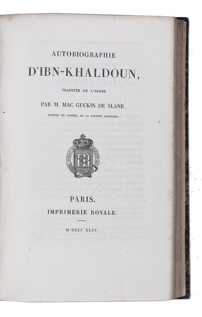 Collection of 11 French offprints and extracts of articles concerning the history of the Islamic world, all by notable orientalists, covering diverse topics such as the architecture of the Arabs and Moors, the astronomy of the Chaldeans, the Hindustani language, the Persian chronicle Mojmal al-tawarikh, the Ghurid dynasty, the kings of Achlath and Mardin (modern day Turkey), the Persian Mozaffarid dynasty, the Persian Sultan Barkiarocq, and India, but also including the autobiography of the famous Arab historiographer and historian Ibn Khaldun.