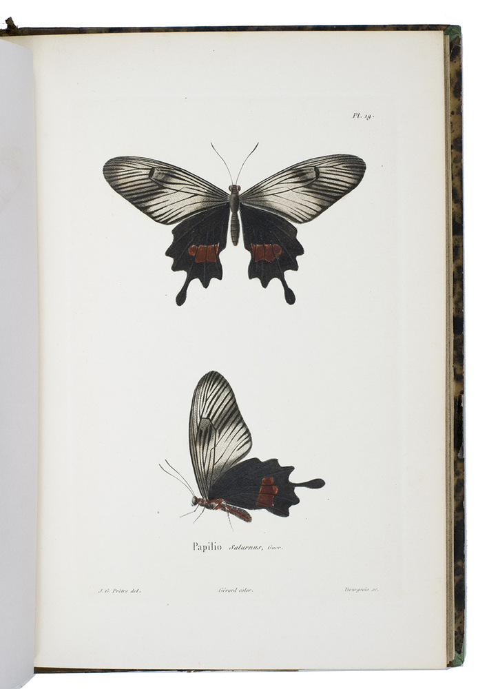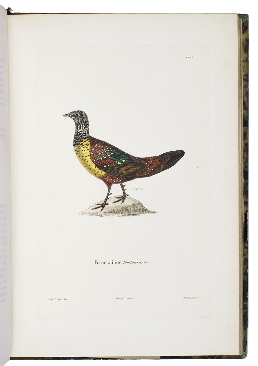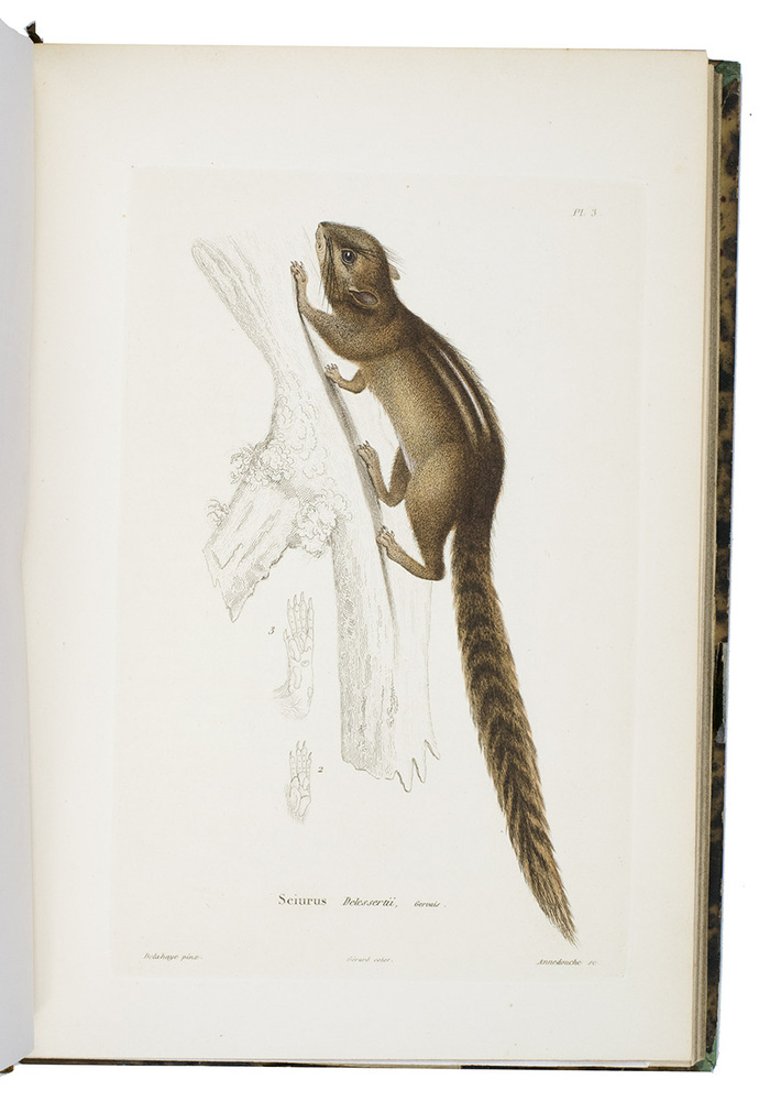 Paris, Fortin, Masson et Cie & Langlois et Leclercq (facing title-page: printed by Béthune et Plon), 1843. 2 parts in 1 volume. Large 8vo. With engraved title-vignette signed by A. Vien, 8 lithographed plates in the first part by V. Dolet showing Ile Bourbon, Pondichéry, Malacca, Chase au tigre, Madras, a bivouac and Chûte de la Rivière de Gutpurba; 27 numbered full-page engraved plates in the natural history part by Forget, Annedouche, Sebin, Mme. Douliot, Bourgeois, Giraud, Davesne and Dumesnil after Jean Gabriel Prêtre, Delahaye, Mme Bury and Vaillant of mammals, birds, insects and butterflies, 24 of which are exquisitely coloured by hand by "Gérard". Also with one folded map (43 x 44 cm) of the world (except for the Americas) with Delessets journey marked, coloured in outline and printed by Kaeppelin, Paris. Half calf, decorated paper sides. [6], III, 134; [4], 107 pp.