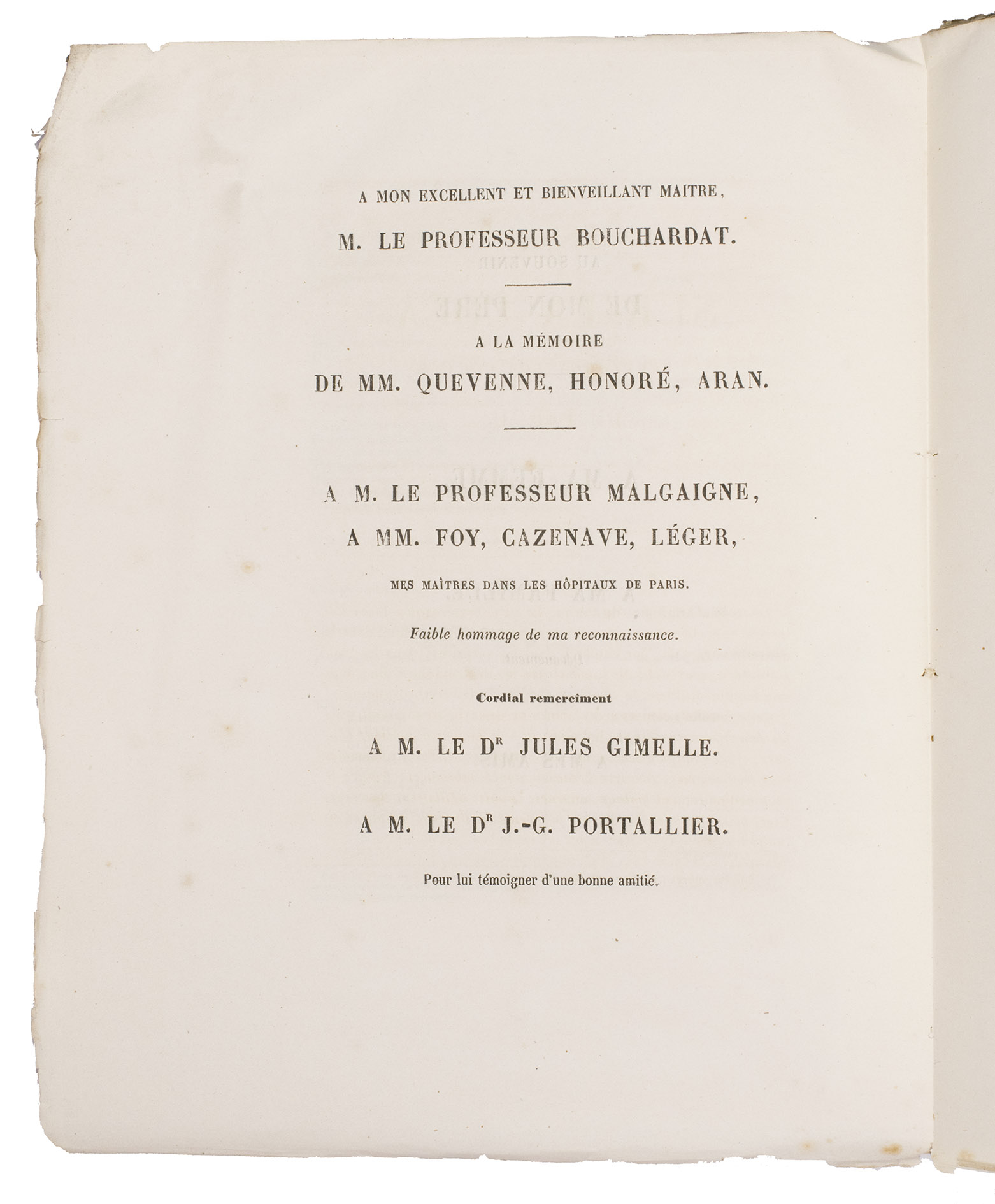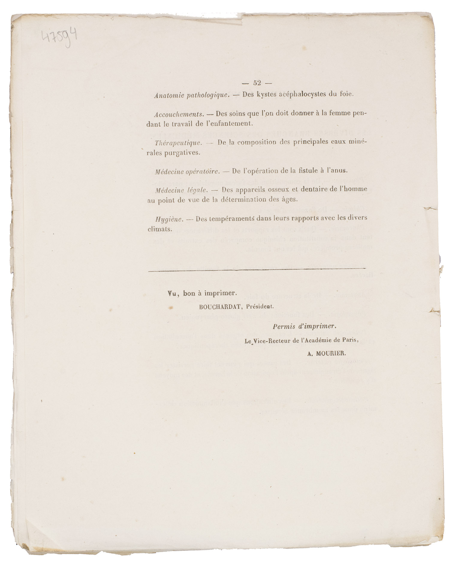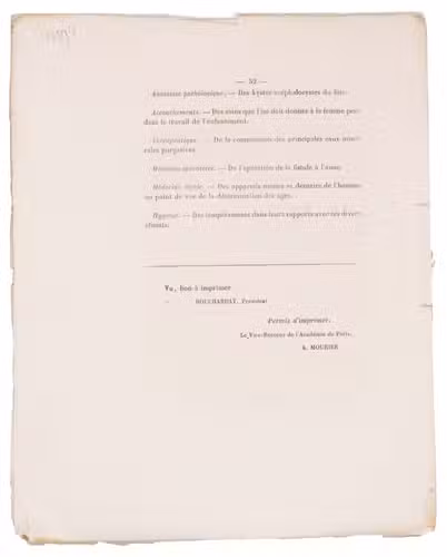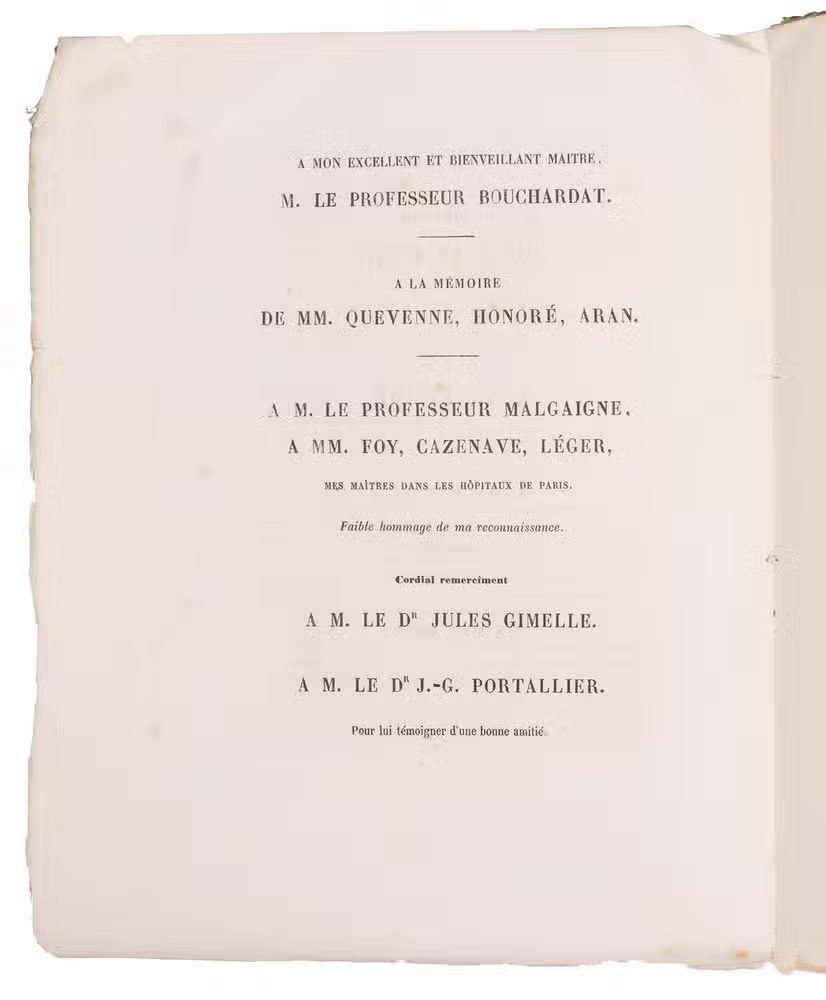Paris, Rignoux, imprimeur de la faculté de médicine, 1862. 4to. Side stitched through two holes. 52 pp.