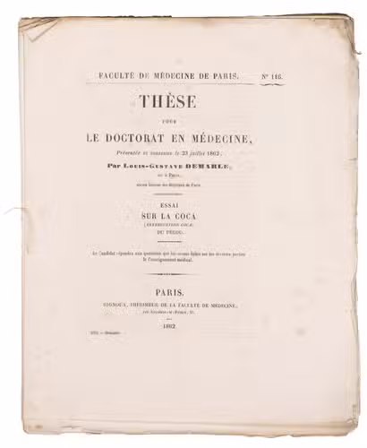 In the 19th century, the medicinal use of coca was already well-recognised. Chemist Friedrich Gaedcke (1828-1890) was the first to isolate the cocaine alkaloid in 1855, which he called erythroxylin, from the leaves. Albert Niemann (1834-1861) then developed an improved purification process for this alkaloid in 1859. From then, academic interest in the plant skyrocketed. Demarle's thesis was published just a few years after the accomplishments of Gaedcke and Niemann. It discusses the properties of the plant and gives an overview of the most recent research on the medicinal properties of coca. Interestingly, Demarle mentions experimenting with adding coca extract to wine. A year later, in 1863, Corsican chemist Angelo Mariani (1838-1914) also added coca extract to wine and sold it to the general public. This coca wine, vin Mariani, became an immense commercial success and is seen as the ancestor of Coca-Cola.