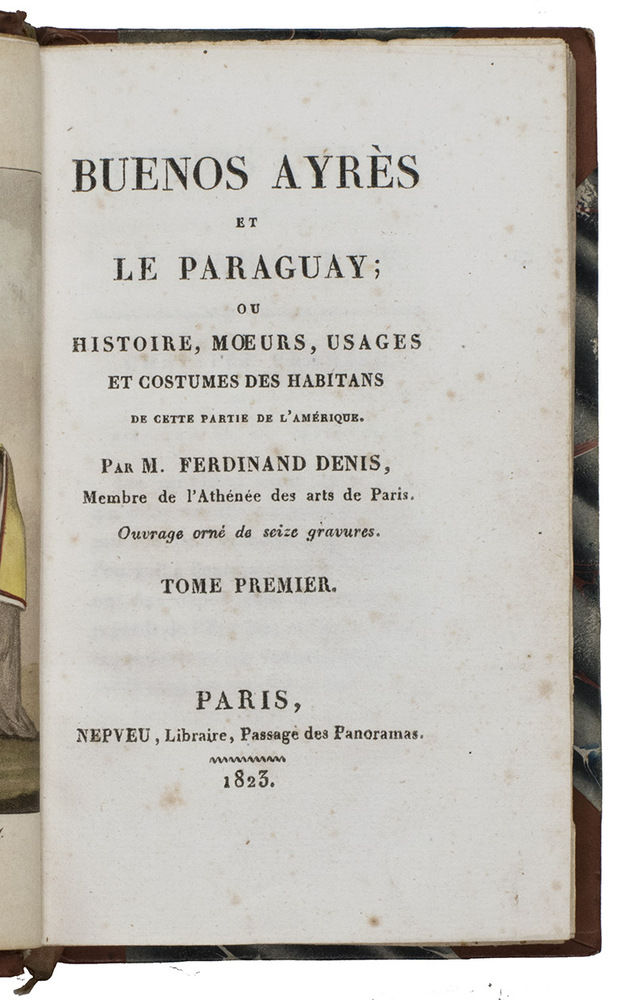 Rare first edition of this nicely illustrated work on the history, customs, traditions and costumes of Buenos Aires and Paraguay. Ferdinand Denis (1798-1890) was a French consul who decided to seek his fortune in South America. He left Le Havre in 1816, traveled for several years through, amongst others, Brasil, Argentina, Paraguay and Chile, but was just as poor when he returned to France in 1819. In the years that followed he wrote many books on his experiences in South America, the present work being one the more rare ones today.