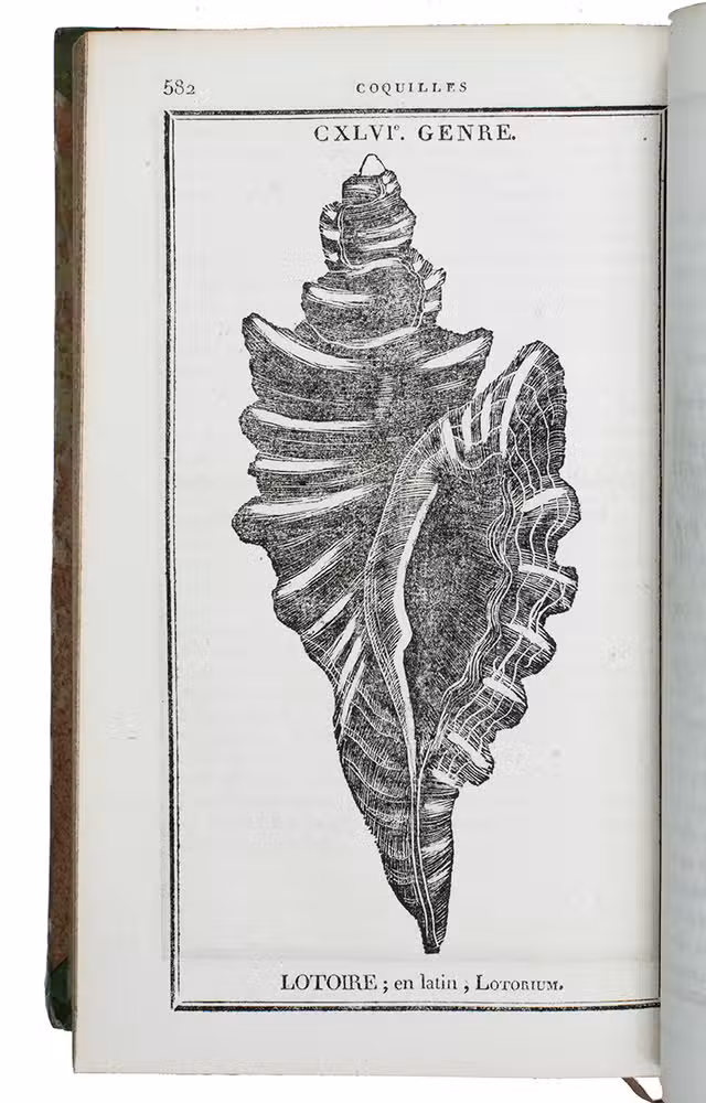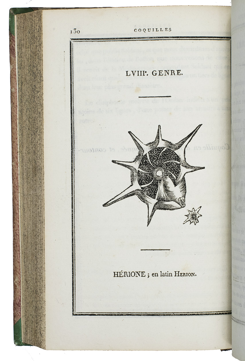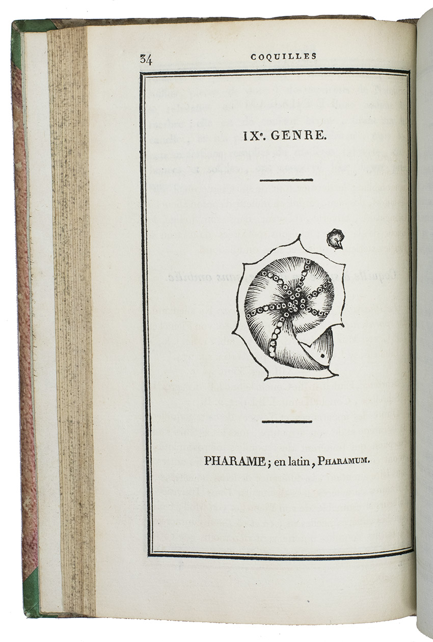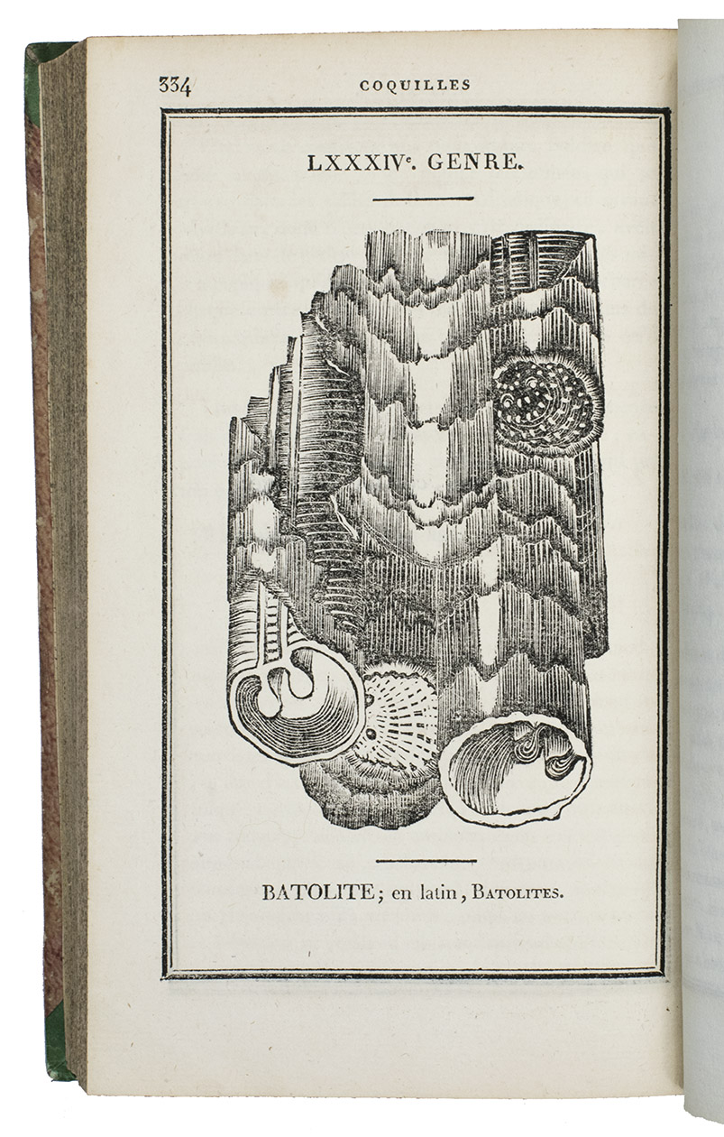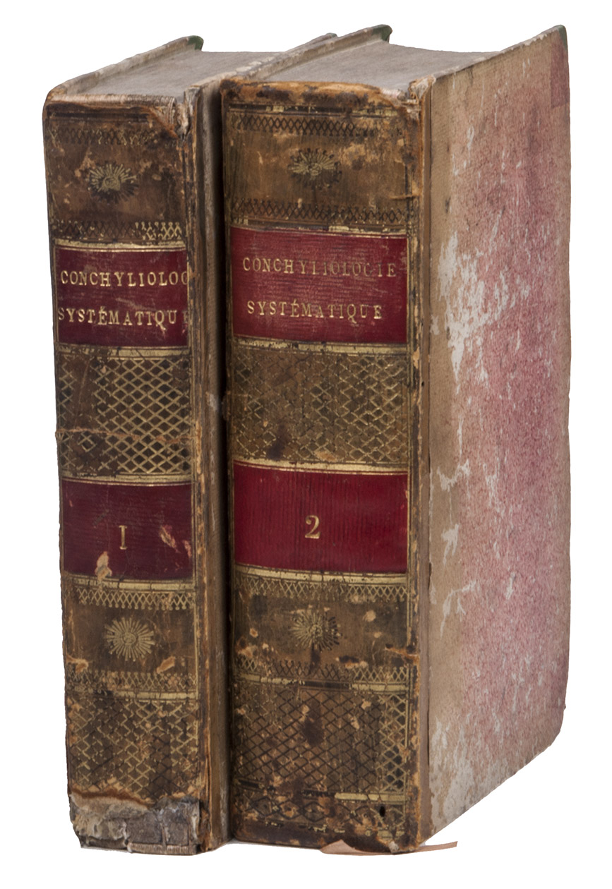Paris, F. Schoell, 1808-1810. 2 volumes. 8vo. With 261 woodcut illustrations of shells (most nearly full-page). Contemporary half calf, gold-tooled spine, red ribbon marker. LXXXVII, [1], 409, [1]; [4], 676 pp.