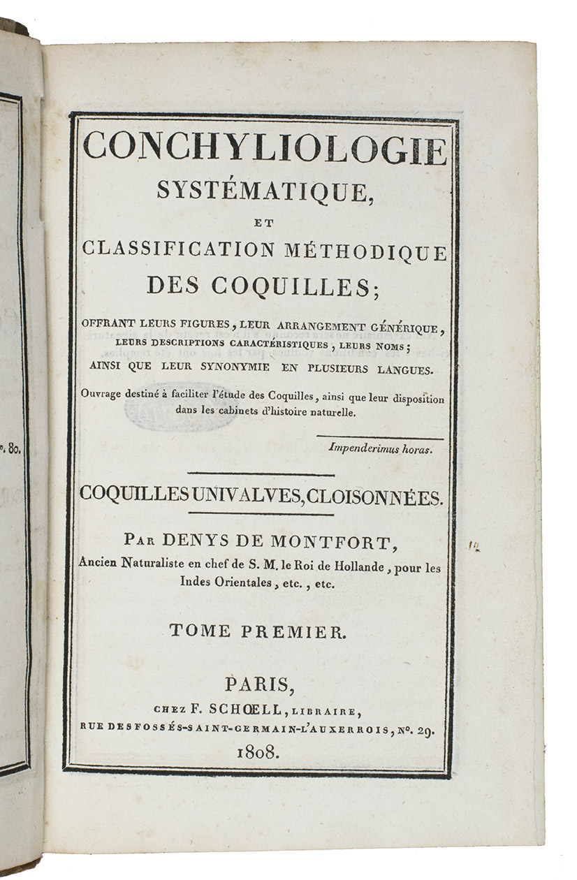 Scarce work with interesting and well-executed plates, drawn and engraved by the author himself, the French naturalist Pierre Denys de Montfort (1766-1820). With this work the author wanted to ease ''the study of shells and their arrangement in the cabinet'' (Junk). A third volume, covering the Dissivalves, Multivalves and Bivalves, was planned but never published.