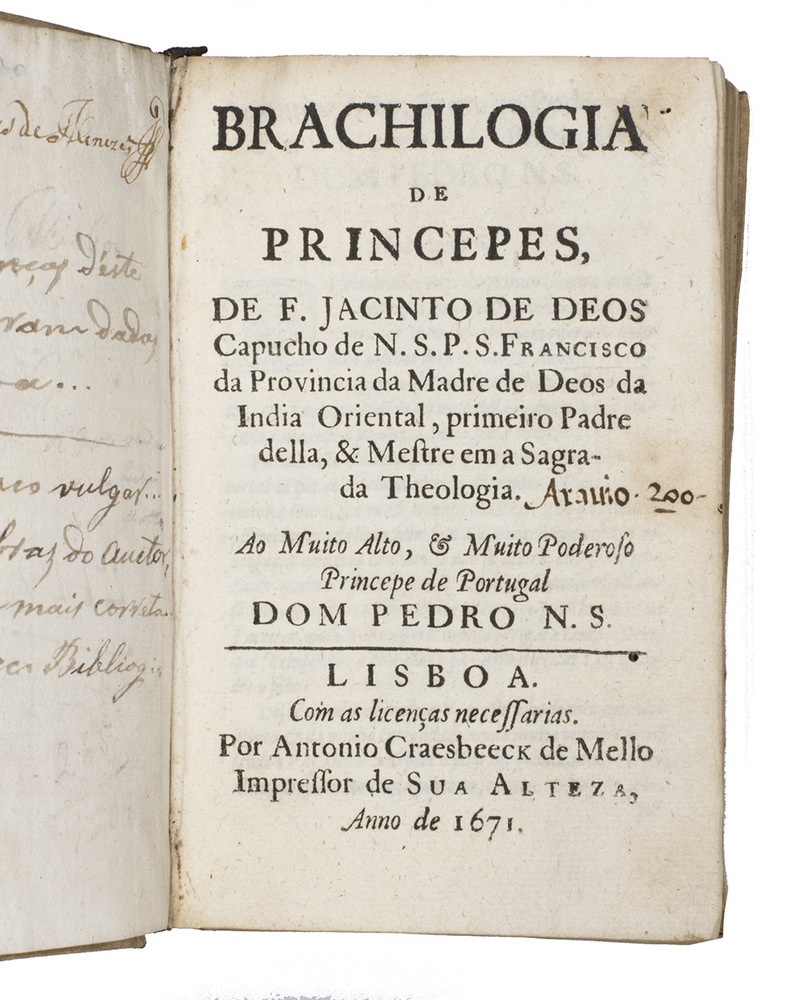 Rare first (and until 1946 only) edition of a concise account of the qualities needed to be a good ruler and the best Christian manner of educating people to be rulers, by Jacinto de Deos or Deus (Macau 1612-Goa 1681), a Capuchin Franciscan missionary in Goa under Portuguese rule, dedicated to the Prince Regent and future King Dom Pedro II (1648-1706) of Portugal. Dom Pedro was 22 when De Deos published it, though he had already been de facto head of state for three years. It was no doubt intended both for him and for the future education of his daughter and heir, then two years old, but in the event she died before him. The fact that De Deos was a Franciscan in Asia gives the book special significance for its insights into his attitudes, for the Jesuits largely dominated the literature on missionary work in Asia. We know less about the Franciscans, though they claimed priority over the Jesuits in most regions.
