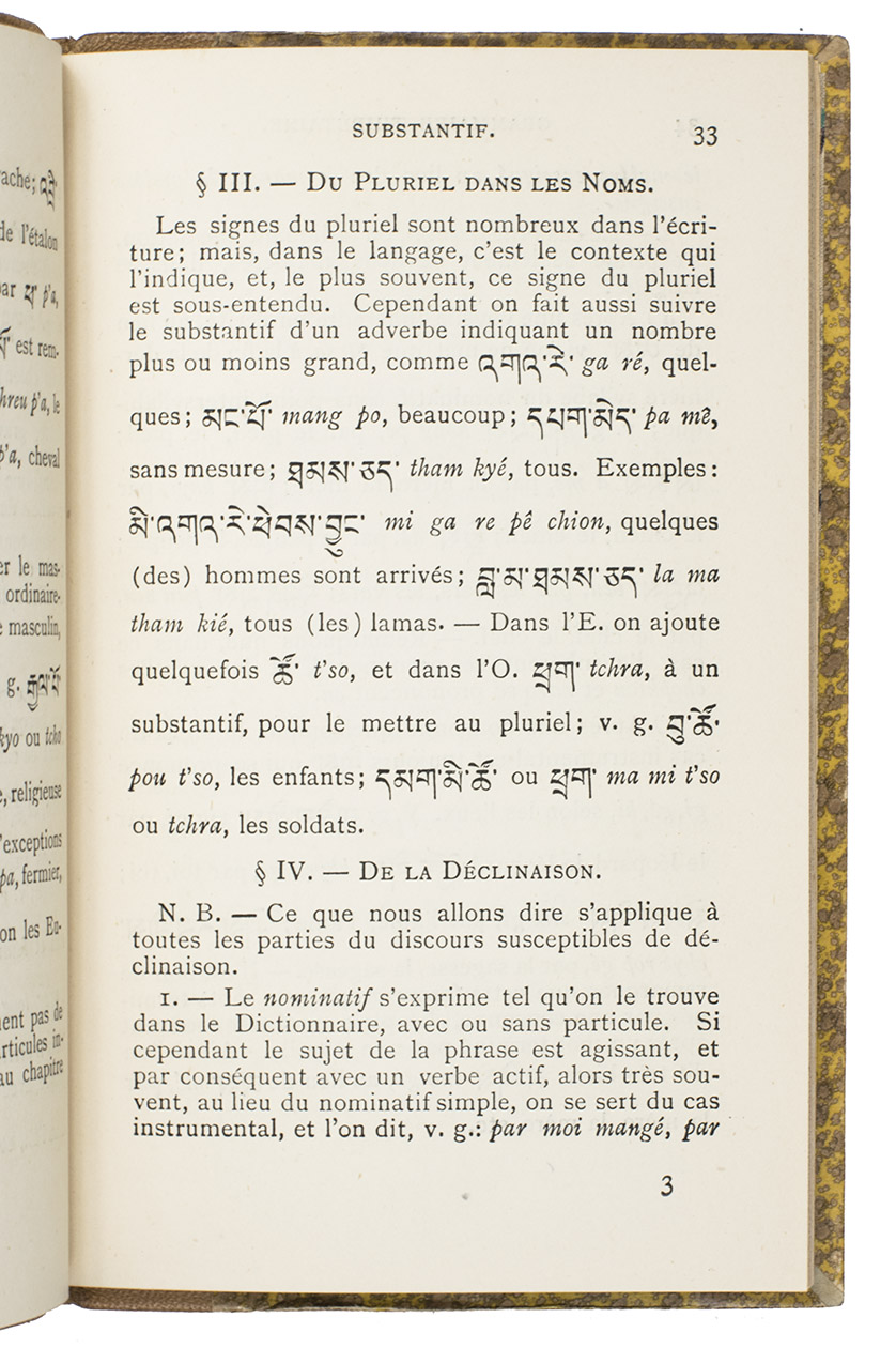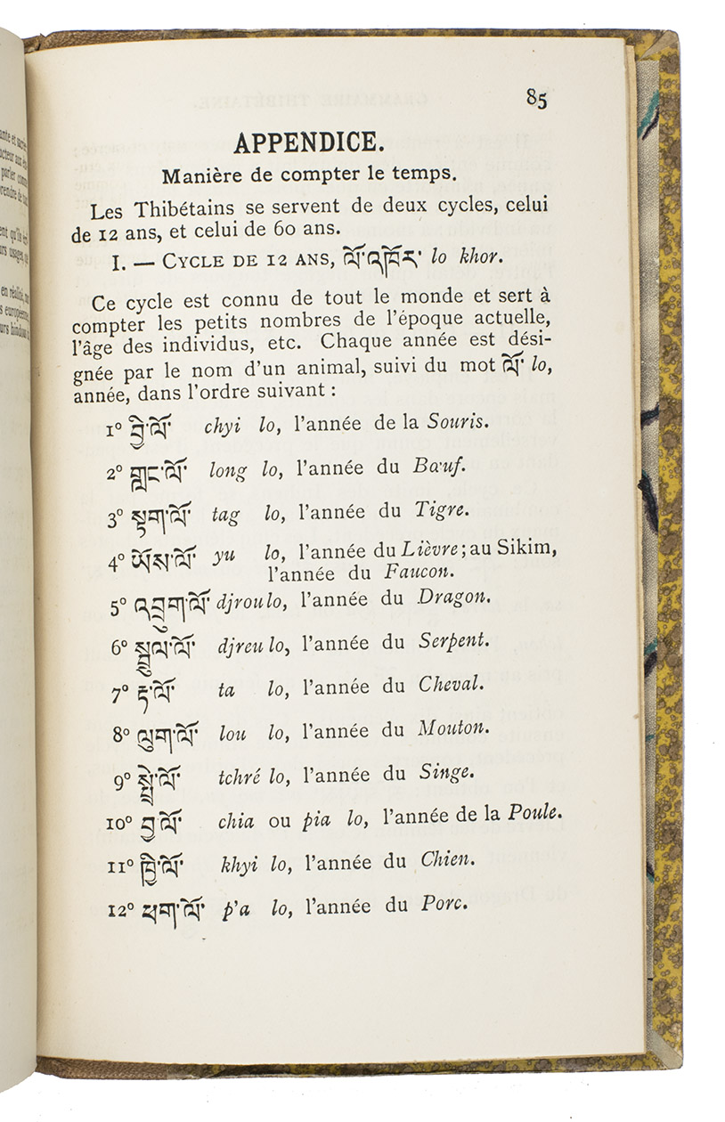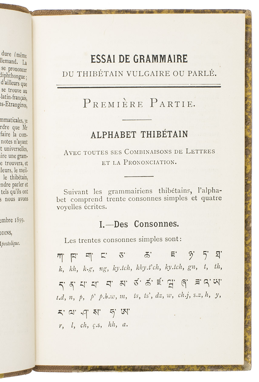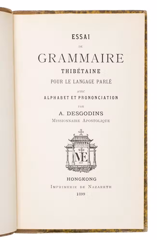 Hongkong, Imprimerie de Nazareth, 1899. 12mo. With the printing offices device (an Asian style temple with "Nazareth", "venite seorsum" and an "ME" monogram with cross) on the title page and several tailpieces. Original publishers half tan morocco, with "GRAMMAIRE|THIBÉTAINE" in gold in the 2nd compartment and the printer-publishers "ME" monogram with cross at the foot of the fifth, "Gustav"-marbled sides (tan on yellow), decorated endpapers, sprinkled edges. [9], 91, [1] pp.