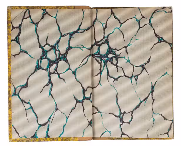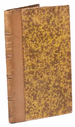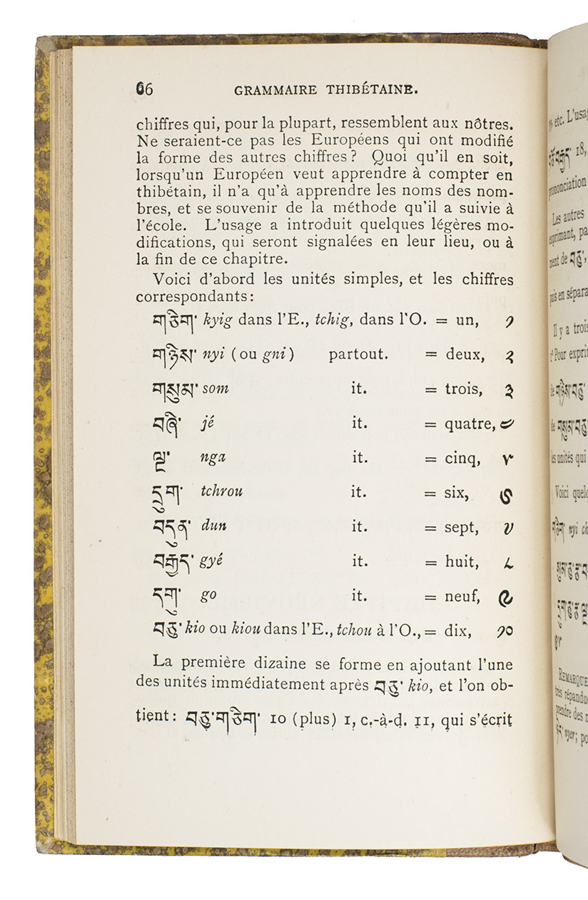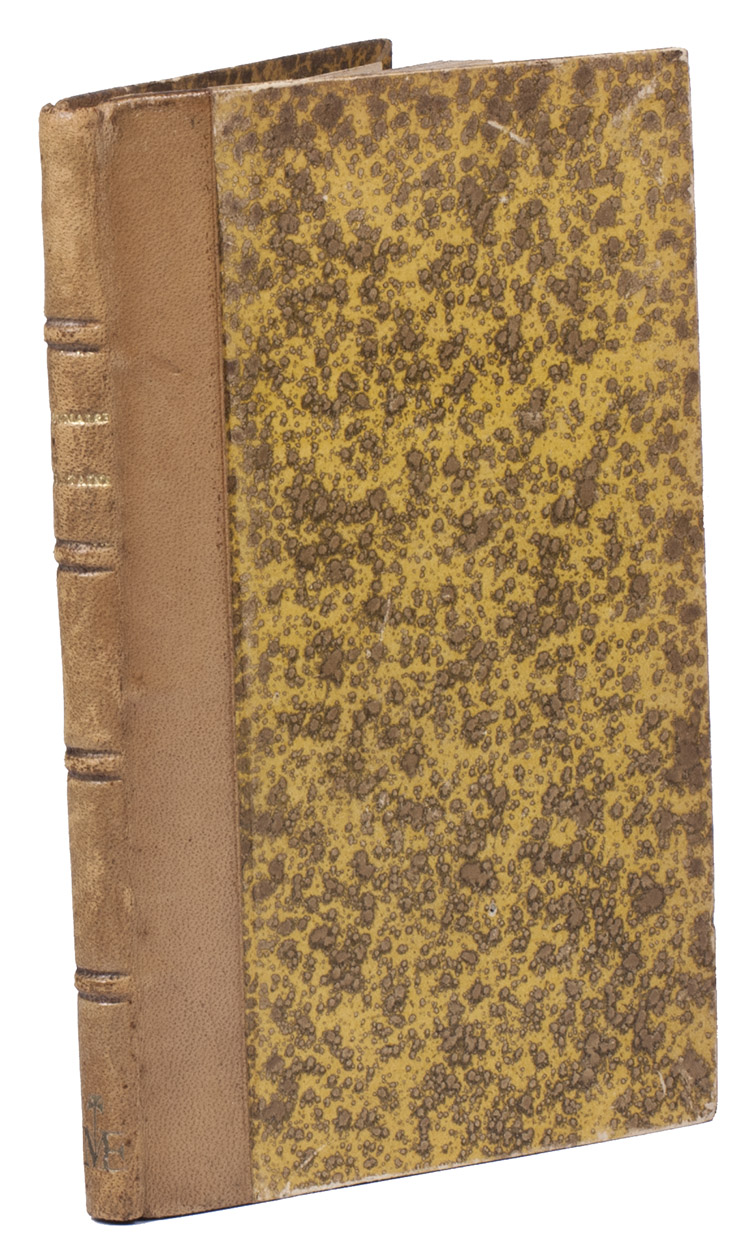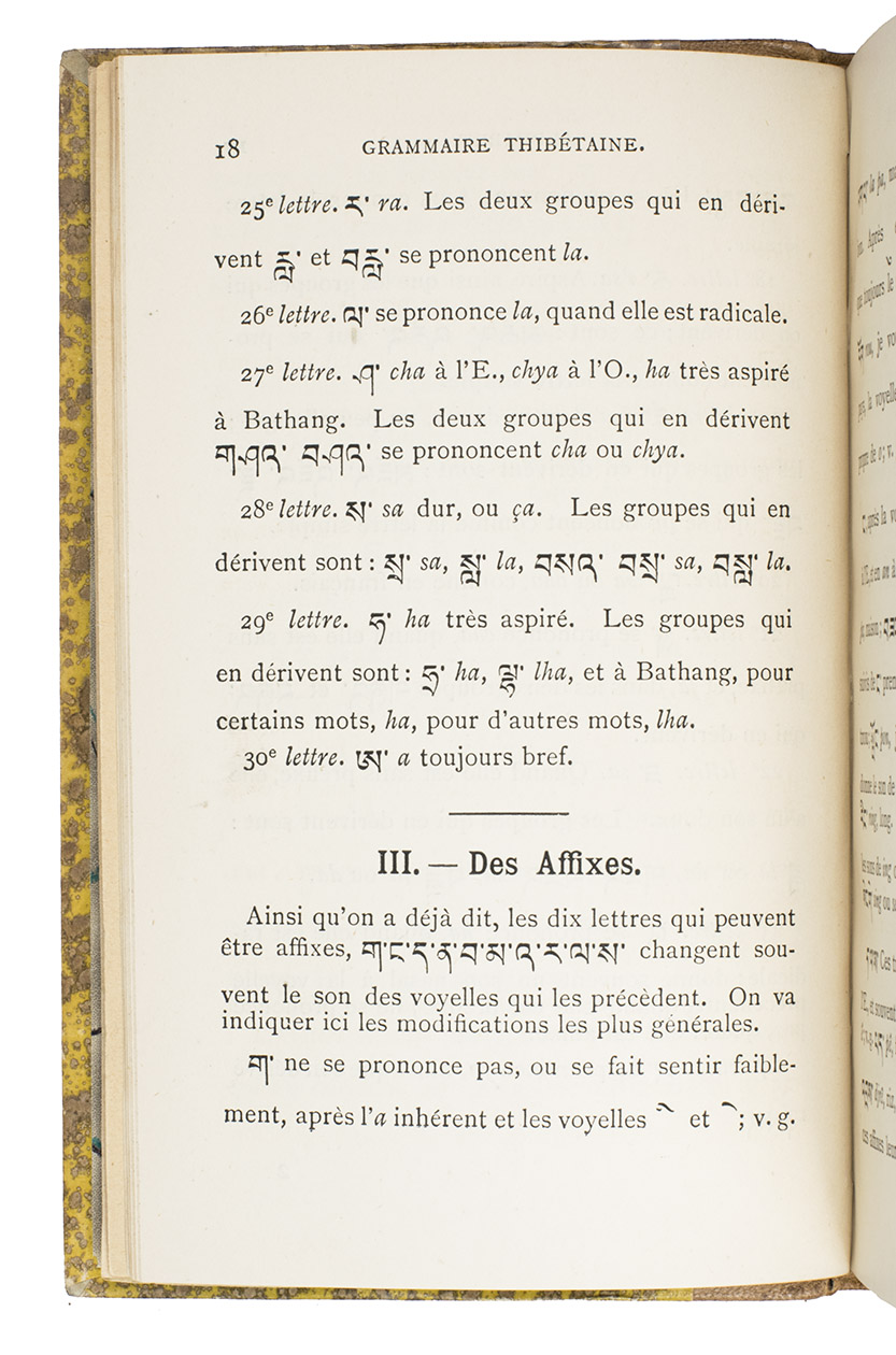 Hongkong, Imprimerie de Nazareth, 1899. 12mo. With the printing offices device (an Asian style temple with "Nazareth", "venite seorsum" and an "ME" monogram with cross) on the title page and several tailpieces. Original publishers half tan morocco, with "GRAMMAIRE|THIBÉTAINE" in gold in the 2nd compartment and the printer-publishers "ME" monogram with cross at the foot of the fifth, "Gustav"-marbled sides (tan on yellow), decorated endpapers, sprinkled edges. [9], 91, [1] pp.