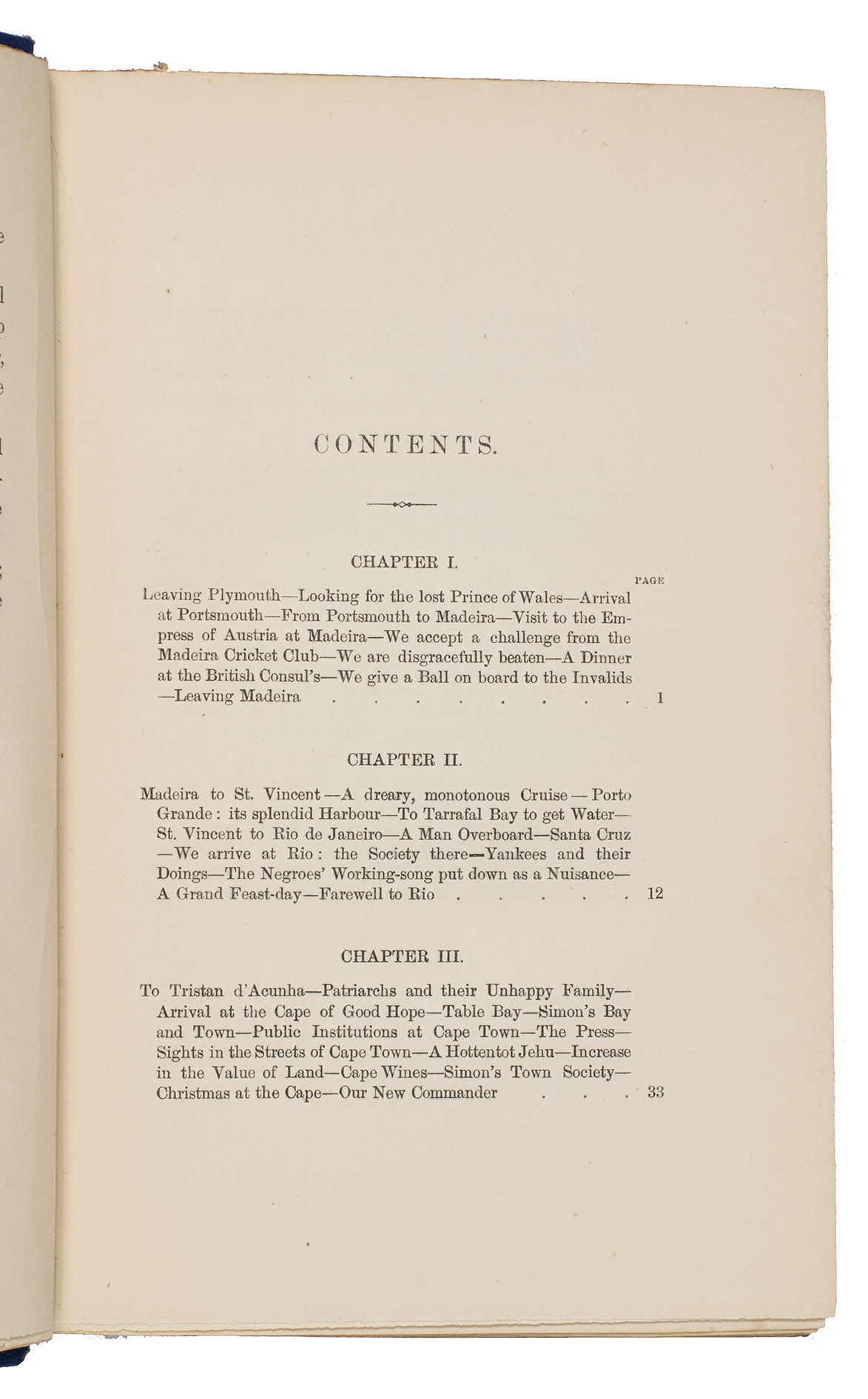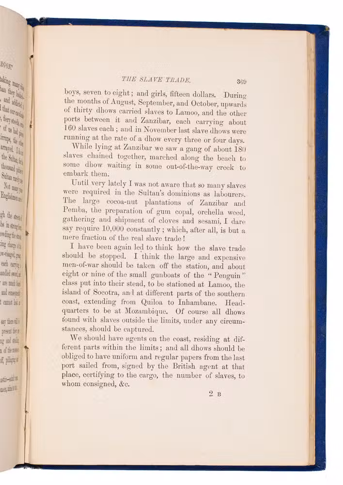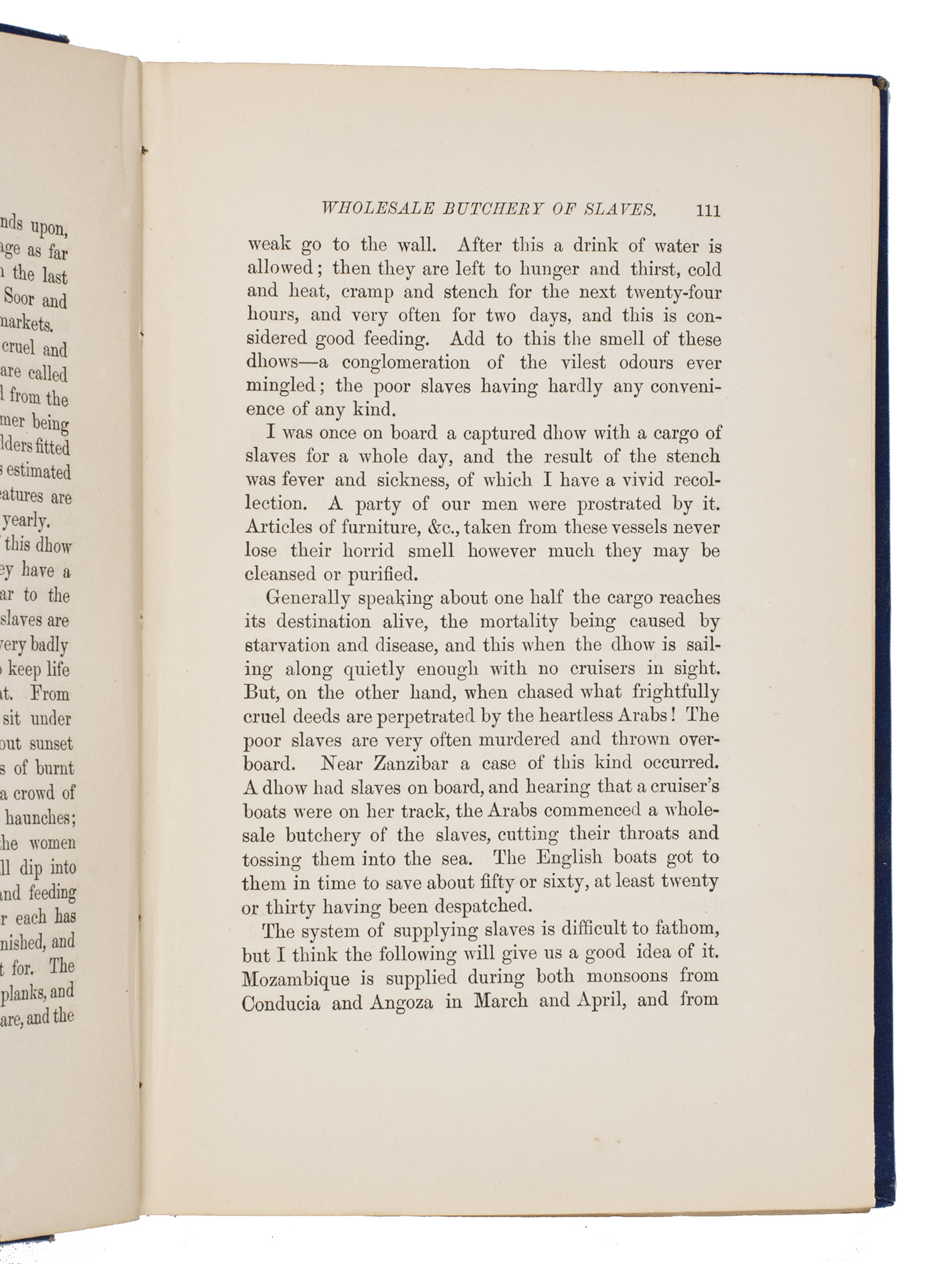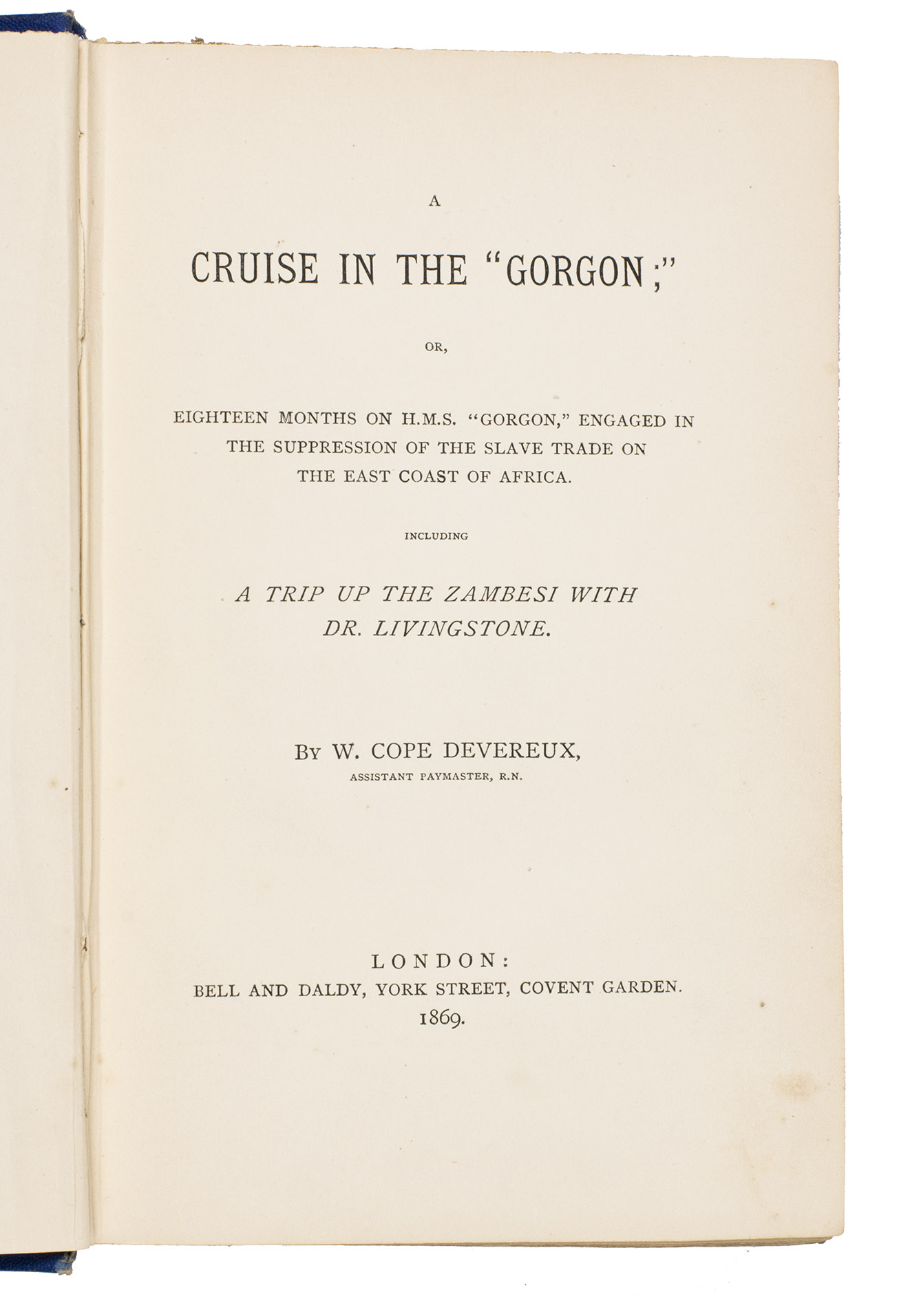 First edition in its original binding; a scarce and desirable work. "The Gorgon was a paddle-wheel sloop dispatched to the east coast of Africa to stop the illegal slave trade in the region. The vessel made its way up the Zambesi to meet the famous missionary explorer David Livingstone" (Czech). In doing so, it so happened that the sailors aboard the Gorgon bore witness to many major political players and forces along the Eastern coast of Africa: David Livingstone (1813-73) breakfasts aboard the Gorgon in the midst of his infamous Zambezi Expedition; the first Sultan of Zanzibar Majid bin Said (1834-70) demands a gun salute from the British; the exiled cousin of the Sultan of Anjouan is encountered attempting to maneuver his way back home.