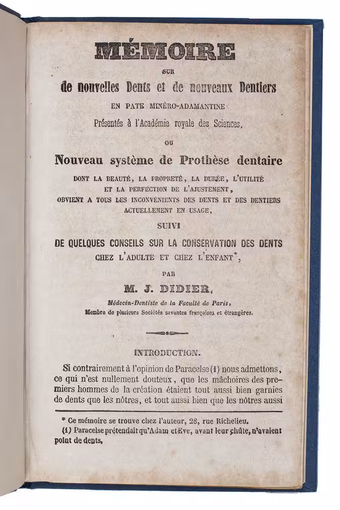 Mémoire sur de nouvelles dents et de nouveaux dentiers en pate minéro-adamantine, présentés à l'Académie Royale des Sciences, ou Nouveau système de prothèse dentaire dont la beauté, la propreté, la durée, l'utilité et la perfection de l'ajustement, obvient à tous les inconvénients des dents et des dentiers actuellement en usage, suivi de quelques conseils sur la conservation des dents chez l'adulte et chez l'enfant.