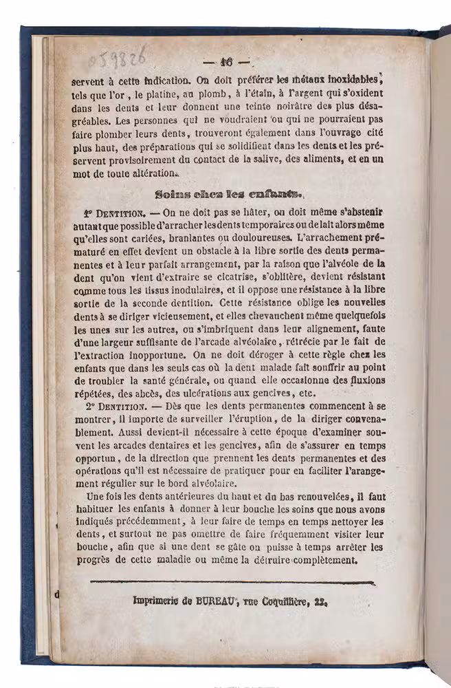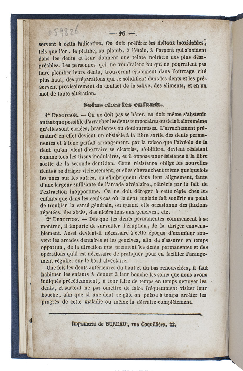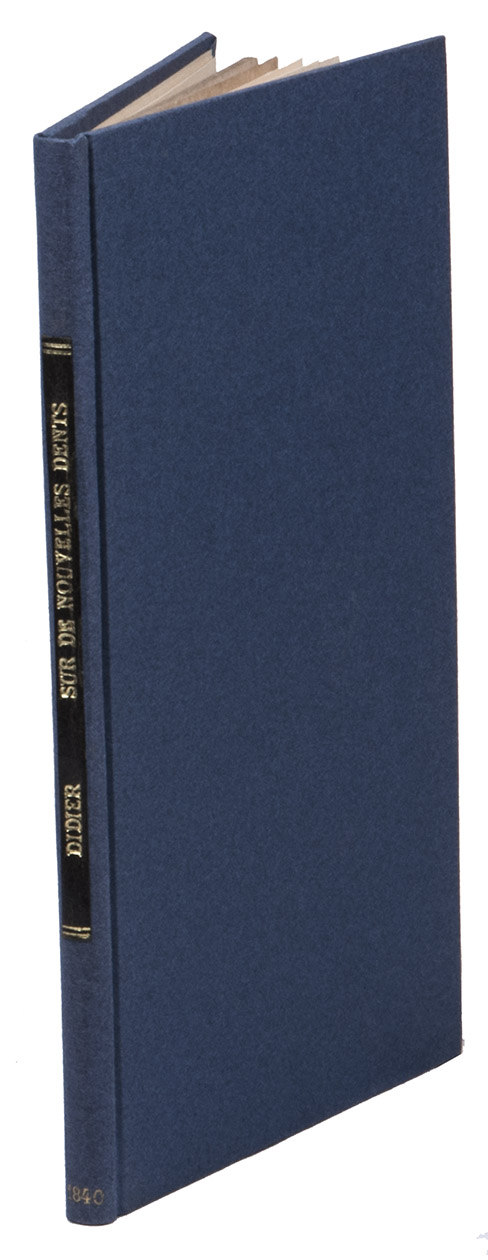 Rare treatise, proposing a new mineral paste for making artificial teeth and dentures, which would be much more beautiful, lasting and "perfect" than those made of any materials previously used. The author also gives a short survey of dental protheses of the past, and adds advice for caring for one's teeth, for both adult teeth and milk teeth. The title-page notes that De quelques conseils sur la conservation des dents (a separately published and perhaps more extensive version of the second work in the present edition, noted on the title-page) is available from the authorin Paris. Although the present edition has no imprint, it was apparently also available from him. The title-page has a few words set in 2 sizes of slab-serif capitals, and the title page and some interior pages also have a line set in small sans-serif capitals.