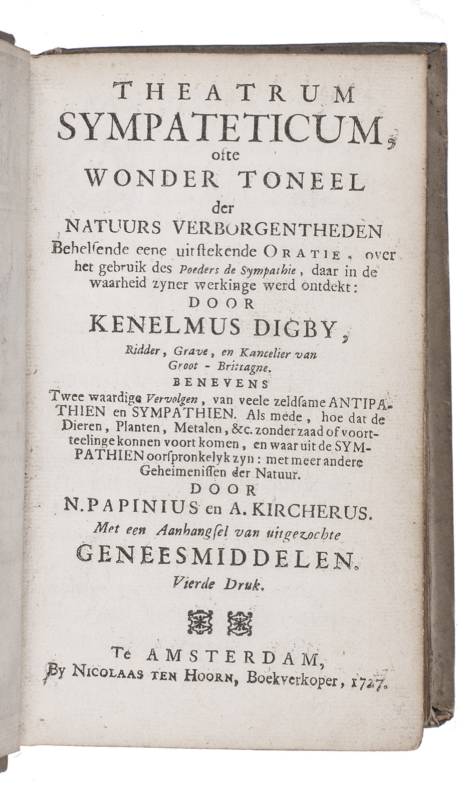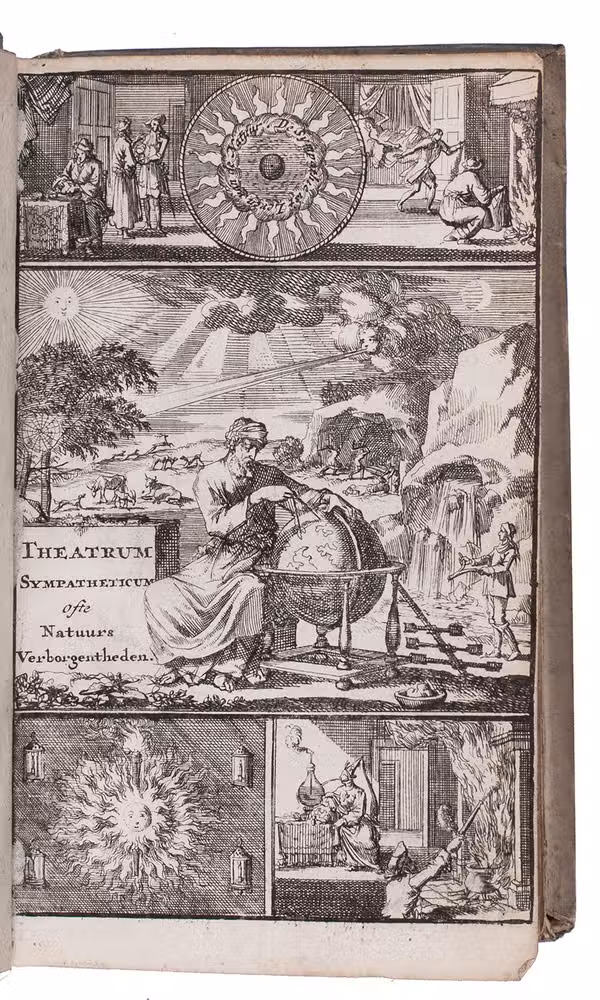 Rare fourth edition of the Dutch translation of a popular work on medicinal herbs, plants, minerals etc. with recipes. It starts with the Theatrum sympateticum, divided into two parts, by the English diplomat and philosopher Kenelm Digby (1603-1665). The first contains notes on medicinal herbs and plants curing everyday ailments, the second explains how to make the "powder of sympathy", "a potion which allowed the healing of the wound by treating the weapon which caused it" (MacDonald), and includes extracts from works by Papinius and Sylvester Rattrat. The powder of sympathy could also be put on a bandage that had been in contact with the wound, without ever touching the wound. Digbys work is followed by 't Groote licht der natuurkunde by Athanasius Kircher (1602-1680), a work on magnetic forces and the influence of the moon, sun and planets on the earth. The book closes with extracts from Digby's memoirs containing recipes for "new" medicines, including mostly household and cosmetic recipes, like face powder for women and water to whiten teeth.