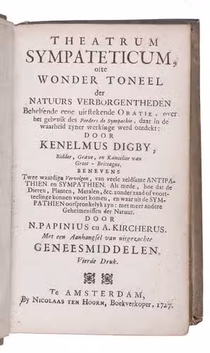 Theatrum sympateticum, ofte wonder toneel der natuurs verborgentheden. ... Benevens twee waardige vervolgen, van veele zeldsame antipathien en sympathien. Als mede, hoe dat de dieren, planten, metalen, &c. zonder zaad of voortteelinge konnen voort komen, ... Vierde druk.