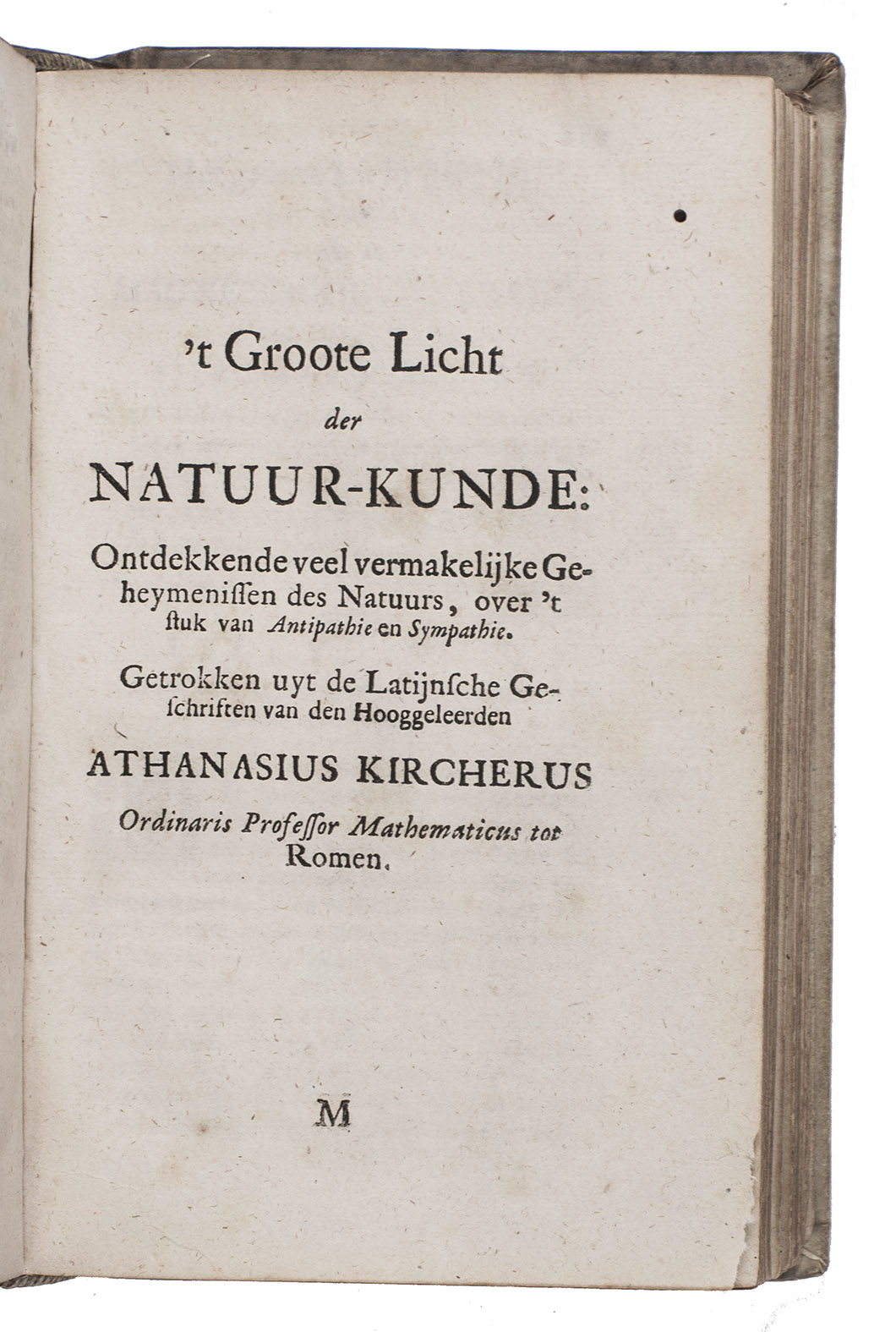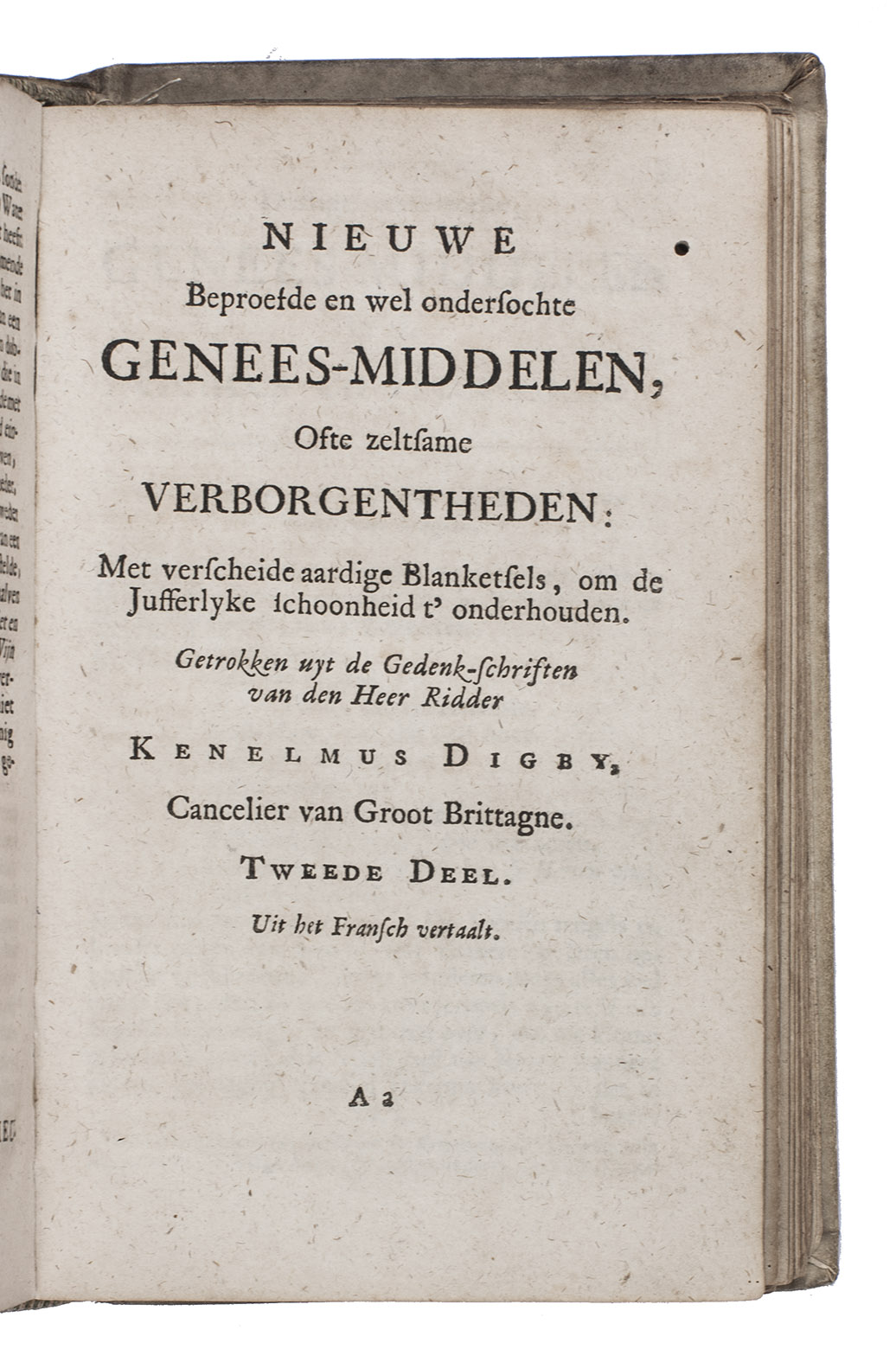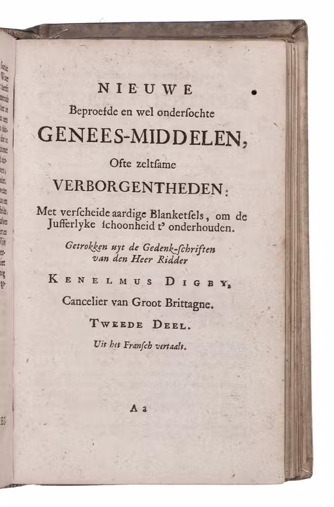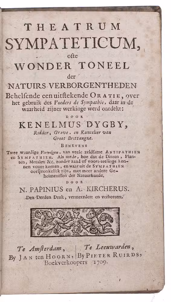 Rare 3rd edition of the Dutch translation of a popular work on medicinal herbs, plants, minerals etc. with recipes. It starts with the Theatrum sympateticum, divided into two parts, by the English diplomat and philosopher Kenelm Digby (1603-1665). The first contains notes on medicinal herbs and plants curing everyday ailments, the second explains how to make the "powder of sympathy", "a potion which allowed the healing of the wound by treating the weapon which caused it" (MacDonald), and includes extracts from works by Papinius and Sylvester Rattrat. The powder of sympathy could also be put on a bandage that had been in contact with the wound, without ever touching the wound. Digbys work is followed by 't Groote licht der natuurkunde by Athanasius Kircher (1602-1680), a work on magnetic forces and the influence of the moon, sun and planets on the earth. The book closes with extracts from Digby's memoirs containing recipes for "new" medicines, including mostly household and cosmetic recipes, like face powder for women and water to whiten teeth. The first Dutch edition was published in 1681.