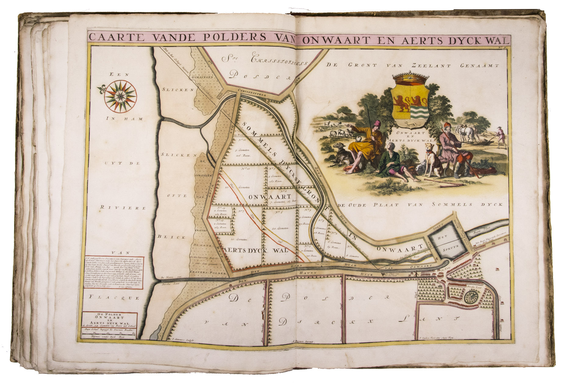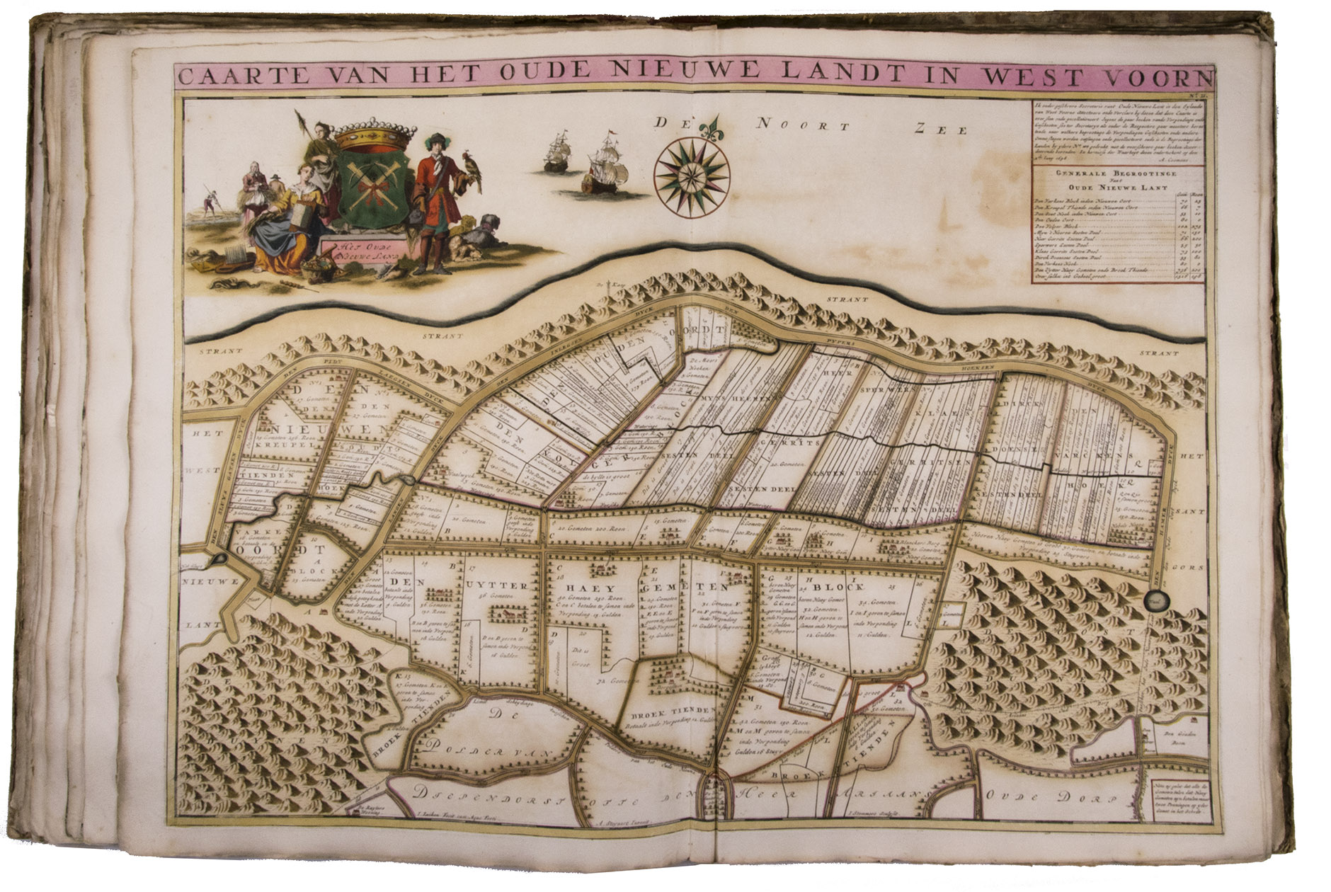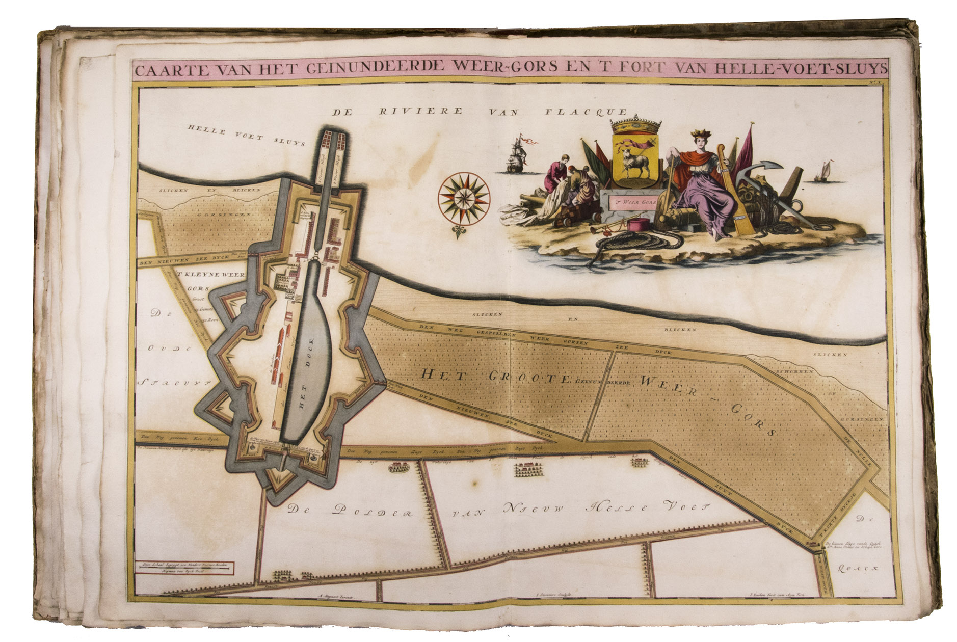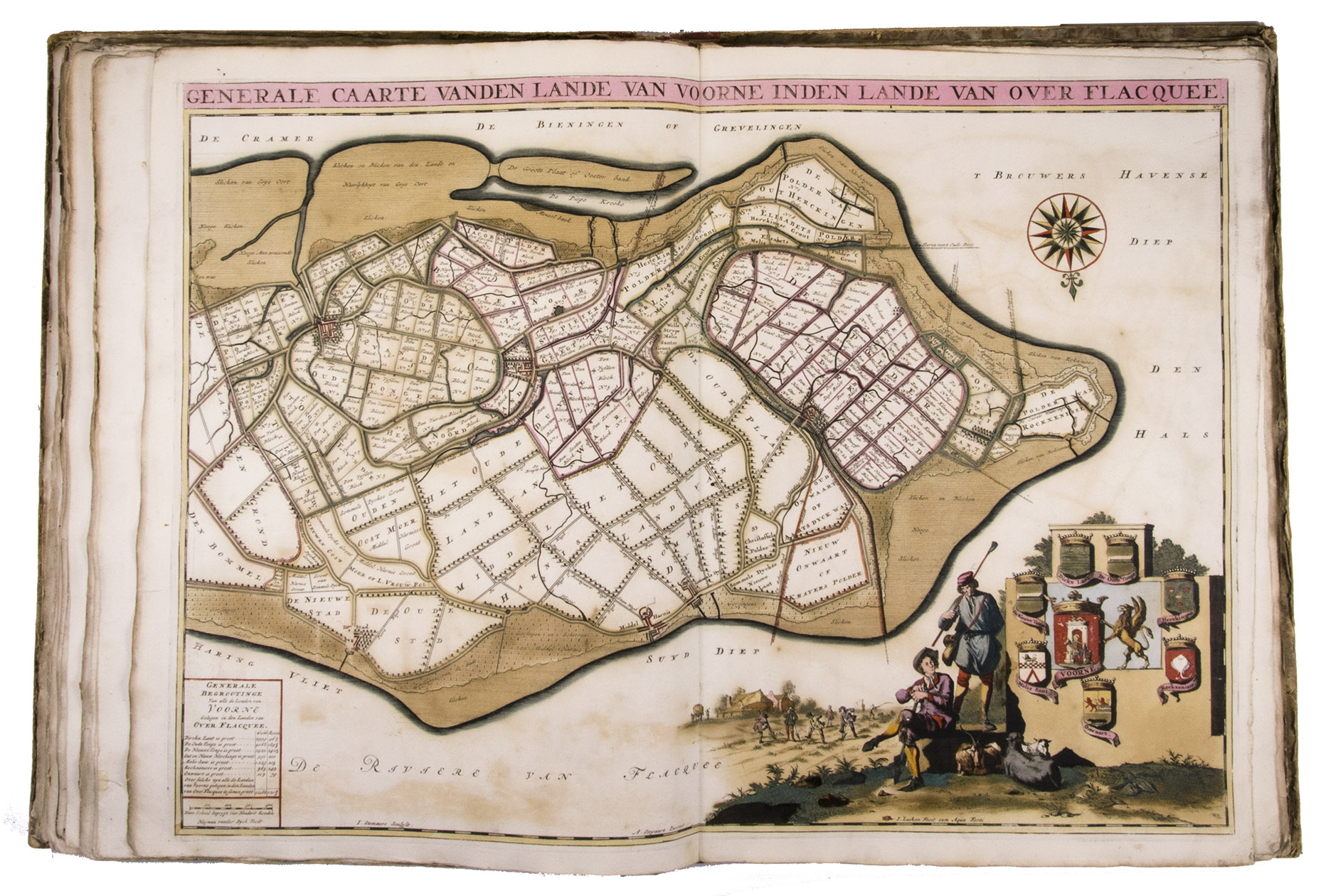 First and only edition of a splendid atlas in full contemporary colour. In 1695, the "Land van Voorne" commissioned the surveyor Heyman van Dijck to map the territory of Voorne (South Holland). Romeyn de Hooghe was requested to decorate the maps, but would eventually only execute the title-page, a typical example of his rich allegorical imagery, decorated with the coats of arms of the administrators of Voorne, with the arms of the "Opperdijkgraaf", Jacob Frederik baron van Beyeren van Schagen, prominently placed in the centre. Jan and Caspar Luyken adorned the highly detailed maps with the coat of arms of the region depicted, often against the background of a rustic scene.