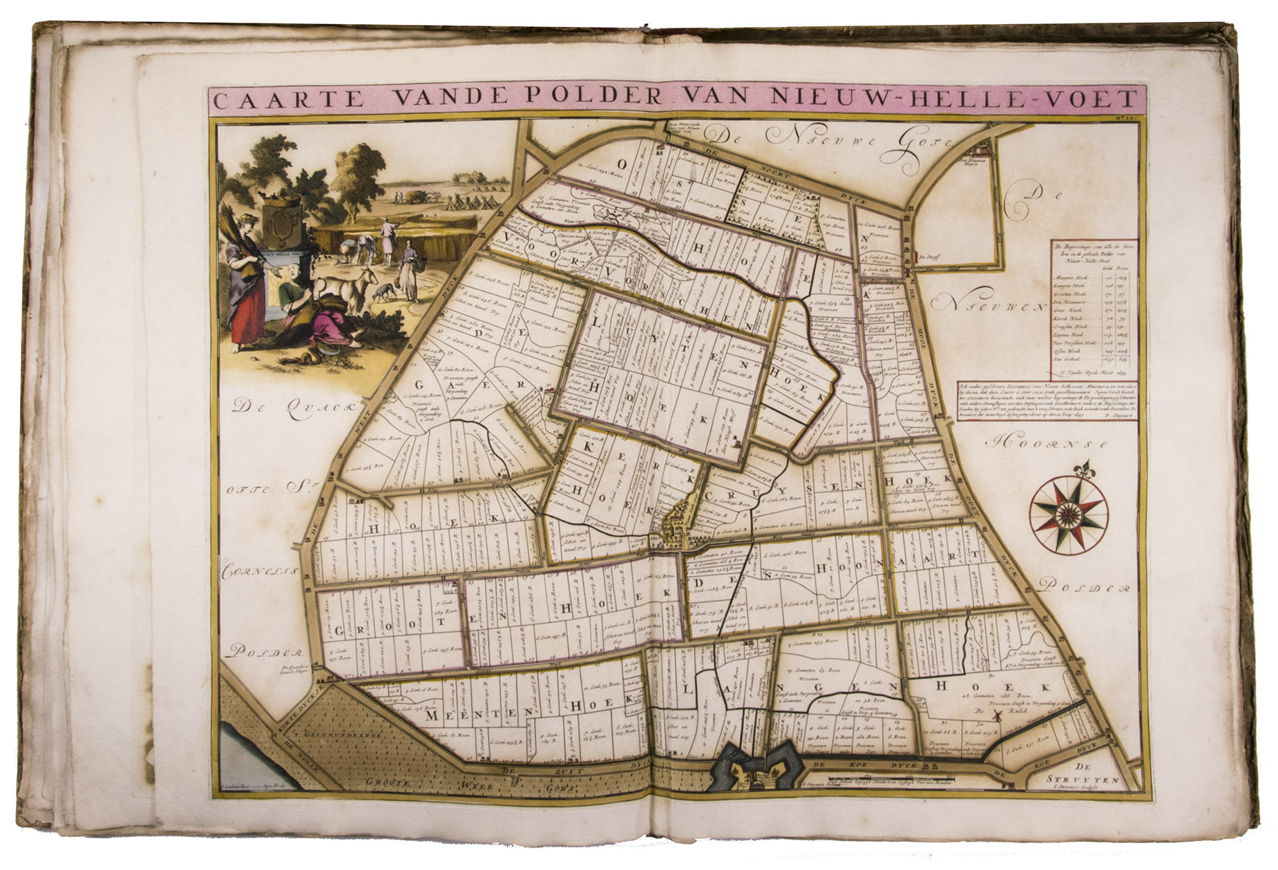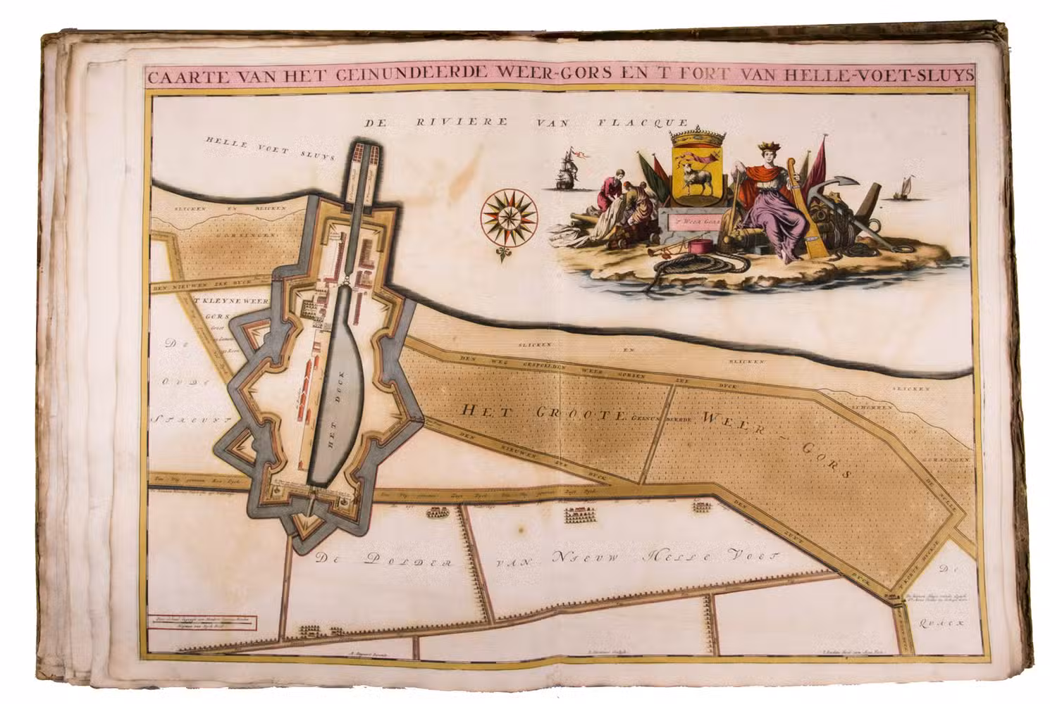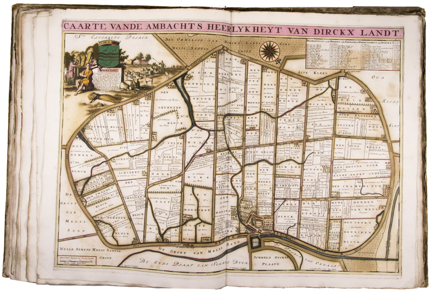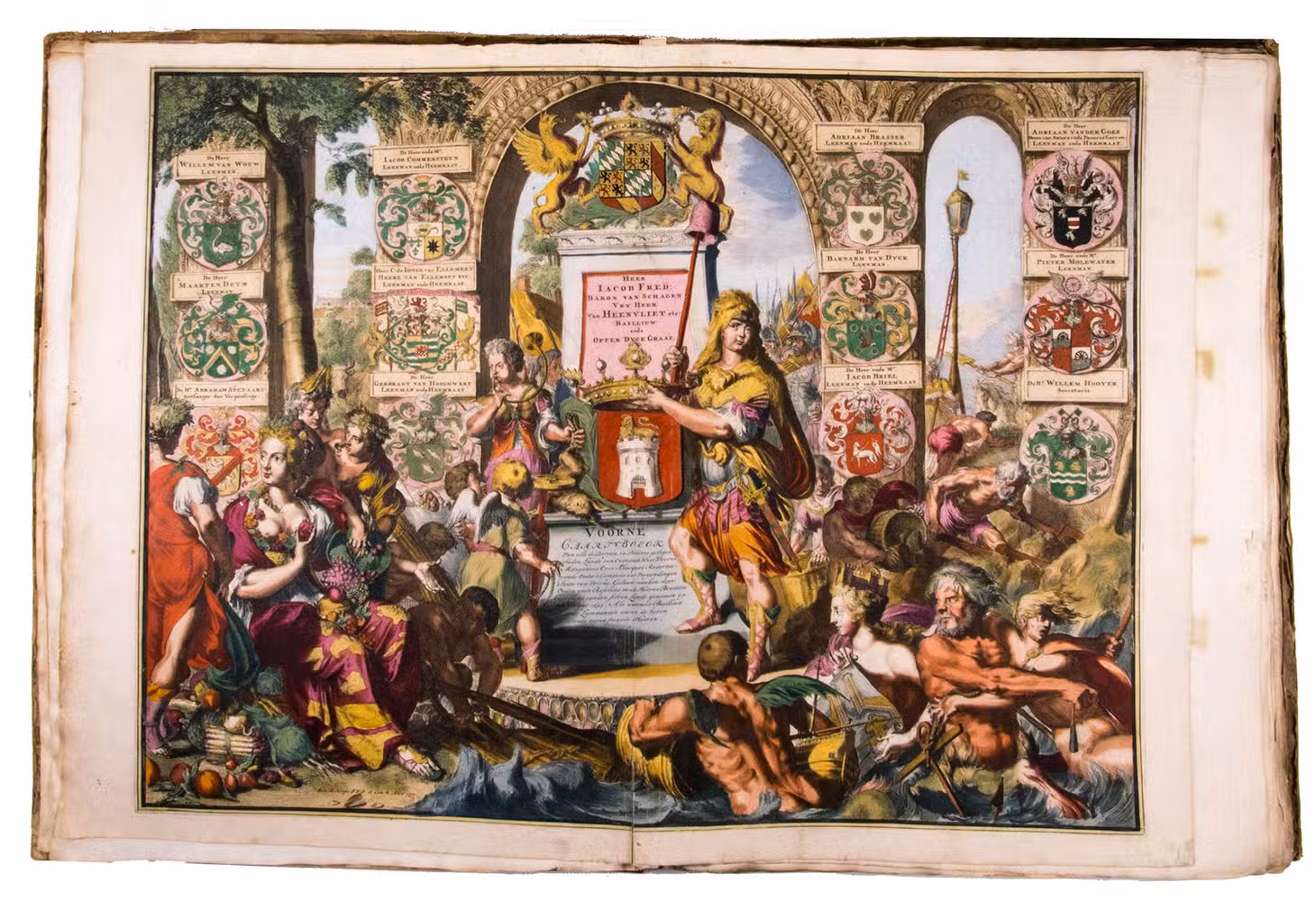 First and only edition of a splendid atlas in full contemporary colour. In 1695, the "Land van Voorne" commissioned the surveyor Heyman van Dijck to map the territory of Voorne (South Holland). Romeyn de Hooghe was requested to decorate the maps, but would eventually only execute the title-page, a typical example of his rich allegorical imagery, decorated with the coats of arms of the administrators of Voorne, with the arms of the "Opperdijkgraaf", Jacob Frederik baron van Beyeren van Schagen, prominently placed in the centre. Jan and Caspar Luyken adorned the highly detailed maps with the coat of arms of the region depicted, often against the background of a rustic scene.