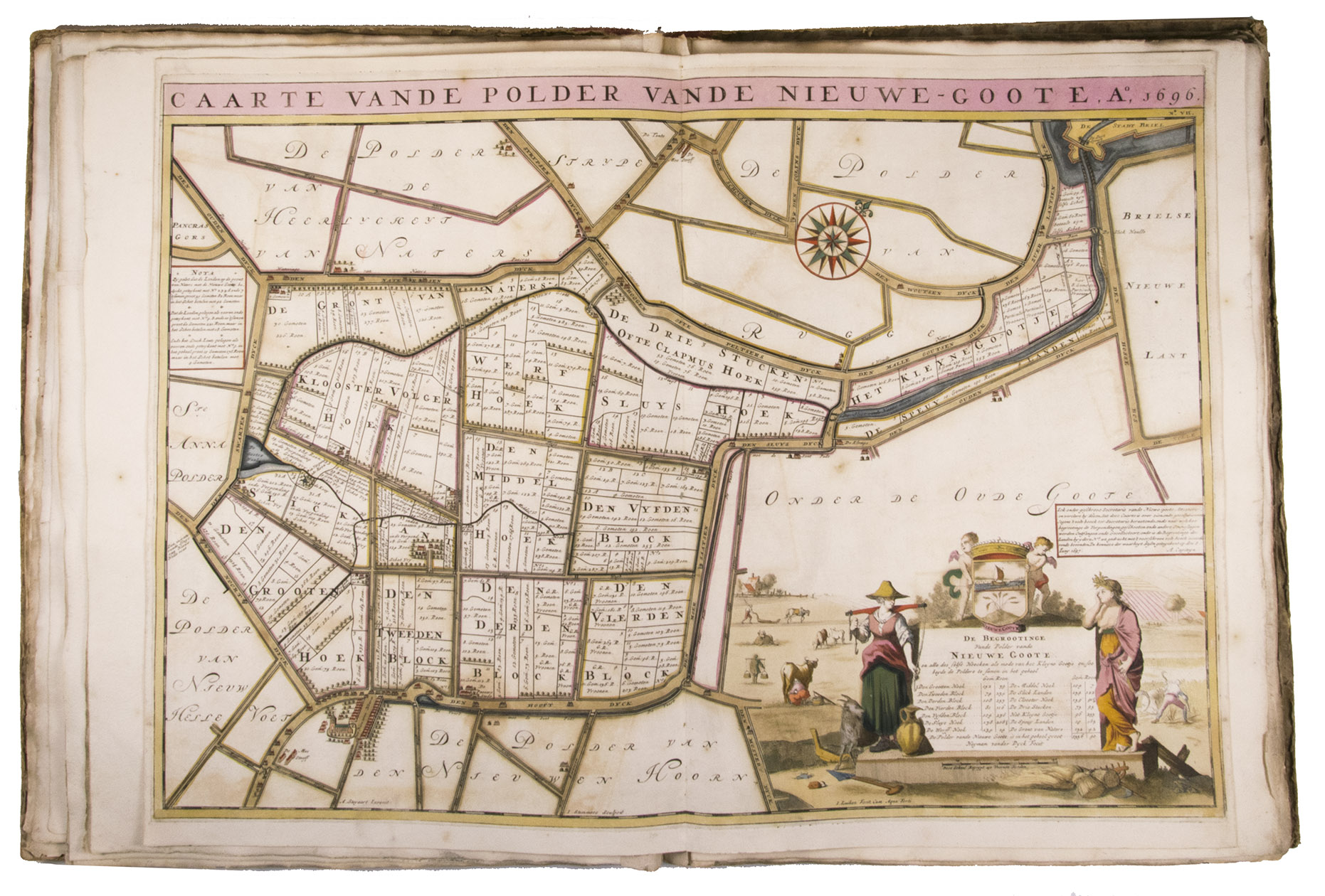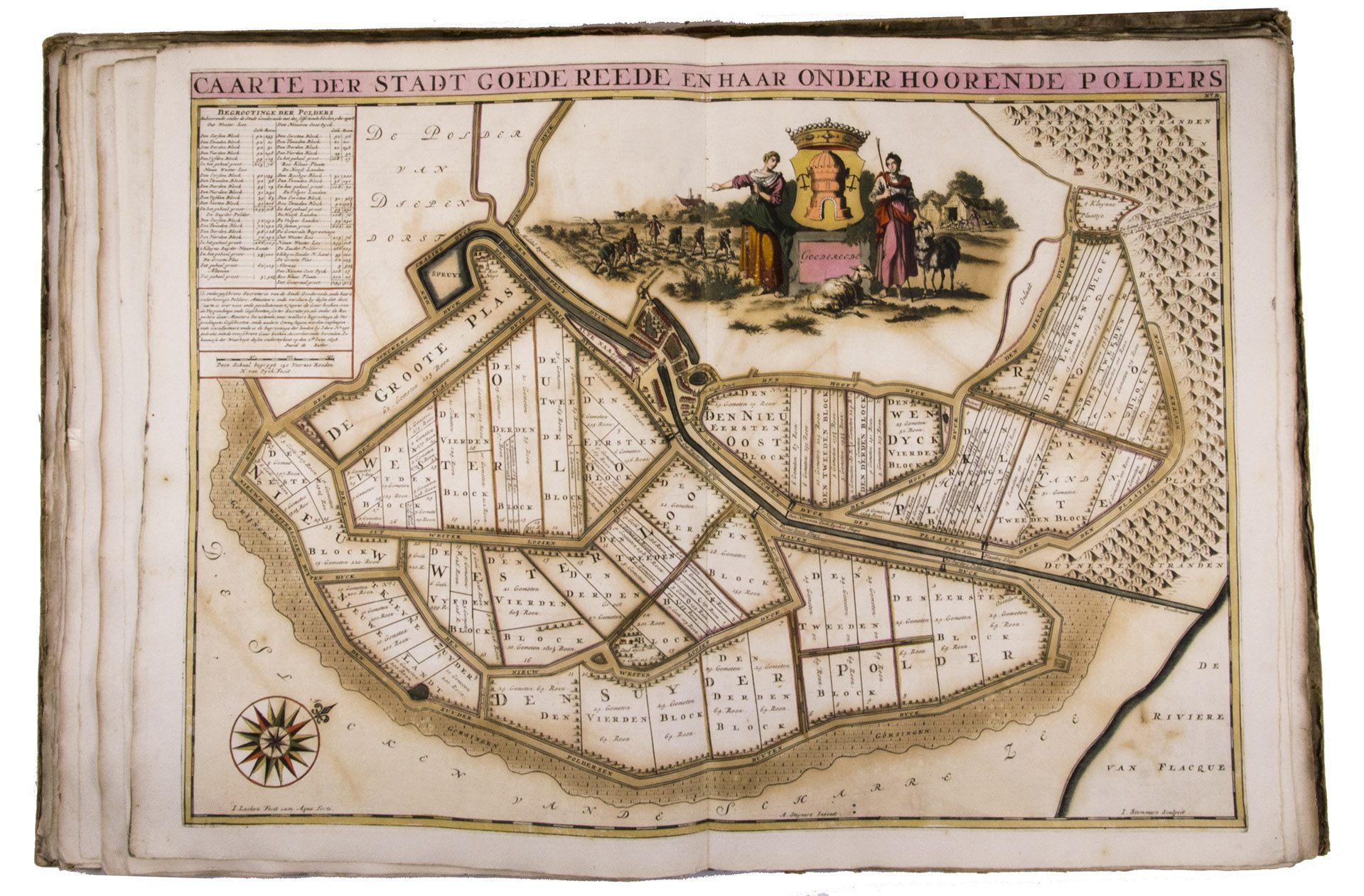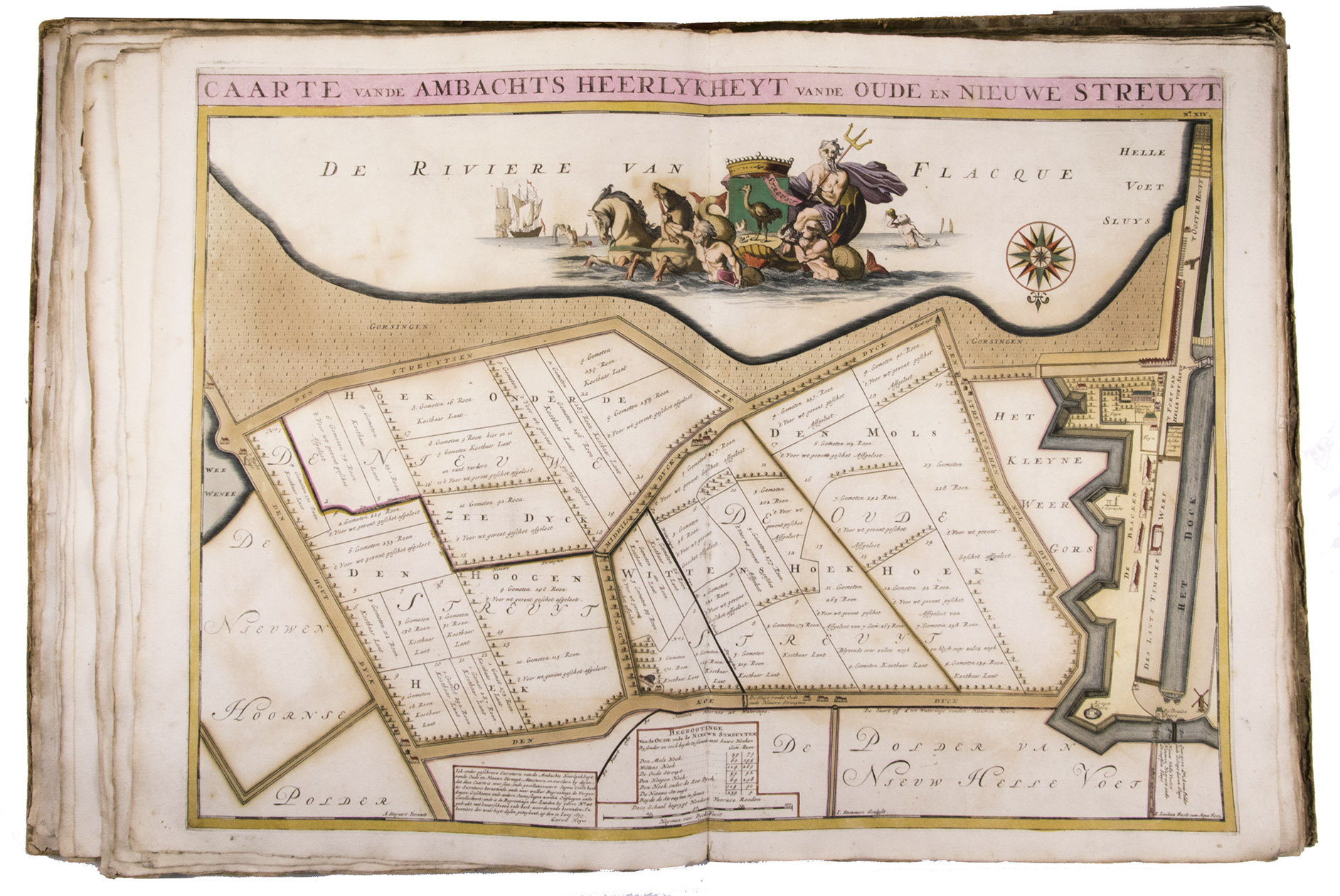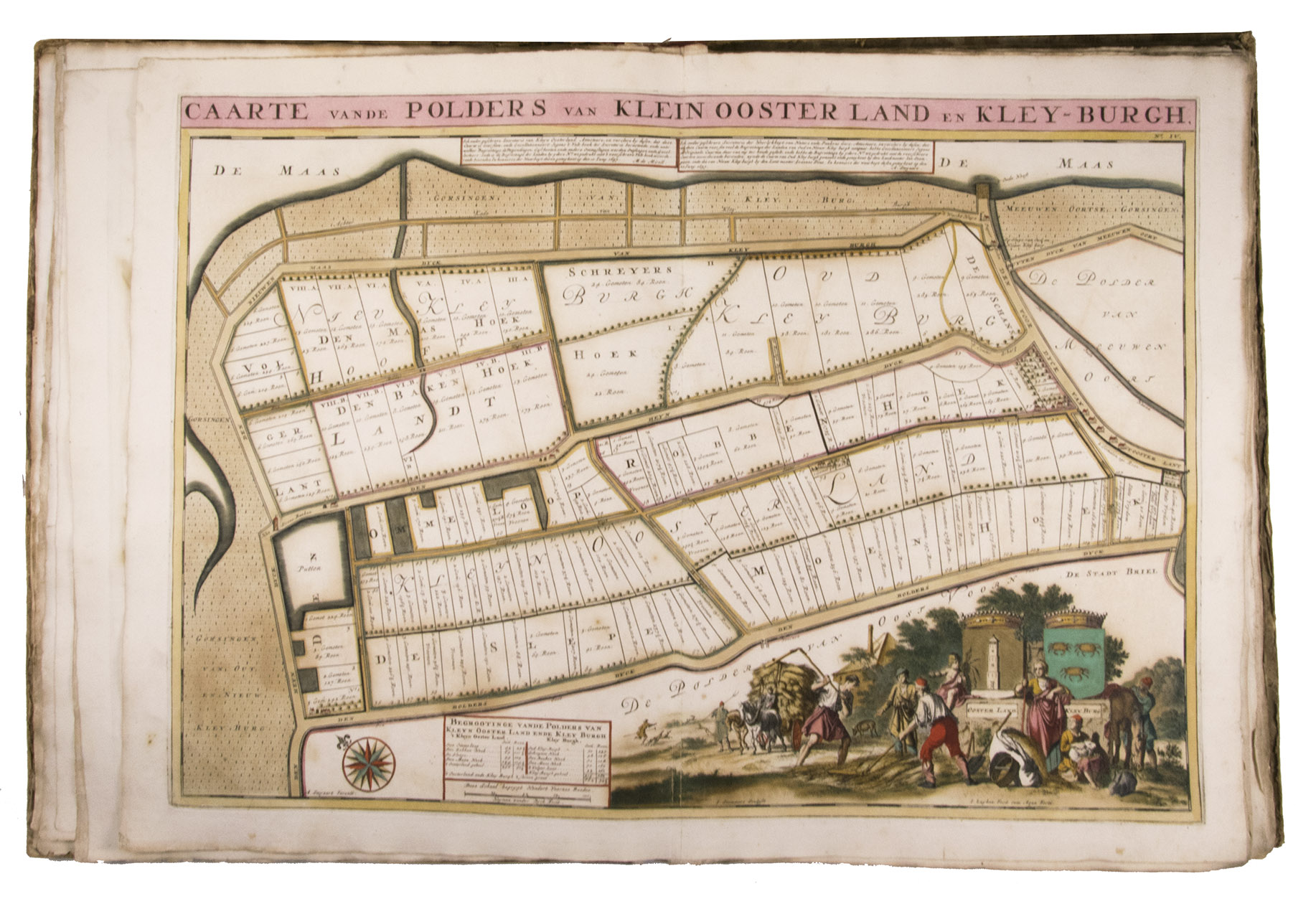 First and only edition of a splendid atlas in full contemporary colour. In 1695, the "Land van Voorne" commissioned the surveyor Heyman van Dijck to map the territory of Voorne (South Holland). Romeyn de Hooghe was requested to decorate the maps, but would eventually only execute the title-page, a typical example of his rich allegorical imagery, decorated with the coats of arms of the administrators of Voorne, with the arms of the "Opperdijkgraaf", Jacob Frederik baron van Beyeren van Schagen, prominently placed in the centre. Jan and Caspar Luyken adorned the highly detailed maps with the coat of arms of the region depicted, often against the background of a rustic scene.