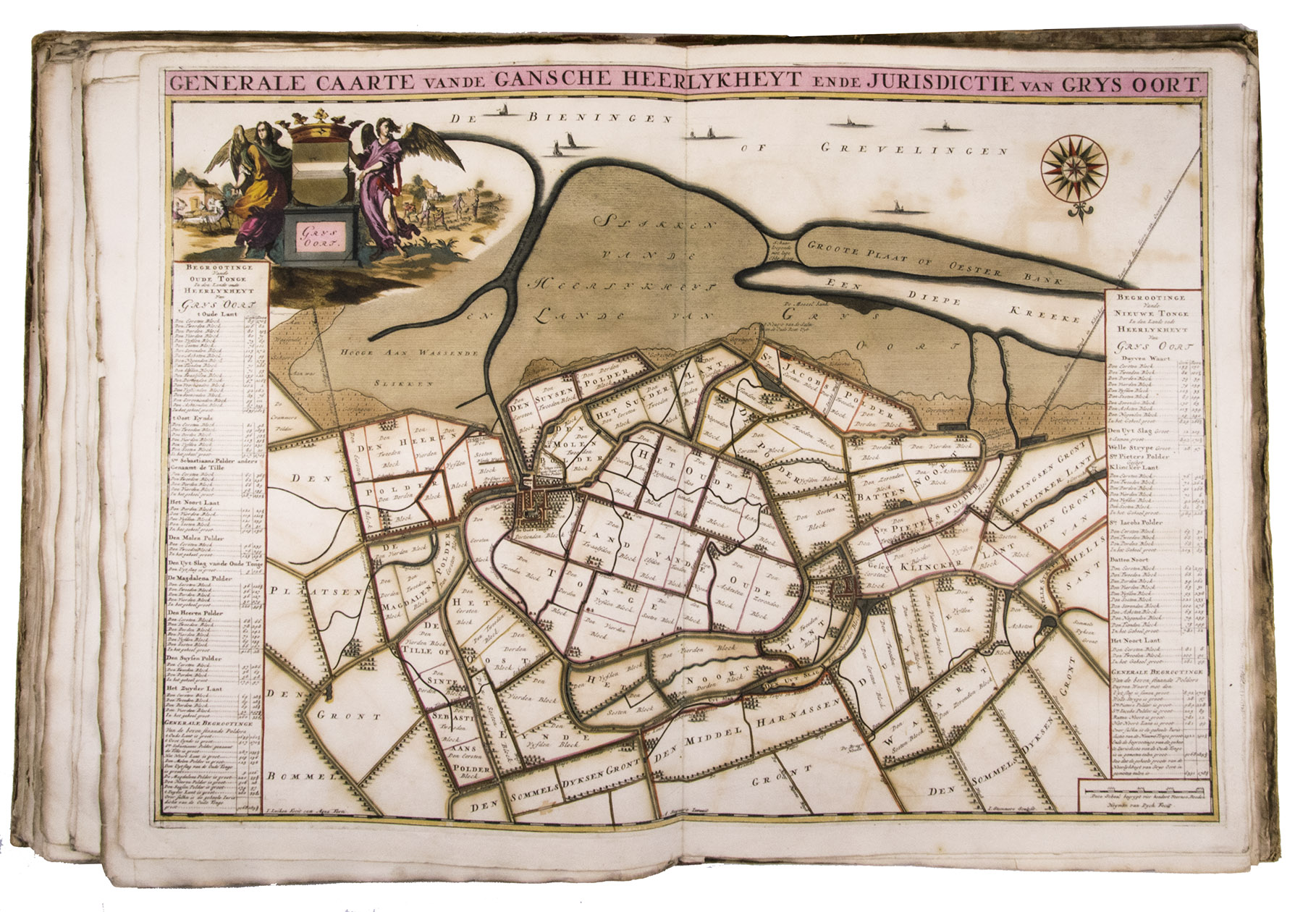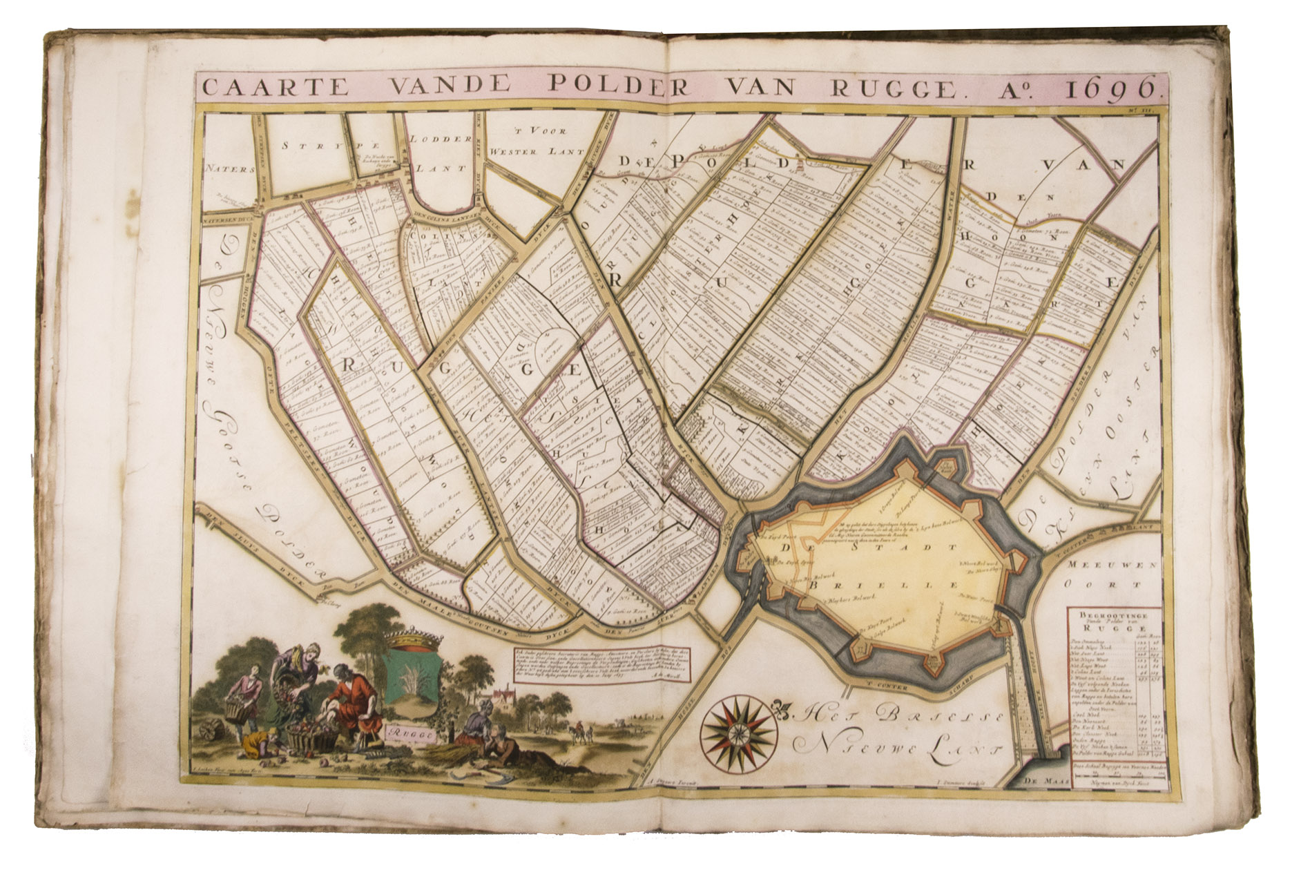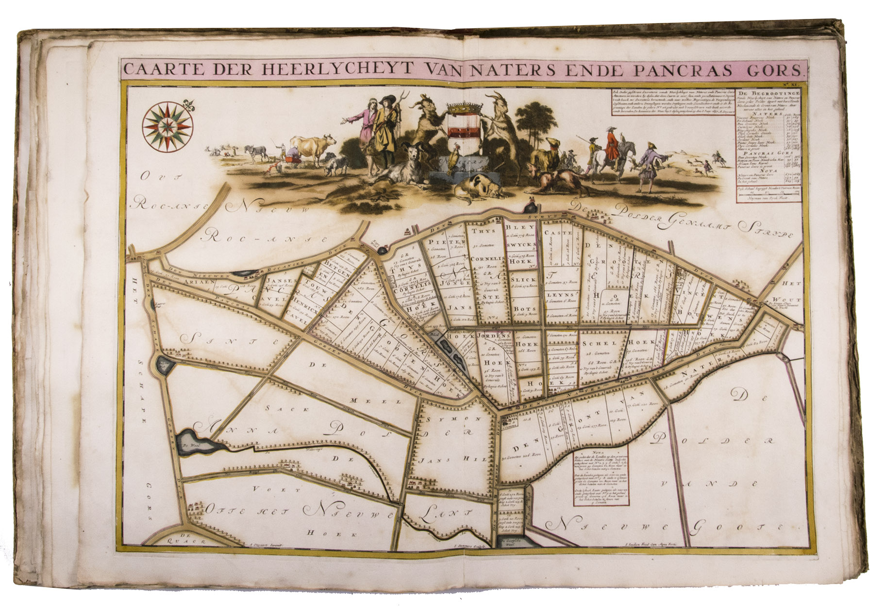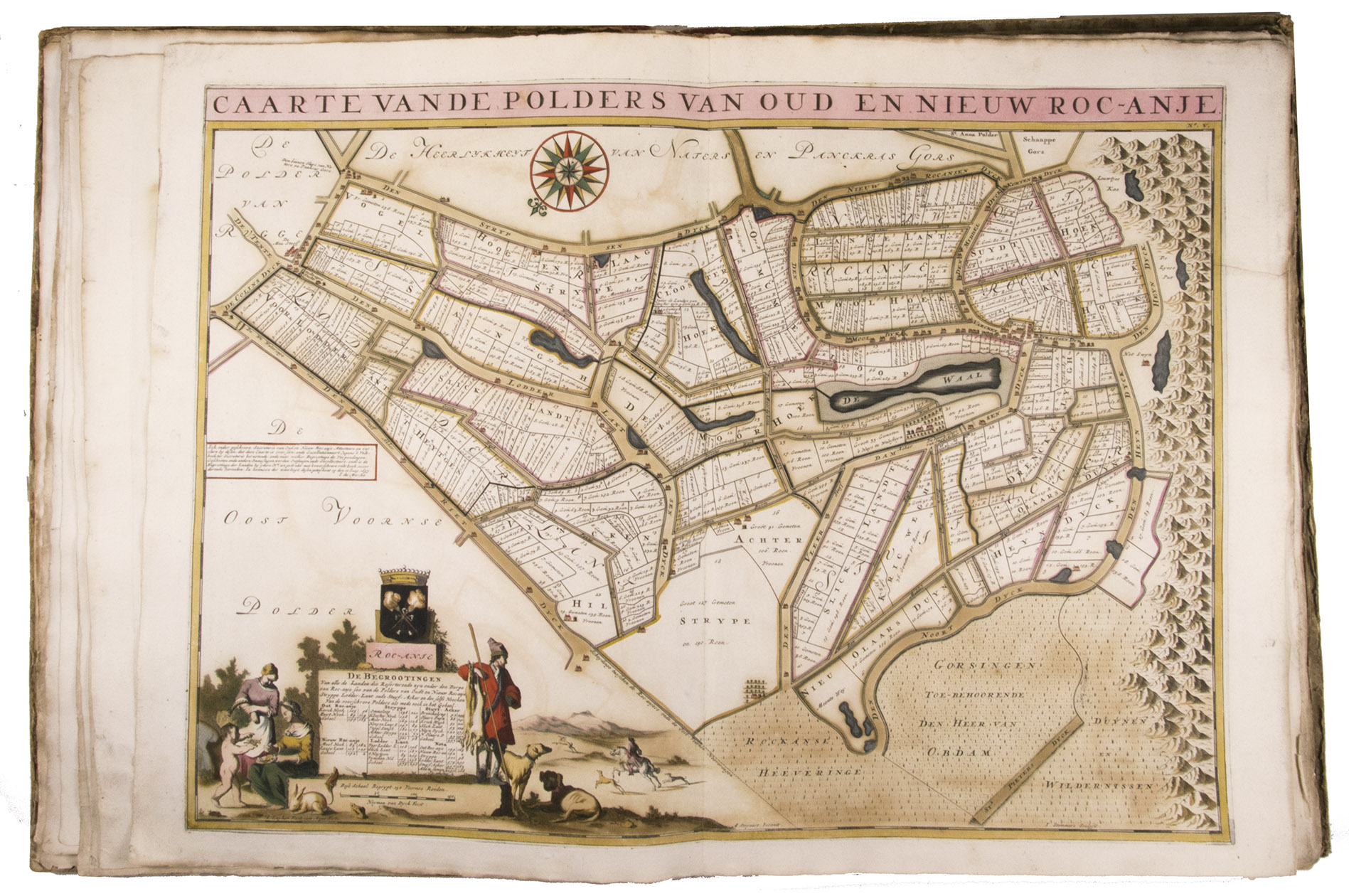 First and only edition of a splendid atlas in full contemporary colour. In 1695, the "Land van Voorne" commissioned the surveyor Heyman van Dijck to map the territory of Voorne (South Holland). Romeyn de Hooghe was requested to decorate the maps, but would eventually only execute the title-page, a typical example of his rich allegorical imagery, decorated with the coats of arms of the administrators of Voorne, with the arms of the "Opperdijkgraaf", Jacob Frederik baron van Beyeren van Schagen, prominently placed in the centre. Jan and Caspar Luyken adorned the highly detailed maps with the coat of arms of the region depicted, often against the background of a rustic scene.