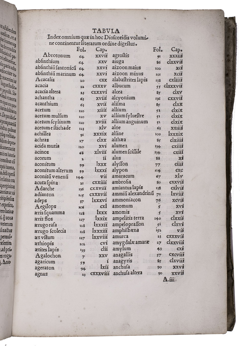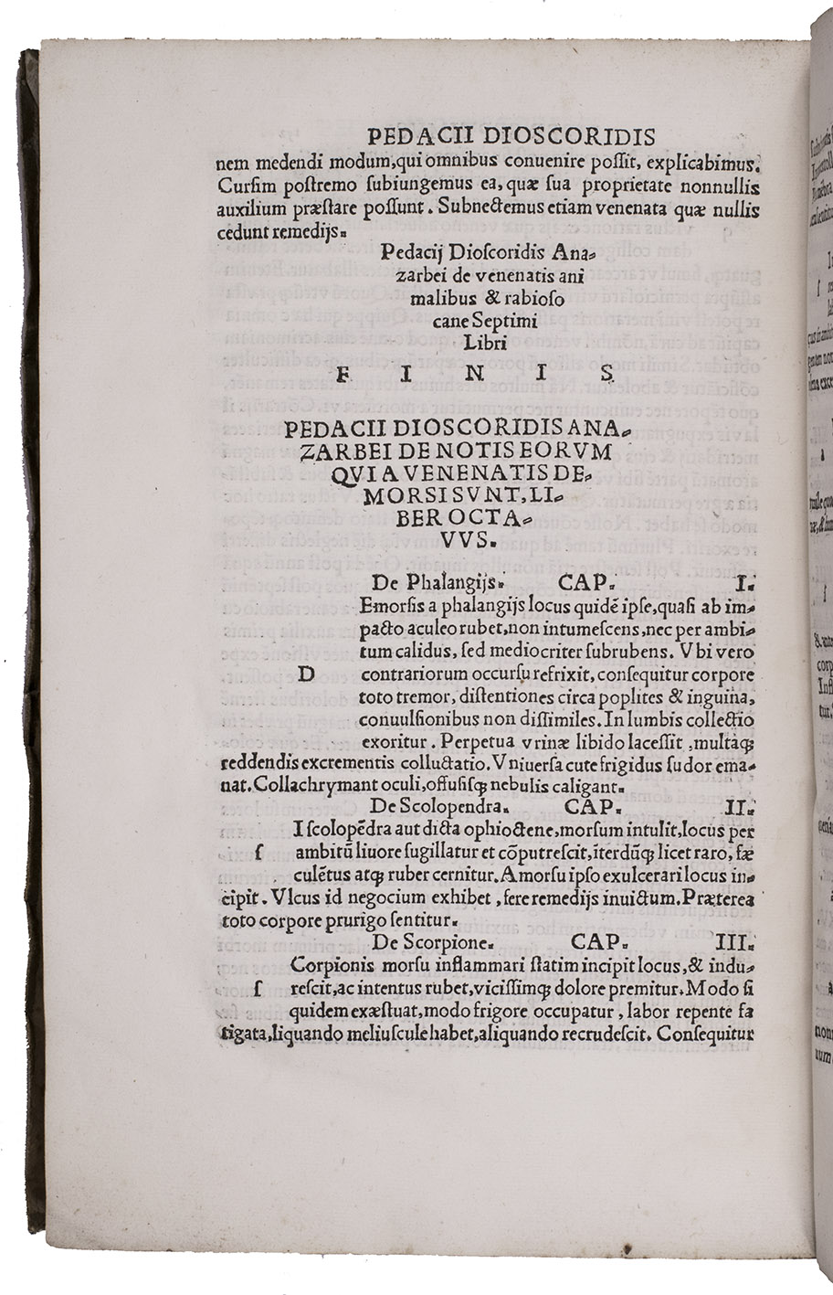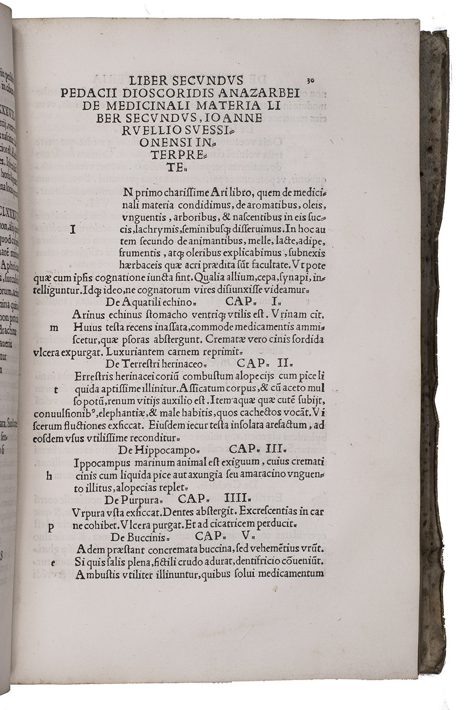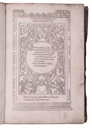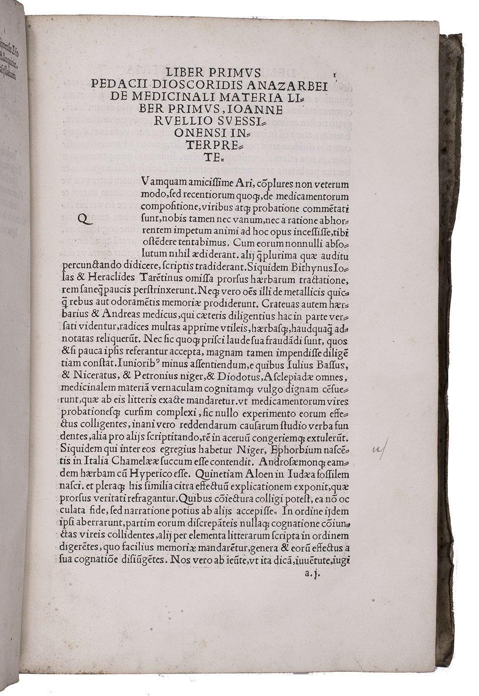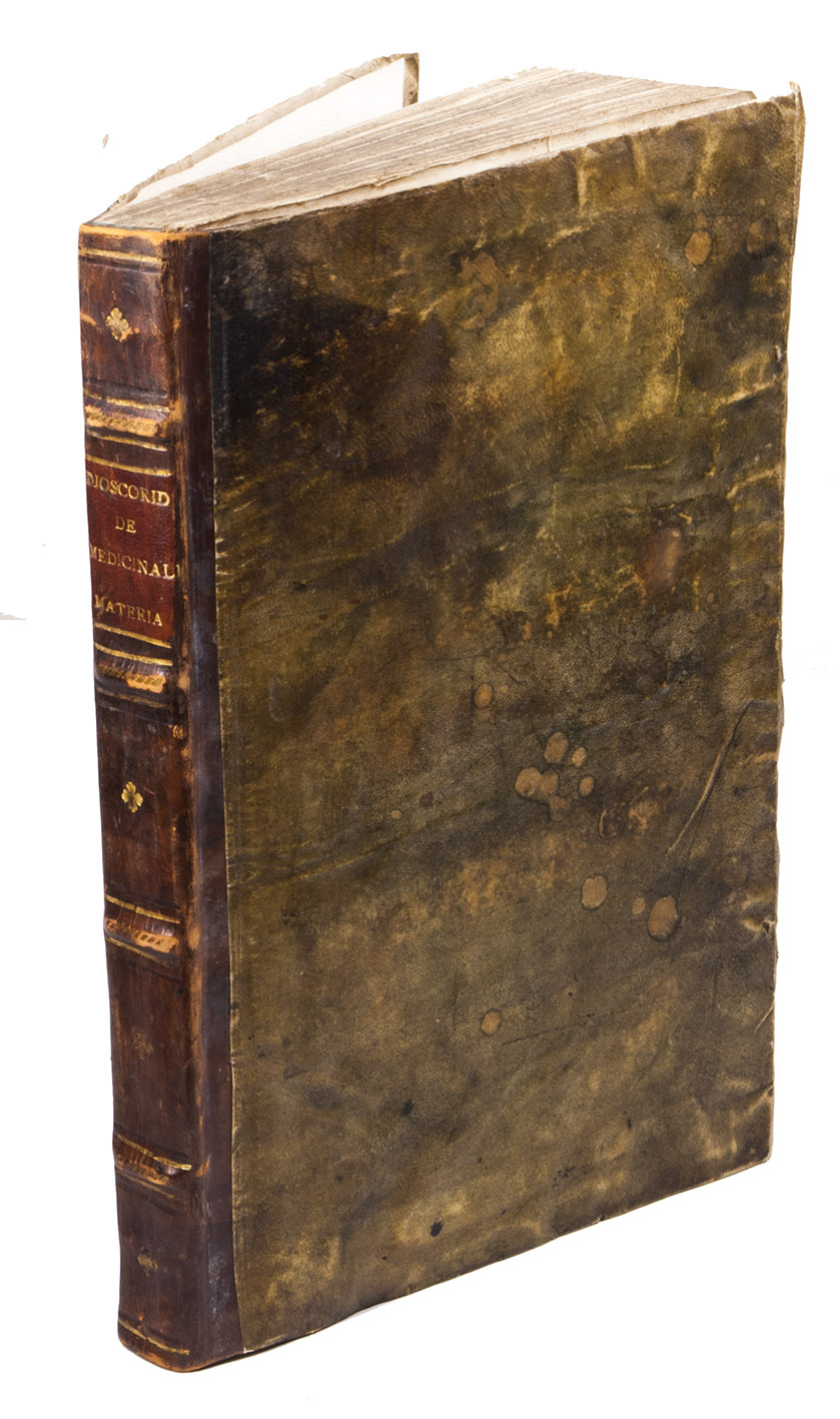 First edition of Jean Ruel's translation into Latin of Dioscorides's standard work on pharmacology, De materia medica (books 1-5), the most important botanical book up on to the 16th century, followed by four books on poison De venenis and De venenatis animalibus (books 6-9).