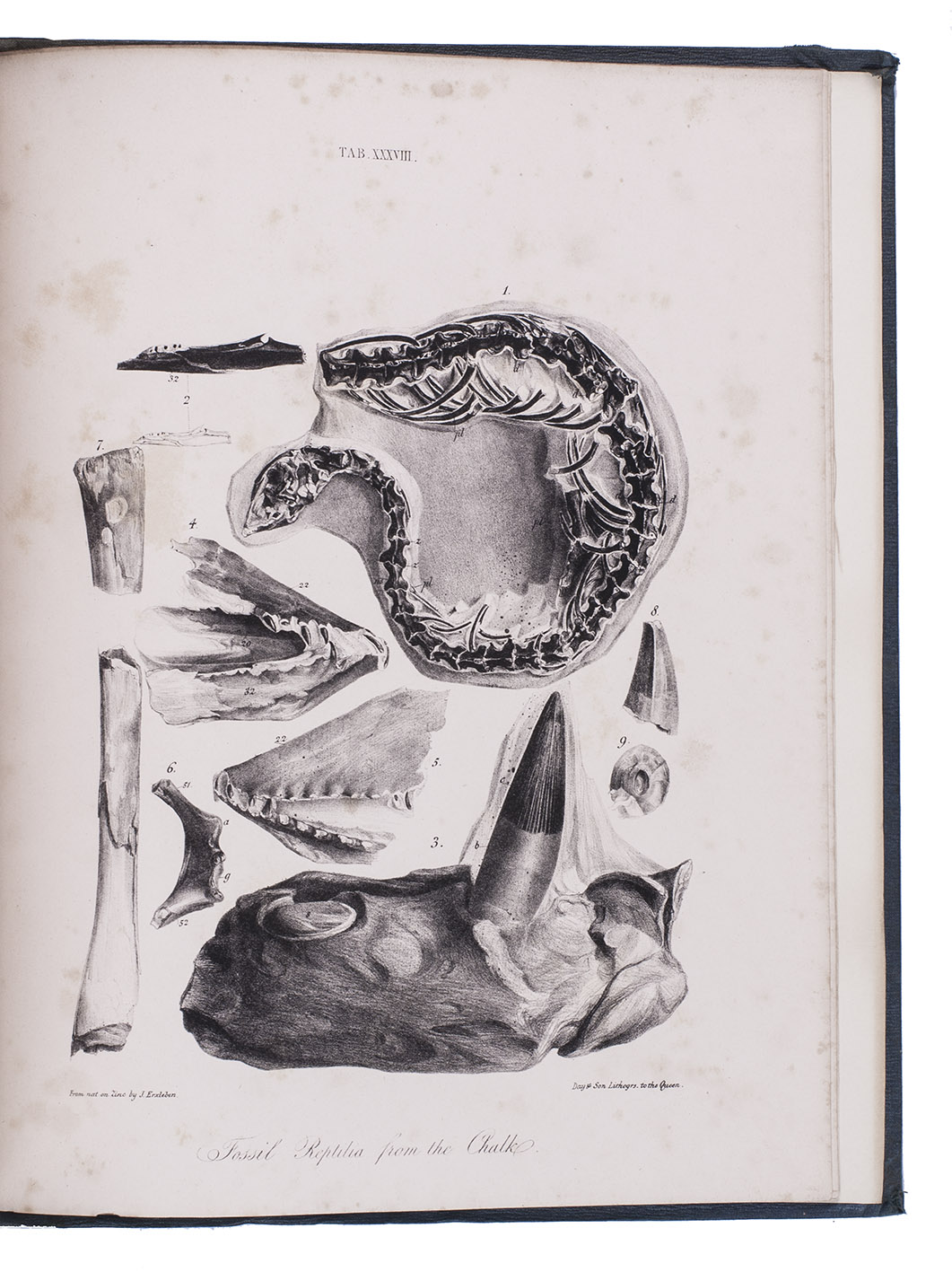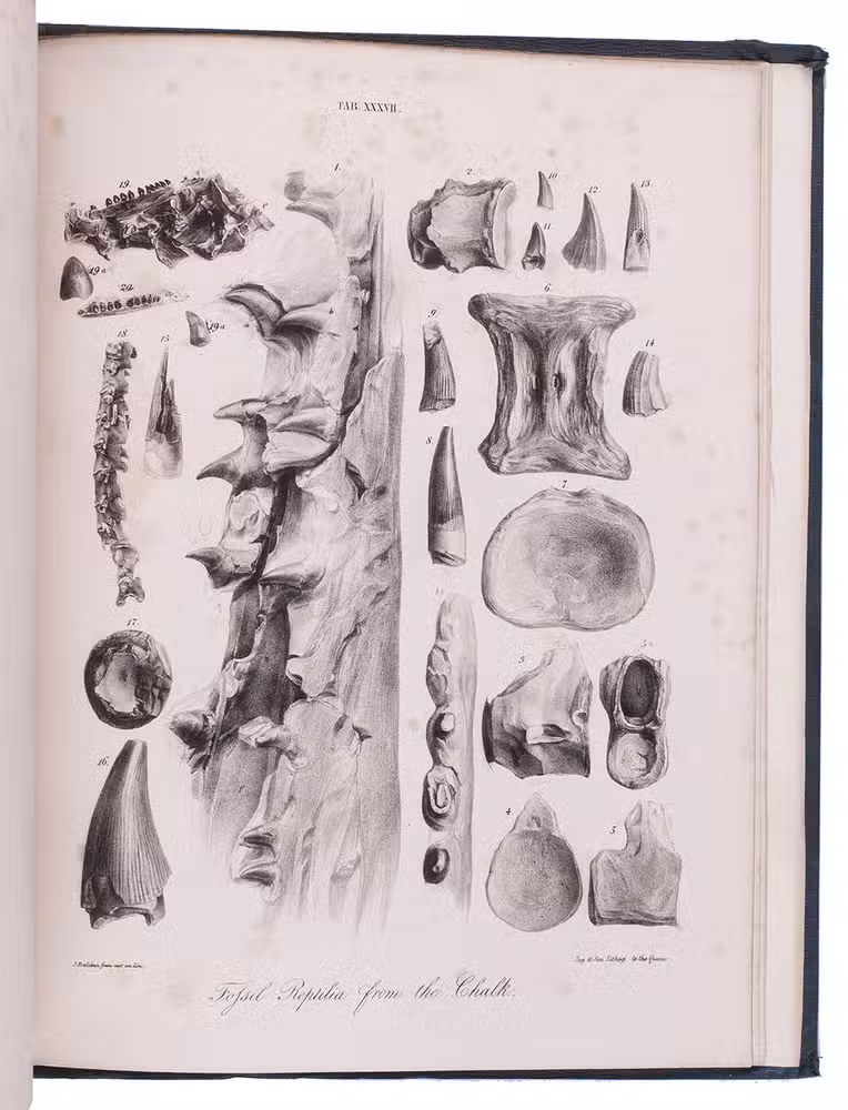 First edition of a richly illustrated geological and palaeontological description of Sussex, England, during the Triassic and Cretaceous period, by Frederick Dixon. The work was published posthumously and edited by the British biologist and palaeontologist Richard Owen (1804-1892). The text is divided into three parts, the last part being a catalogue of numerous animal and vegetable fossils excavated in different areas. The first part describes the formations in Selsey, Bracklesham Bay, Bognor, Worthing and the Sussex coast. The second part compares the chalk formations in Sussex to those in Europe. Each plate depicts between 4 and 30 fossils.