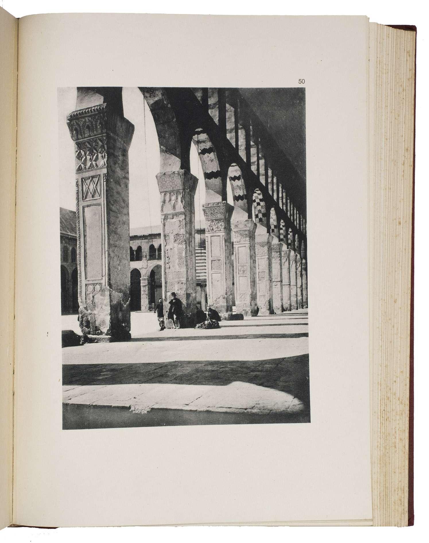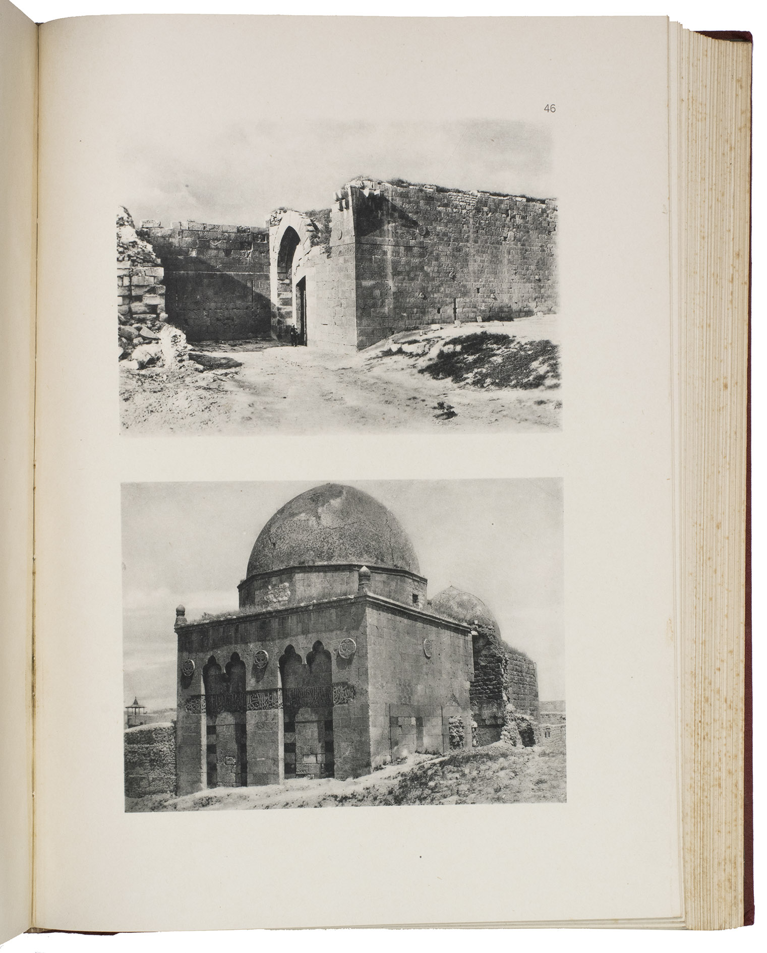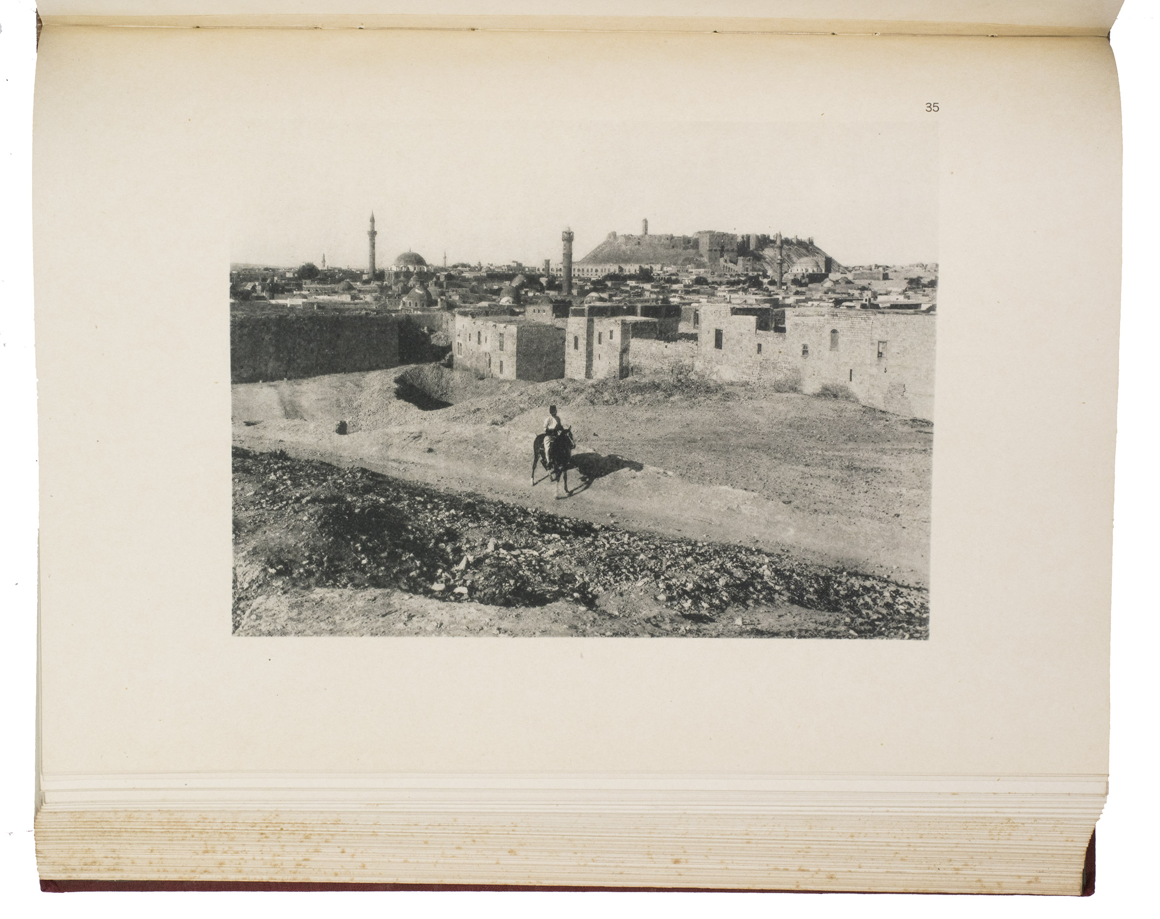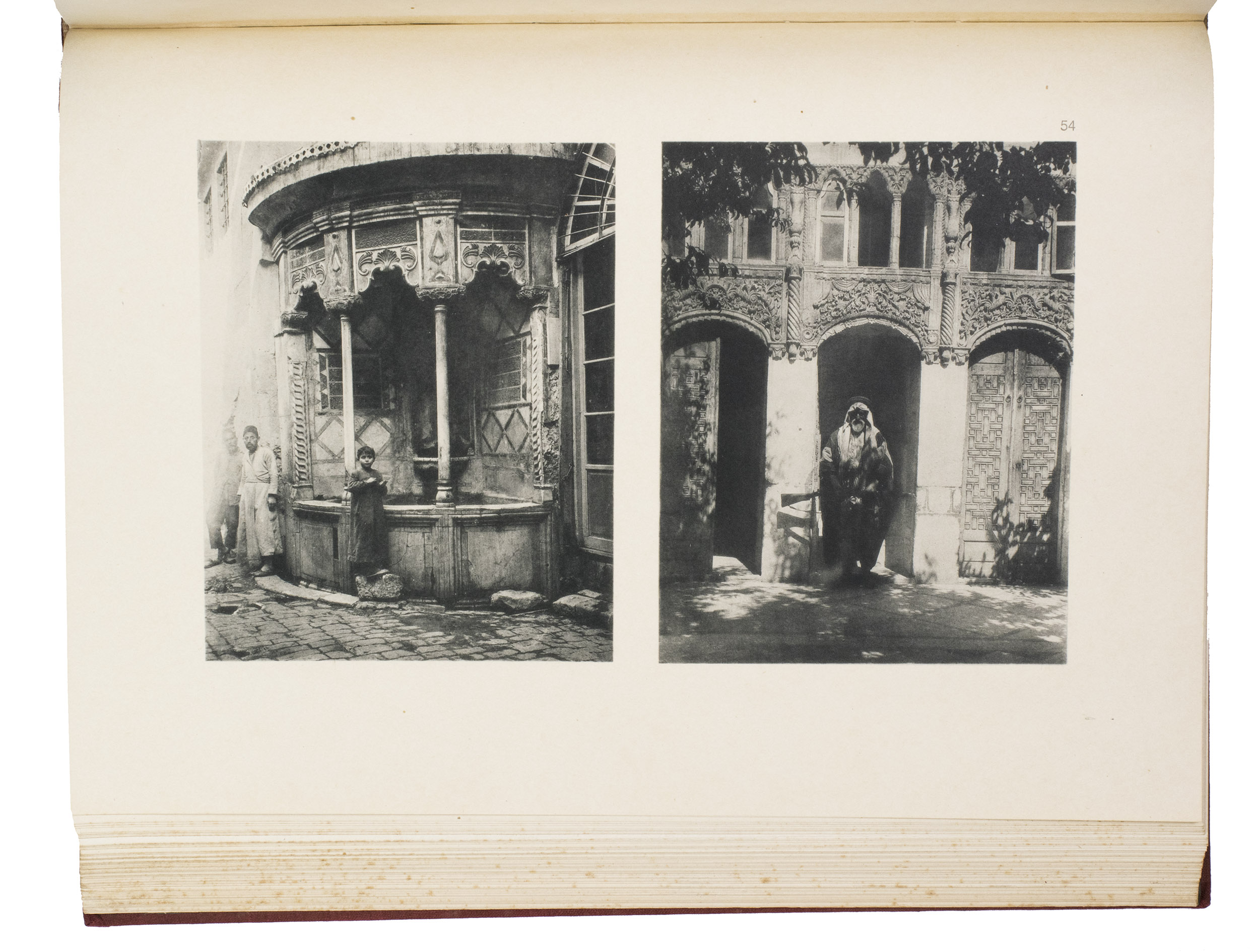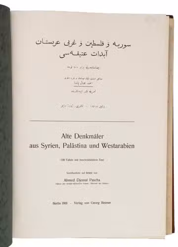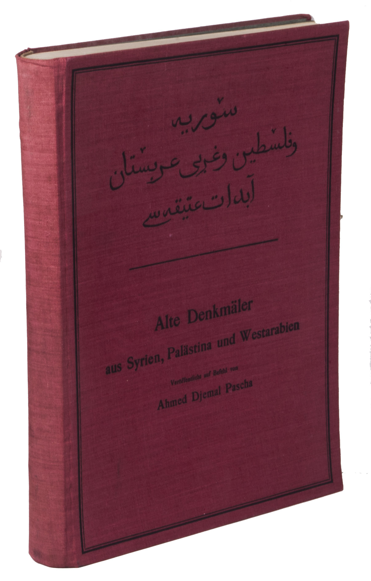 First and only edition of a bilingual work with 143 photographs of archeology in the Middle East, compiled by the well-known German archaeologist Theodore Wiegand (1864-1936). The publication was ordered by Ahmed Djemal Pasha (or Jamal Basha, 1872-1822), the Ottoman military leader and Minister of the Navy, who also wrote the foreword. The 100 plates show a total of 143 photographs, showing archaeological excavation sites in Aleppo, Amman, Baalbek, Damascus, Gerasa, Jerusalem, Palmyra, Petra and others. Each plate is accompanied by a leaf explaining the photographs, with the text in both Arabic and German. Some of the photographs are by the Swedish photographer Lewis Larsson (1881-1958). Others were taken during the expedition by Otto Puchstein (1856-1911) to the capital of the ancient Hittite Empire, Hattusa, in present-day Turkey.