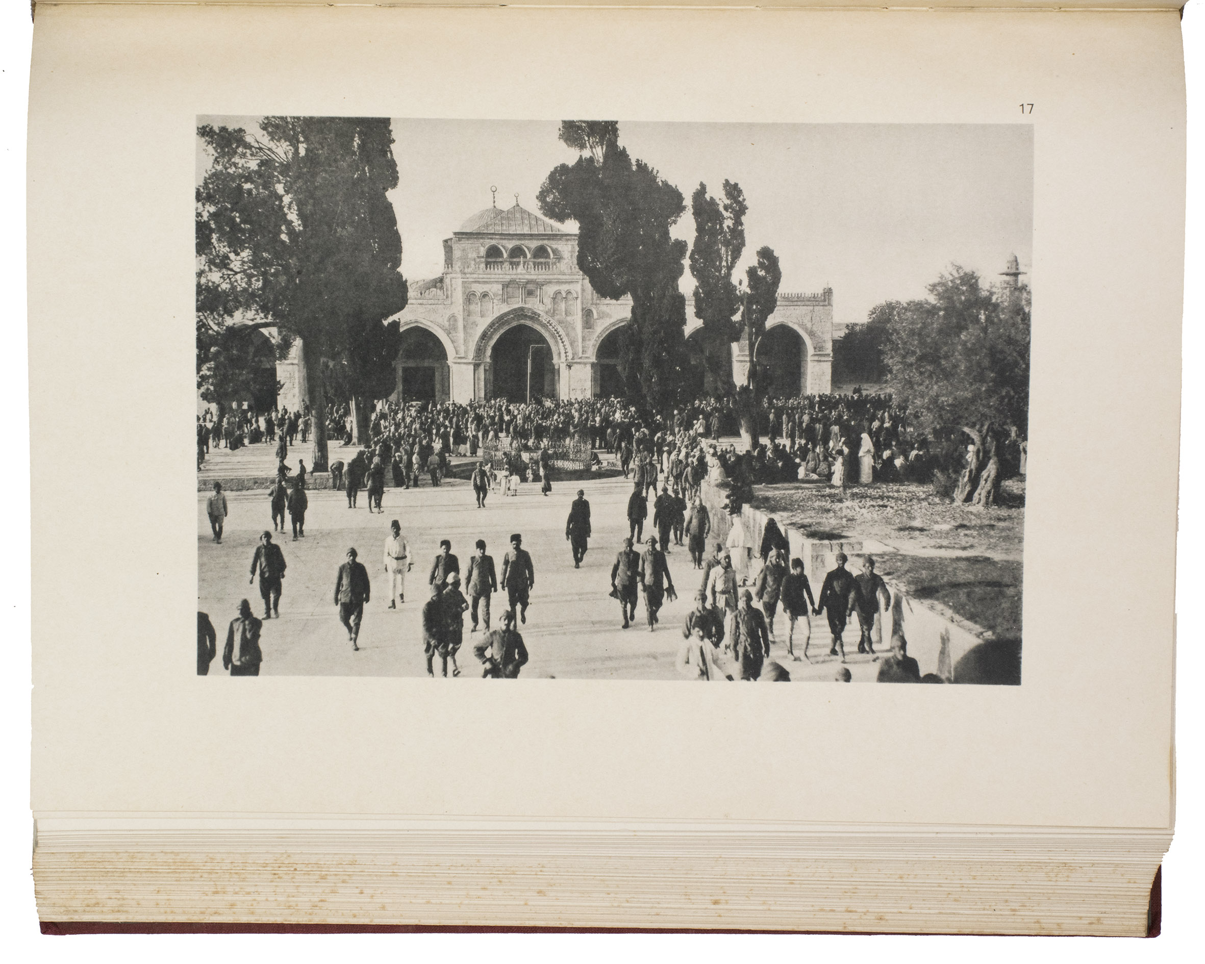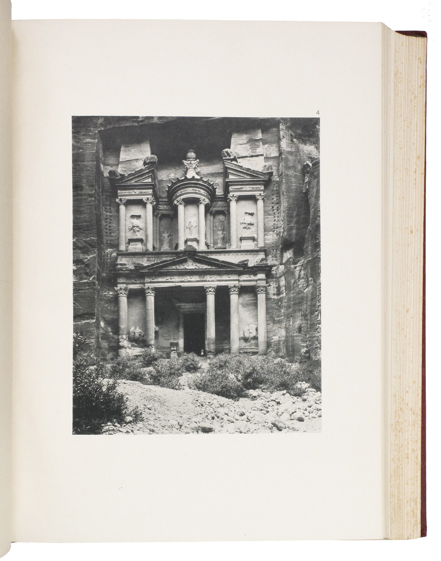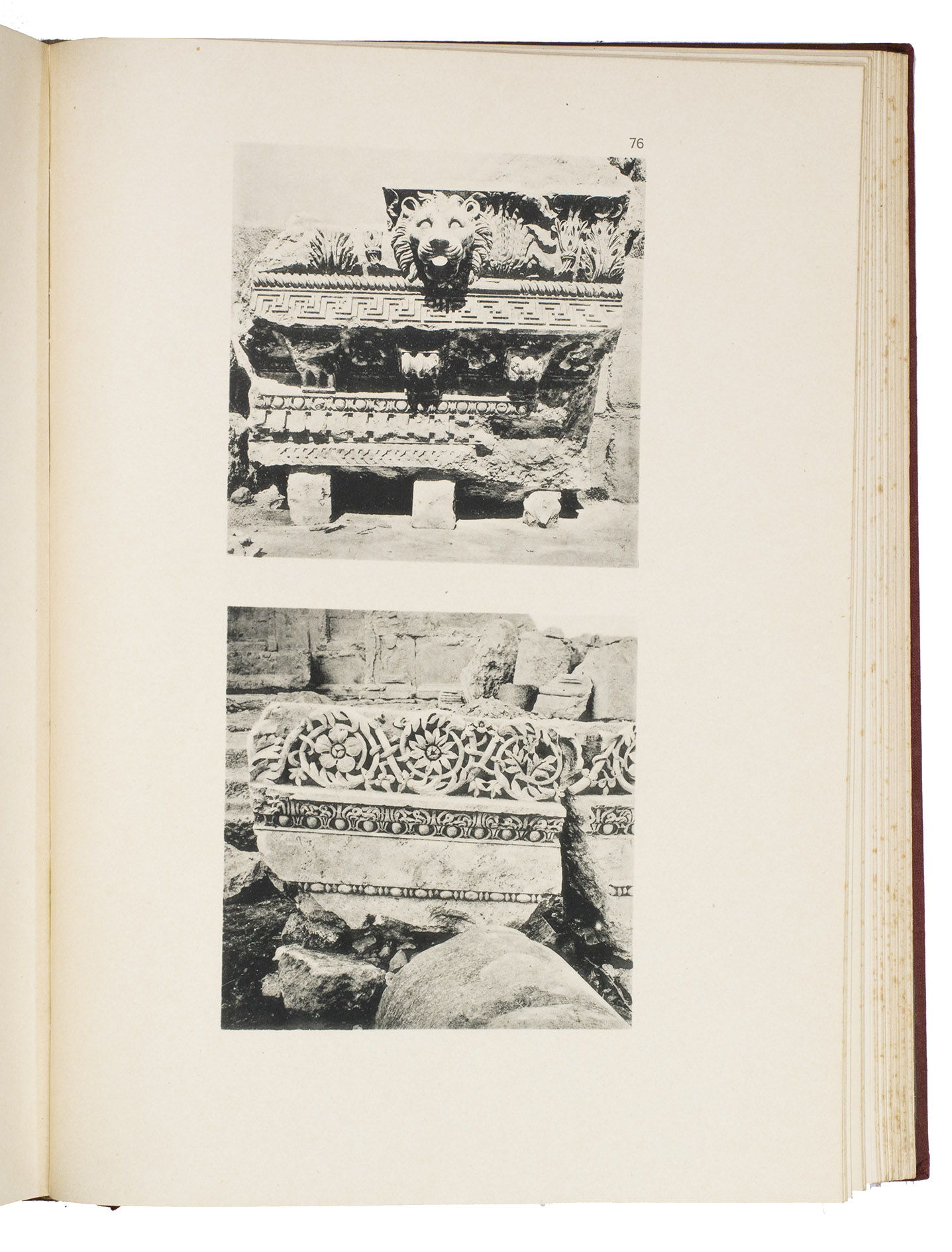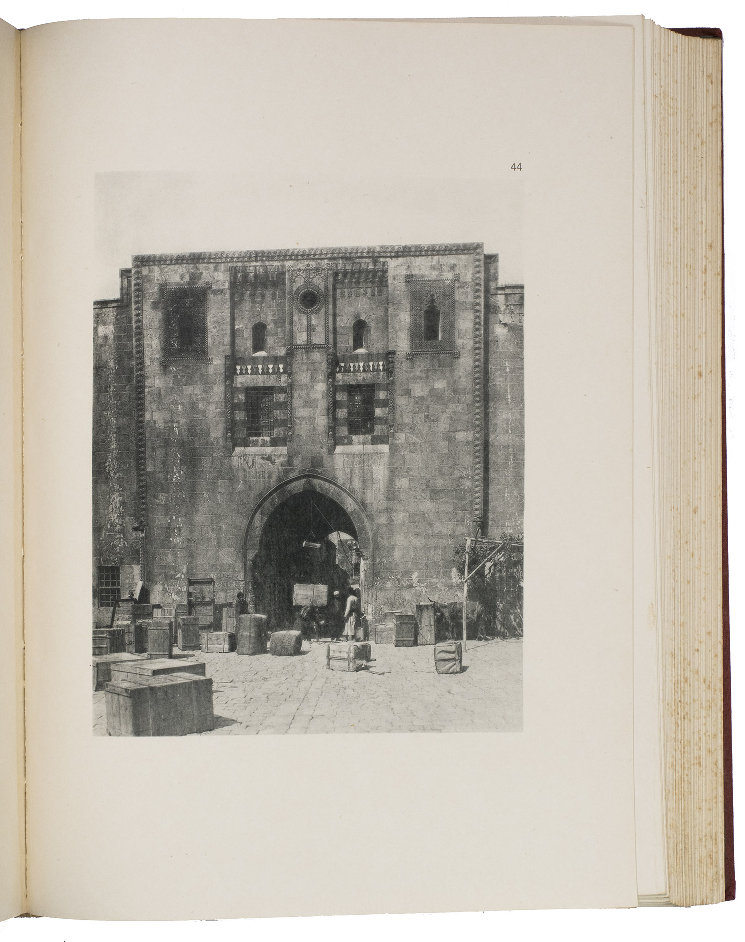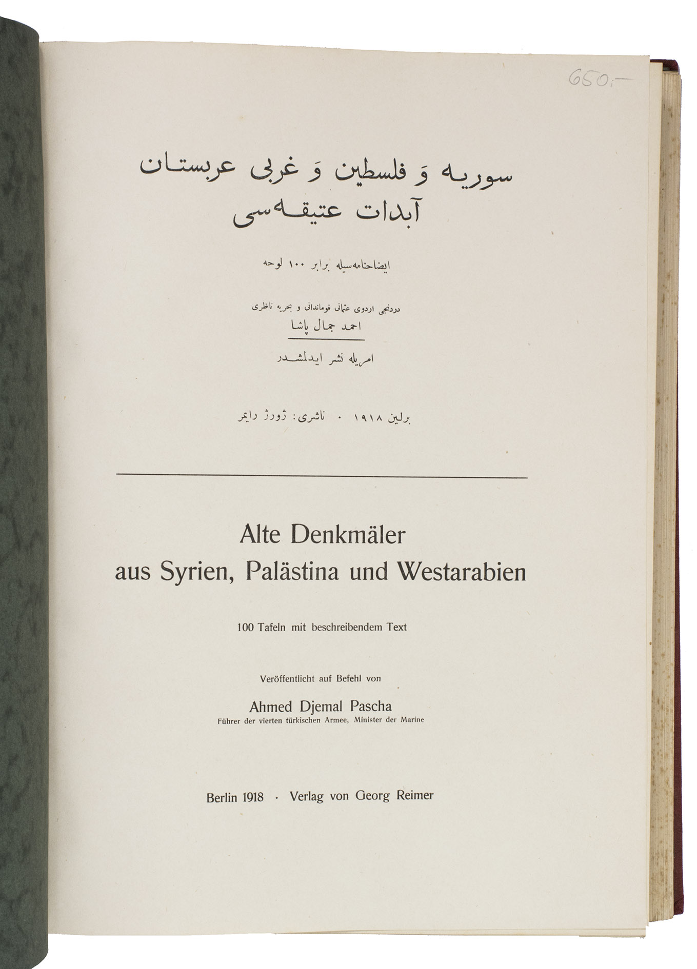 First and only edition of a bilingual work with 143 photographs of archeology in the Middle East, compiled by the well-known German archaeologist Theodore Wiegand (1864-1936). The publication was ordered by Ahmed Djemal Pasha (or Jamal Basha, 1872-1822), the Ottoman military leader and Minister of the Navy, who also wrote the foreword. The 100 plates show a total of 143 photographs, showing archaeological excavation sites in Aleppo, Amman, Baalbek, Damascus, Gerasa, Jerusalem, Palmyra, Petra and others. Each plate is accompanied by a leaf explaining the photographs, with the text in both Arabic and German. Some of the photographs are by the Swedish photographer Lewis Larsson (1881-1958). Others were taken during the expedition by Otto Puchstein (1856-1911) to the capital of the ancient Hittite Empire, Hattusa, in present-day Turkey.
