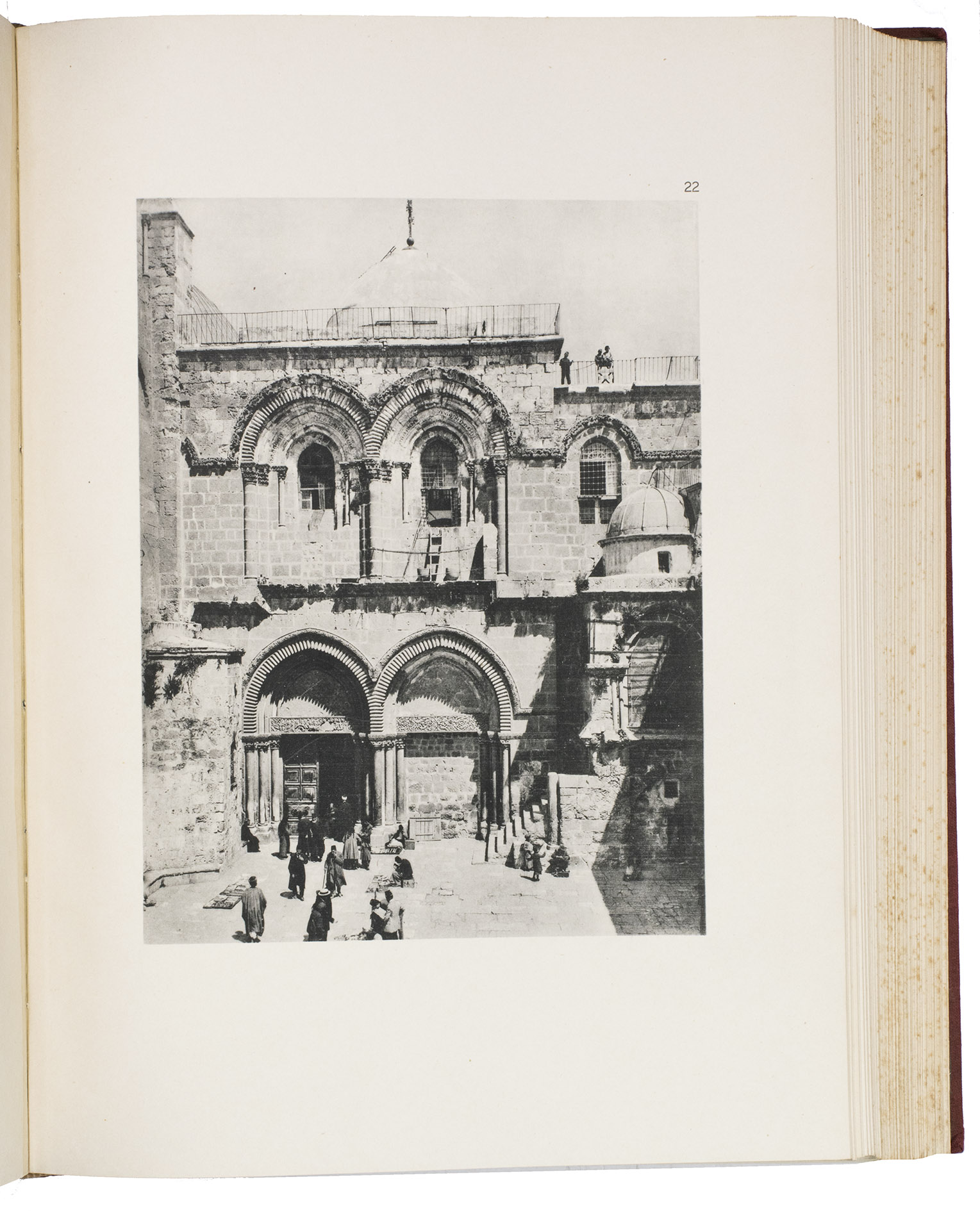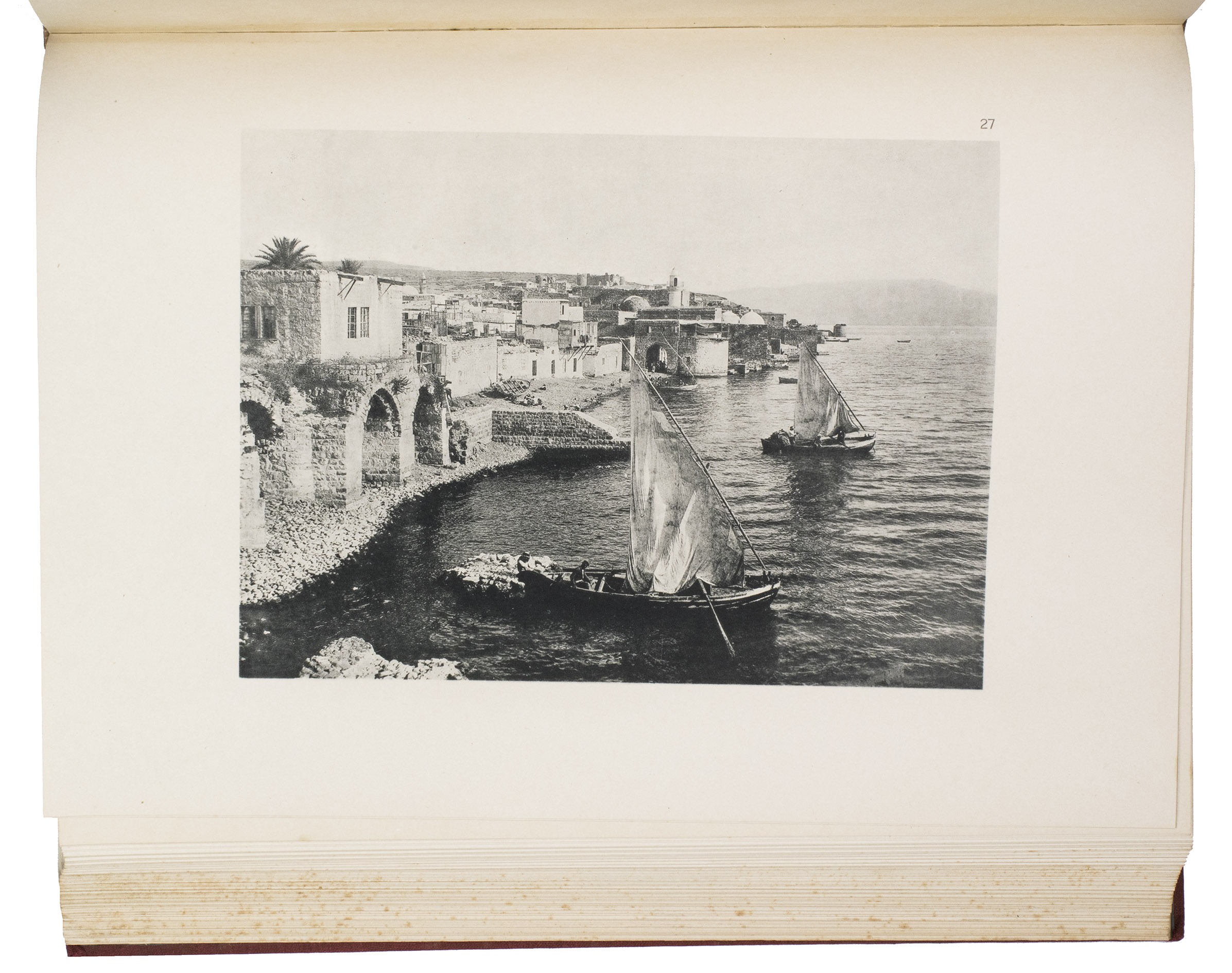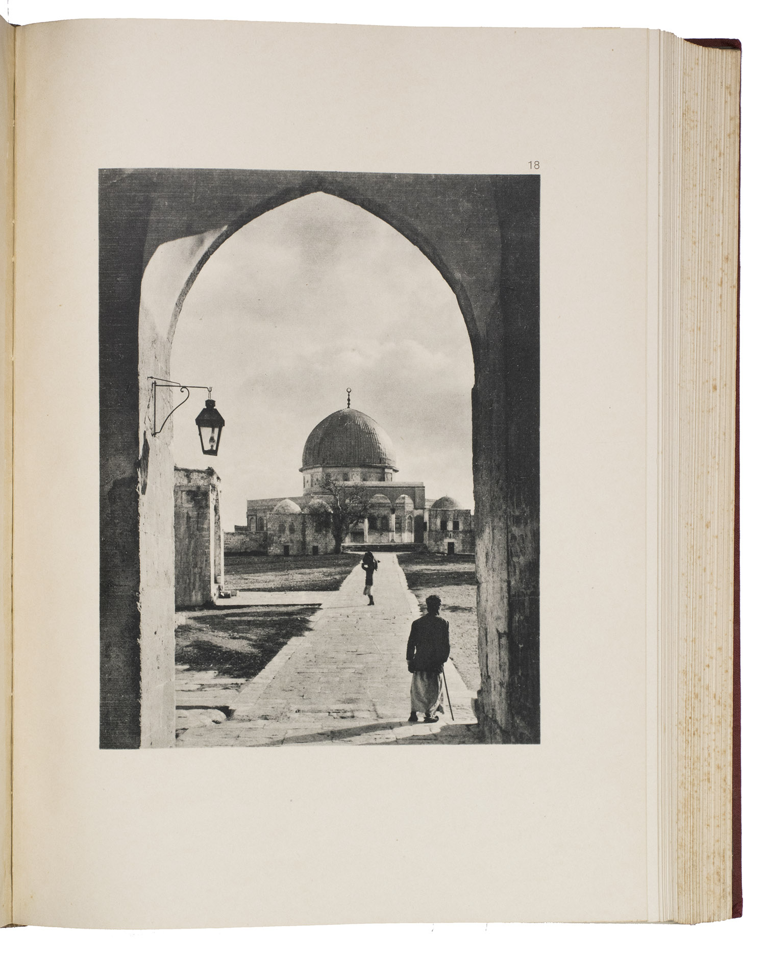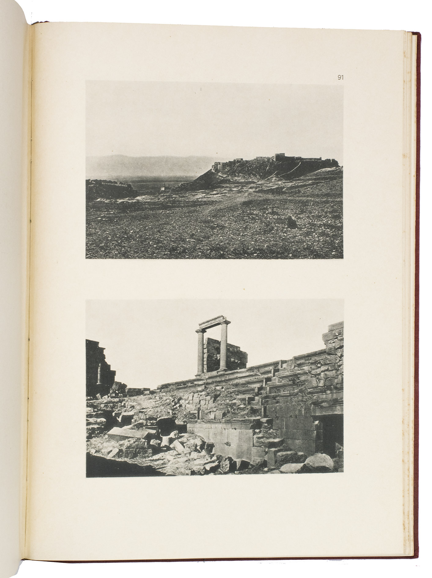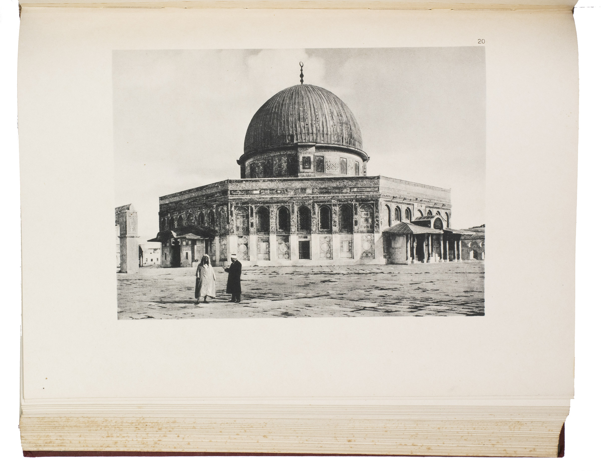 First and only edition of a bilingual work with 143 photographs of archeology in the Middle East, compiled by the well-known German archaeologist Theodore Wiegand (1864-1936). The publication was ordered by Ahmed Djemal Pasha (or Jamal Basha, 1872-1822), the Ottoman military leader and Minister of the Navy, who also wrote the foreword. The 100 plates show a total of 143 photographs, showing archaeological excavation sites in Aleppo, Amman, Baalbek, Damascus, Gerasa, Jerusalem, Palmyra, Petra and others. Each plate is accompanied by a leaf explaining the photographs, with the text in both Arabic and German. Some of the photographs are by the Swedish photographer Lewis Larsson (1881-1958). Others were taken during the expedition by Otto Puchstein (1856-1911) to the capital of the ancient Hittite Empire, Hattusa, in present-day Turkey.