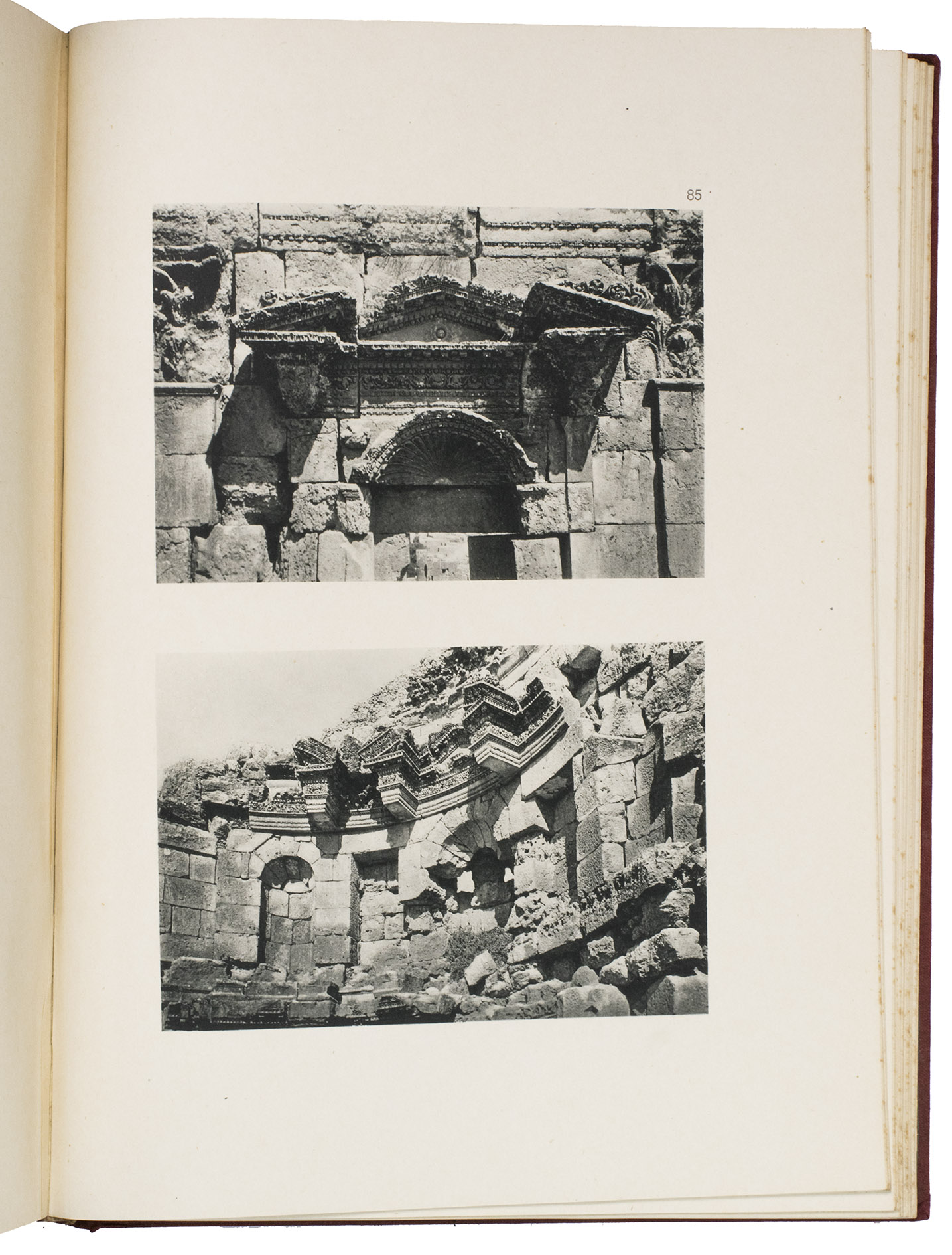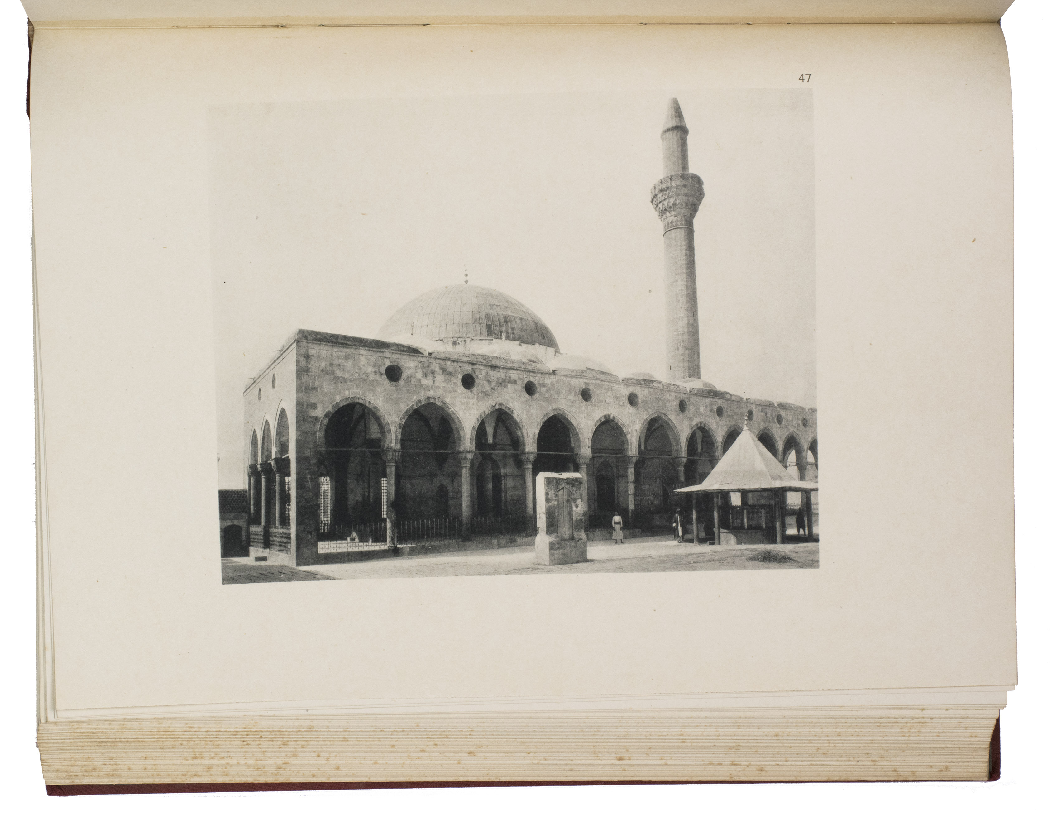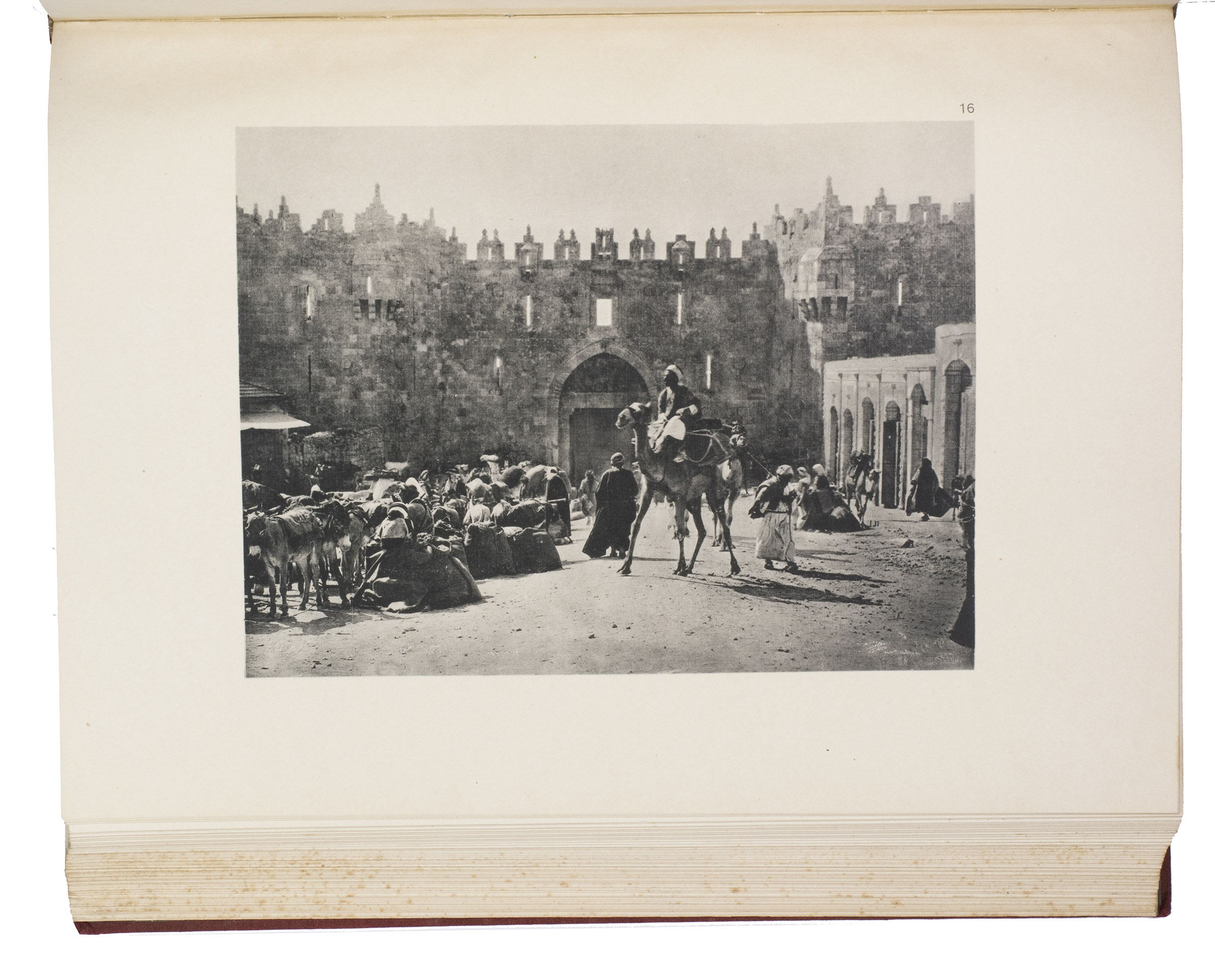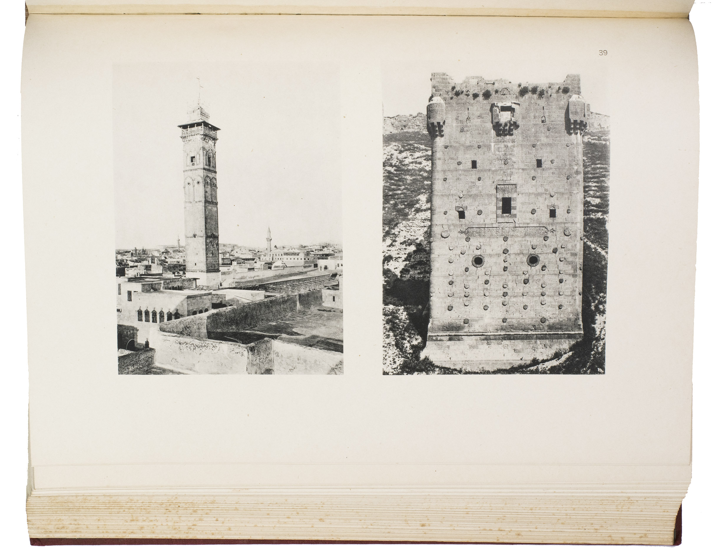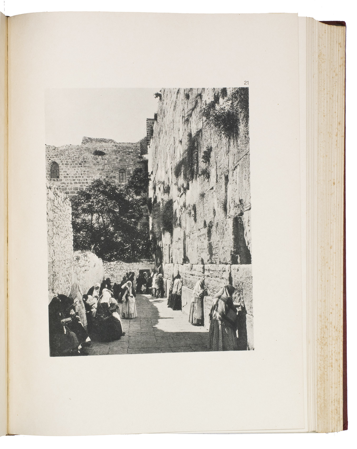 First and only edition of a bilingual work with 143 photographs of archeology in the Middle East, compiled by the well-known German archaeologist Theodore Wiegand (1864-1936). The publication was ordered by Ahmed Djemal Pasha (or Jamal Basha, 1872-1822), the Ottoman military leader and Minister of the Navy, who also wrote the foreword. The 100 plates show a total of 143 photographs, showing archaeological excavation sites in Aleppo, Amman, Baalbek, Damascus, Gerasa, Jerusalem, Palmyra, Petra and others. Each plate is accompanied by a leaf explaining the photographs, with the text in both Arabic and German. Some of the photographs are by the Swedish photographer Lewis Larsson (1881-1958). Others were taken during the expedition by Otto Puchstein (1856-1911) to the capital of the ancient Hittite Empire, Hattusa, in present-day Turkey.