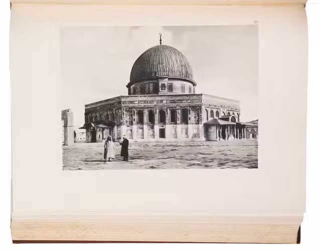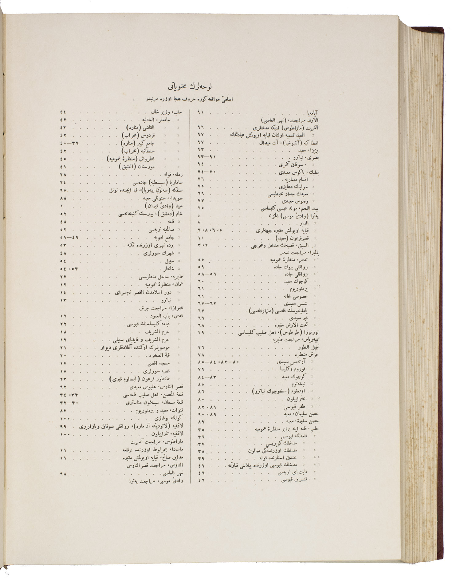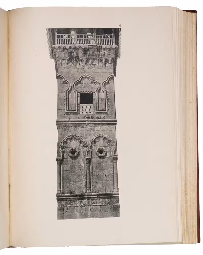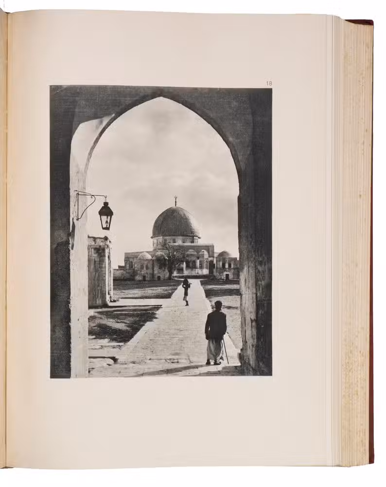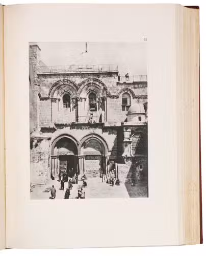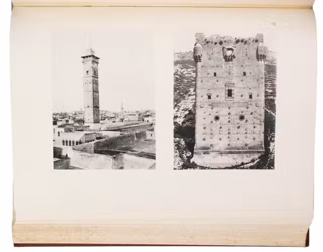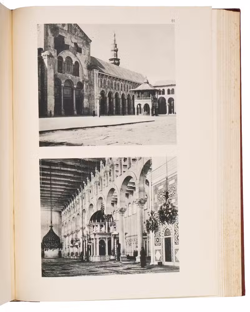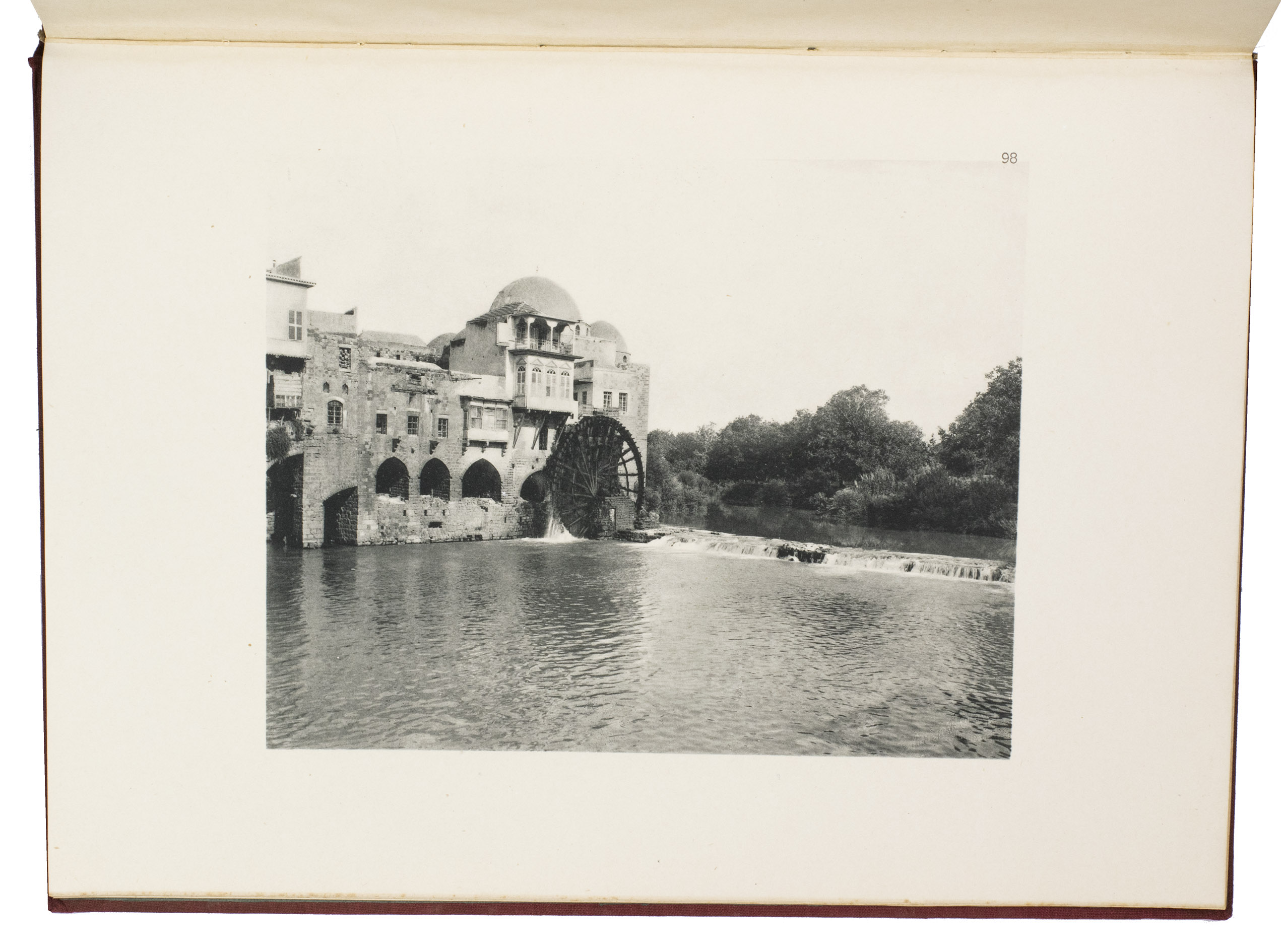 First and only edition of a bilingual work with 143 photographs of archeology in the Middle East, compiled by the well-known German archaeologist Theodore Wiegand (1864-1936). The publication was ordered by Ahmed Djemal Pasha (or Jamal Basha, 1872-1822), the Ottoman military leader and Minister of the Navy, who also wrote the foreword. The 100 plates show a total of 143 photographs, showing archaeological excavation sites in Aleppo, Amman, Baalbek, Damascus, Gerasa, Jerusalem, Palmyra, Petra and others. Each plate is accompanied by a leaf explaining the photographs, with the text in both Arabic and German. Some of the photographs are by the Swedish photographer Lewis Larsson (1881-1958). Others were taken during the expedition by Otto Puchstein (1856-1911) to the capital of the ancient Hittite Empire, Hattusa, in present-day Turkey.