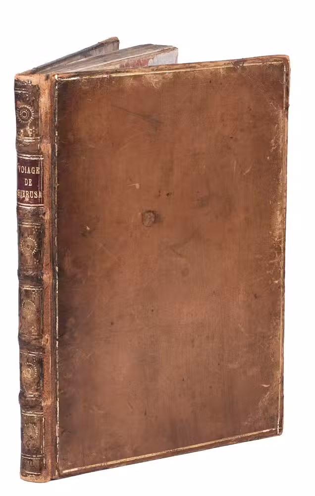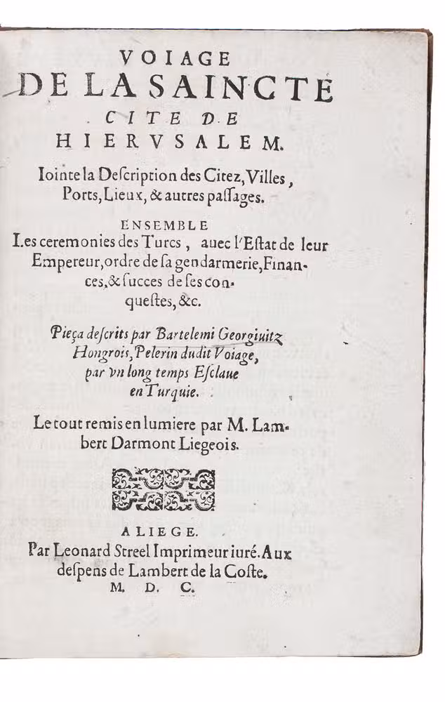 Rare edition, in French, of "one of the most frequently reprinted accounts of all Turkish life and customs" (Atabey). The first part details a pilgrimage from Paris to Jerusalem, the second is devoted to the Ottoman Empire. Bartolomej Djurdjevic (or Georgievitz, ca. 1506-1566) was captured at the battle of Mohács (1526), Hungary, and spent 13 years in Turkish captivity. He describes the miseries of Christian slaves in the Ottoman Empire, as well as Turkish ceremonies, traditions, religion, agriculture, etc. It includes a Turkish-French vocabulary.