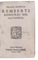 Ad 1: Posthumously published first edition of Rembert Dodoens's 127 Latin lectures on medicine, edited and extensively annotated by Sebastian Egbertsz. de Vrij. Dodoens (1517-1585), the greatest botanist of his age, was appointed professor of medicine at Leiden University in 1582 and delivered the present lectures in 1583 and 1584. He never published them, but they were prepared for publication by his student Sebastian Egbertsz. de Vrij. Much of the material is, of course, of botanical and pharmacological as well as medical interest.