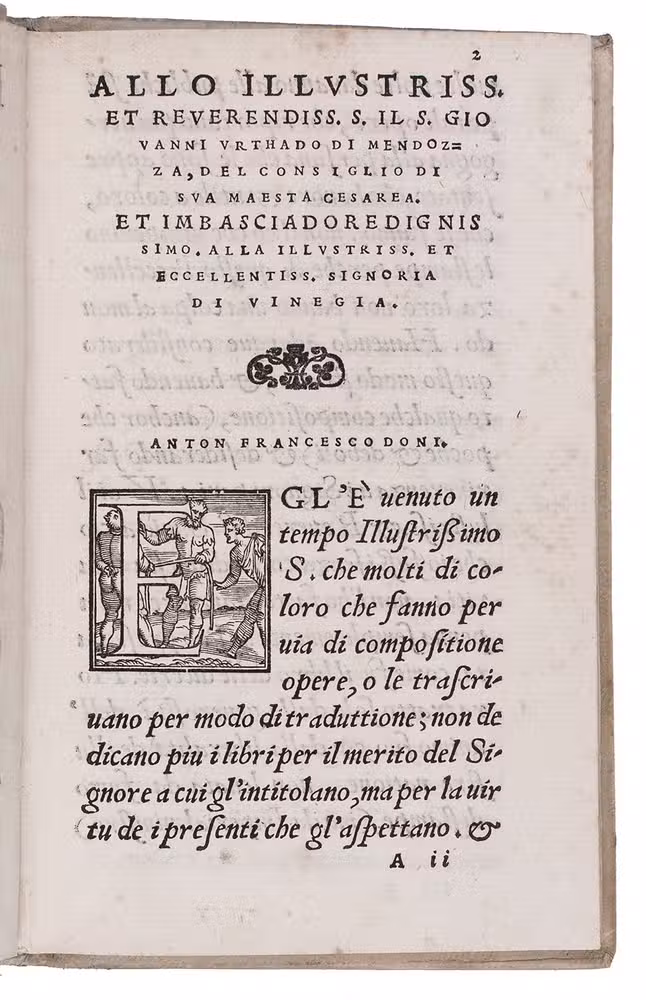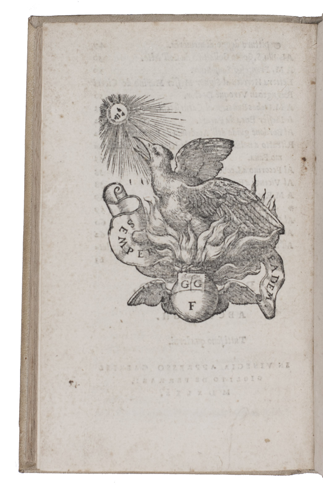 Venice, Gabriele Giolito de Ferrari, (colophon: February) 1549. Small 8vo (16 x 10 cm). With the imprint in the base of an elaborate woodcut on the title page, with Ferrari's motto, initials and phoenix device, a different woodcut phoenix device on last page, and 21 woodcut pictorial initials (3 series) plus 1 repeat. Italian sheepskin parchment (ca. 1700?). 63, [1] ll.