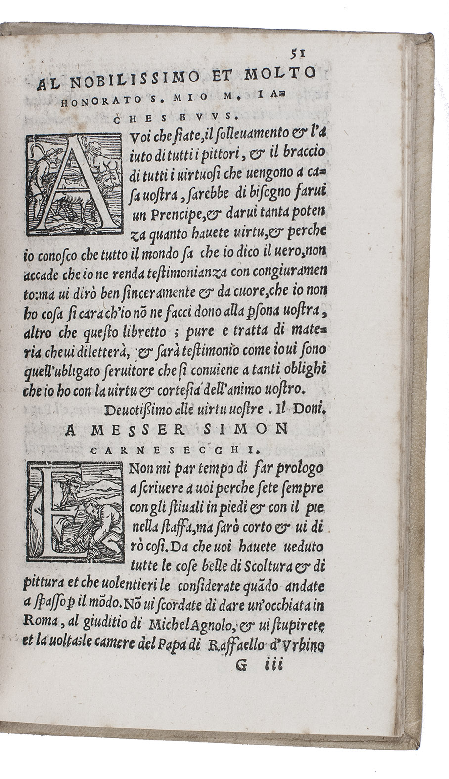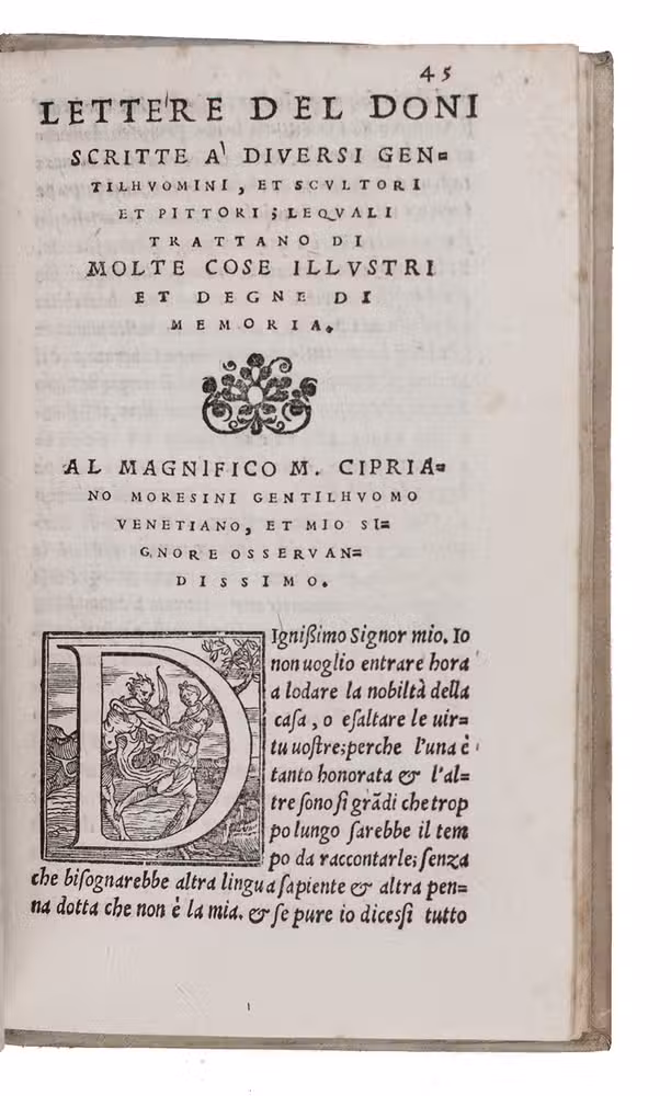 First and only edition of six Italian essays on painting and sculpture by the many-sided Italian writer Anton Francesco Doni. Before the essays he gives a list of the painters and sculptors he discusses in the book and after them the texts of his letters to Italian painters, sculptors and other notable persons. The extensive index that concludes the work includes the various subjects discussed. The first five essays concern the principles and practices of sculpture and painting as art, also discussing details of techniques and materials, such as the manner of achieving the brightest colours in the mixing of oil paints. But the sixth gives advice on dealing with patronage, though also discussing the relation between sculpture and painting and the proportions of the human head. It has been suggested that this last essay may have been written by Doni's friend Baccio Bandinelli (1493-1560).