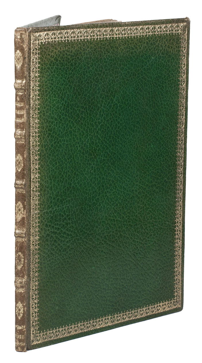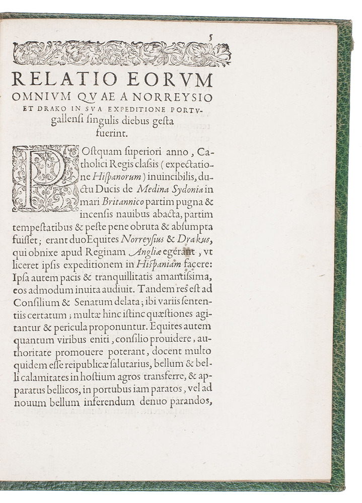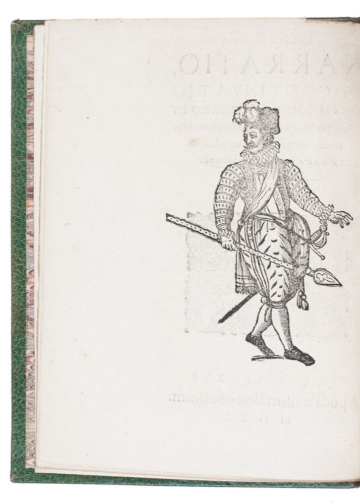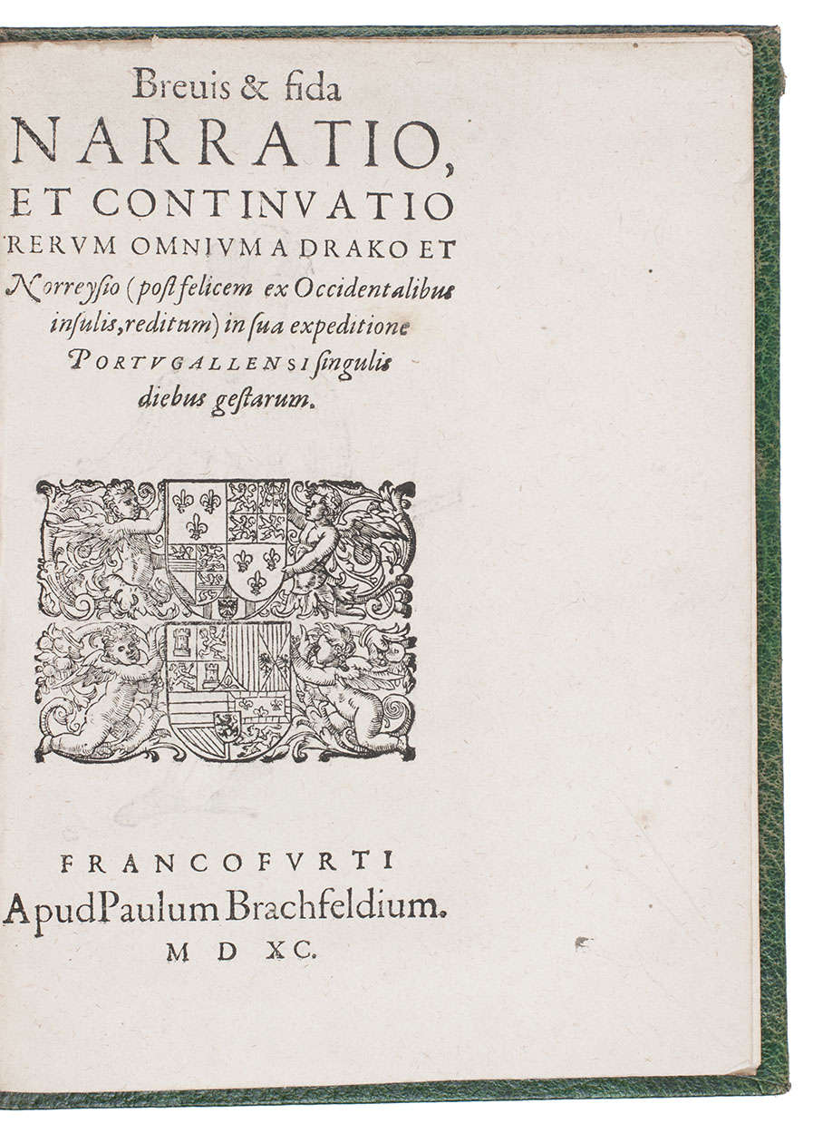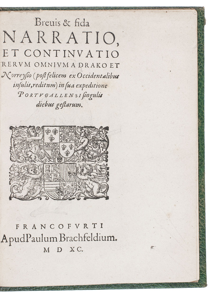 Frankfurt am Main, Paul Brachfeldt, 1590. 4to. With the woodcut arms on the title-page, the upper related to that of Queen Elizabeth of England and the lower that of King Philip I of Portugal (Philip II of Spain), each supported by putti, a full-page woodcut standing soldier with sword and spear, perhaps intended as Francis Drake. Gold-tooled green morocco (2nd half of 19th century). [2], 29, [1 blank] pp.