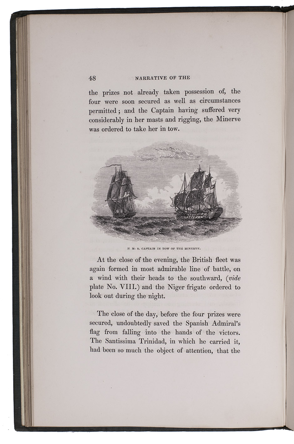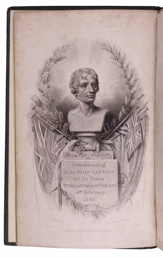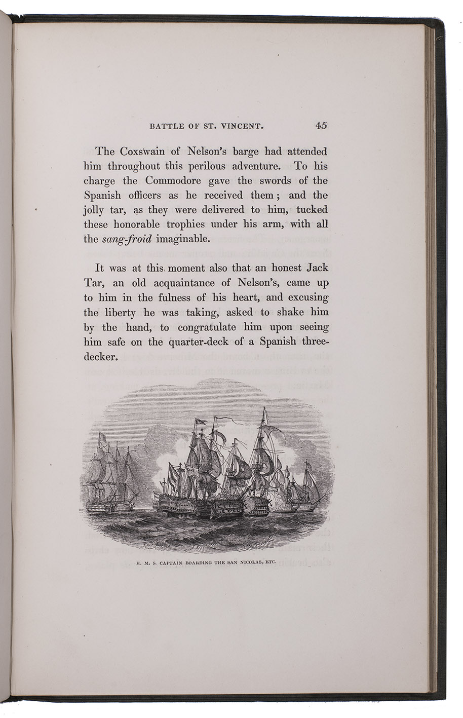 London, Saunders & Otley (back of title-page: printed by William Wilcockson), 1840. 8vo. With an engraved frontispiece with a portrait of Horatio Nelson, 3 wood-engraved vignettes and 8 lithographed full-page sea-battle plans. Publisher's original blind-blocked cloth, with title in gold on spine and front board, gilt edges. XII, 97, [3 blank] pp.