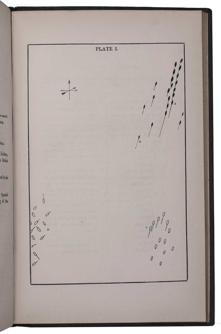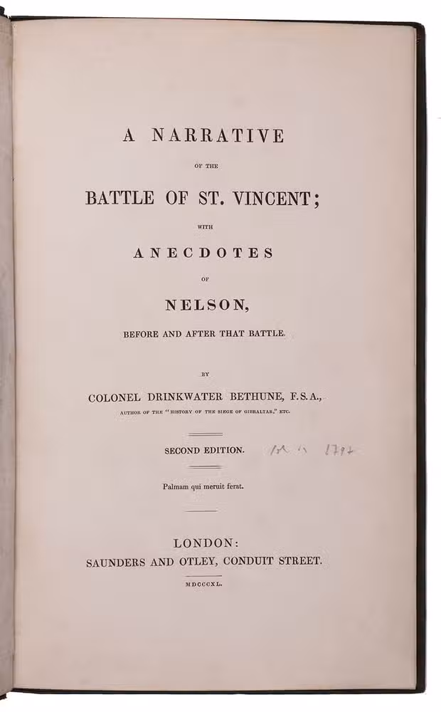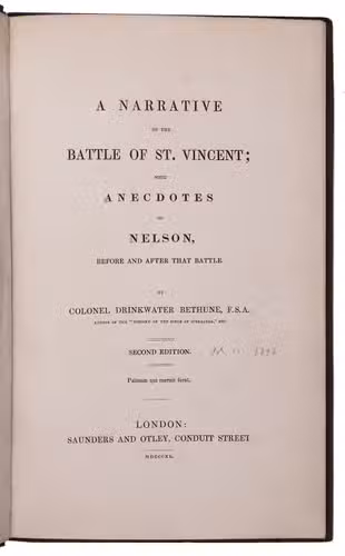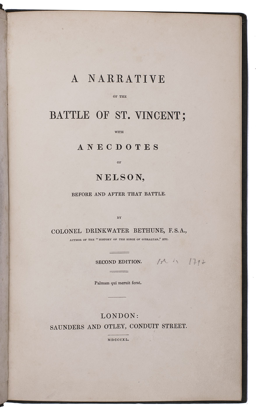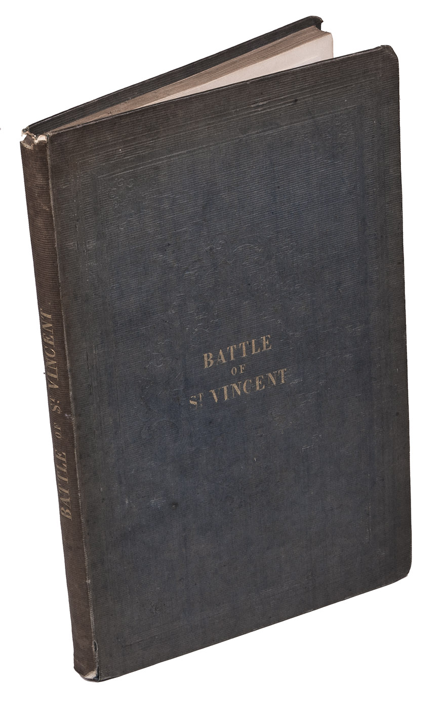 Enlarged second edition of a work on the sea battle at Cape St Vincent, by the English army officer and military historian John Drinkwater Bethune (1762-1844), "one of the most important eye-witness accounts of the battle, by a spectator rather than a participant" (NMM). The battle the took place near Cape St Vincent, Portugal, on 14 February 1797, when the British fleet under Admiral Sir John Jervis defeated the much larger Spanish fleet. The work honours Vice-Admiral Horatio Nelson (1758-1805), whose contribution during the battle was essential, and the present edition is enlarged with some anecdotes from Nelson himself. The work opens with a preface, followed by a description of the battle. The appendix contains a list of killed and wounded marines, two lists with the names of the ships of the British and Spanish fleet, and 8 battle plans, showing the positions of the ships of both fleets during different hours of the battle.