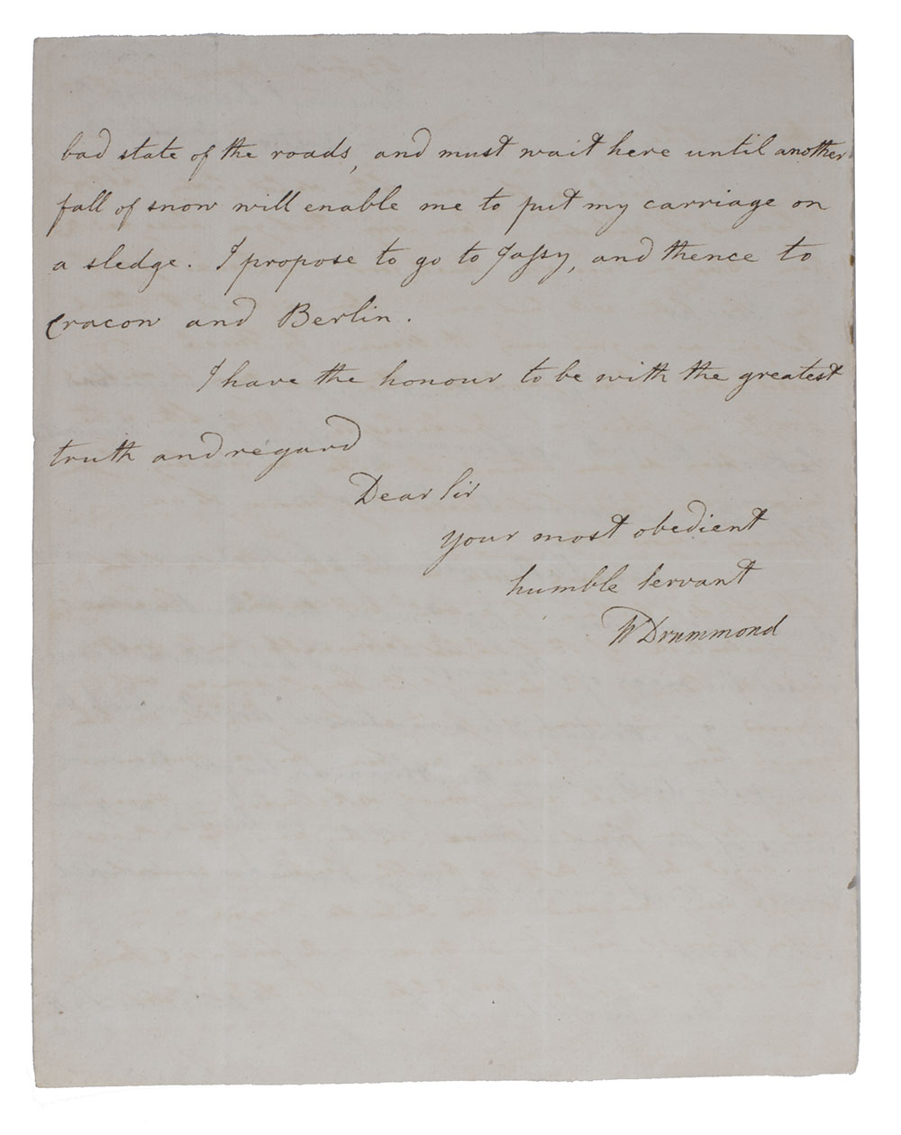 A signed autograph letter by William Drummond (1770-1828), Scottish classical scholar, poet and British ambassador to the Ottoman Empire, written in Bucharest en route from Constantinople (Istanbul) to Berlin.