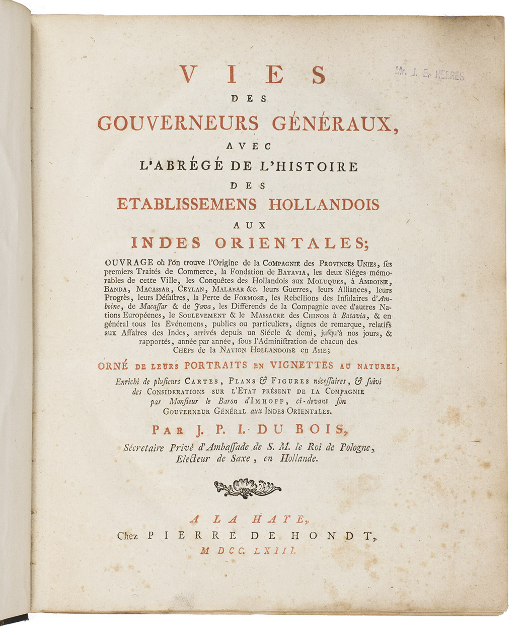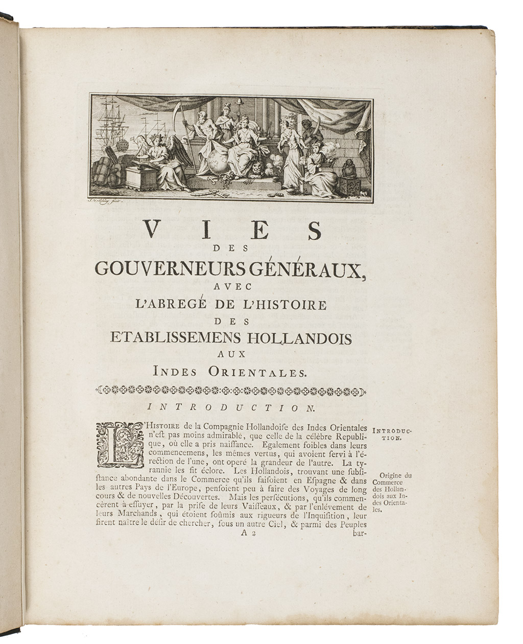 First edition of a richly illustrated history of the Dutch East Indian Company, including the lives of all 28 Dutch Governors-General arranged chronologically from Pieter Both, appointed in 1609, to Jacob Mossel, appointed in 1752. The book ends with an interesting treatise on the actual state of the Dutch East Indies, the VOC and the means to redress the causes of its decline in the last 50 years or so, by the late Governor-General Gustaaf Willem Baron d'Imhoff (1705-1750), who was appointed Governor-General in 1740 and stayed in Batavia from 1742 to his death.