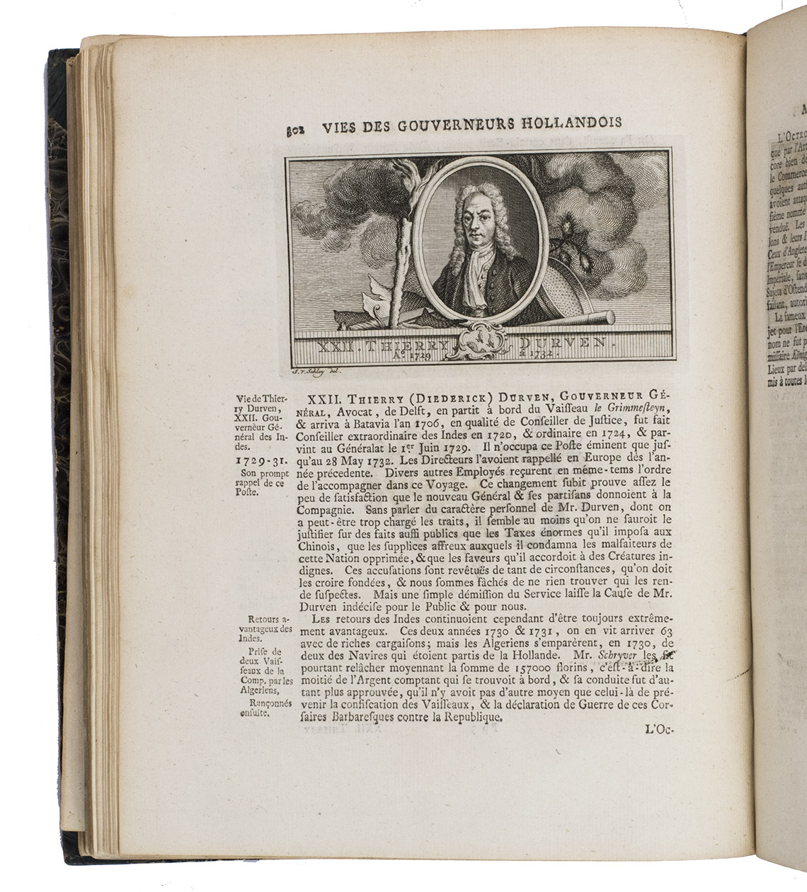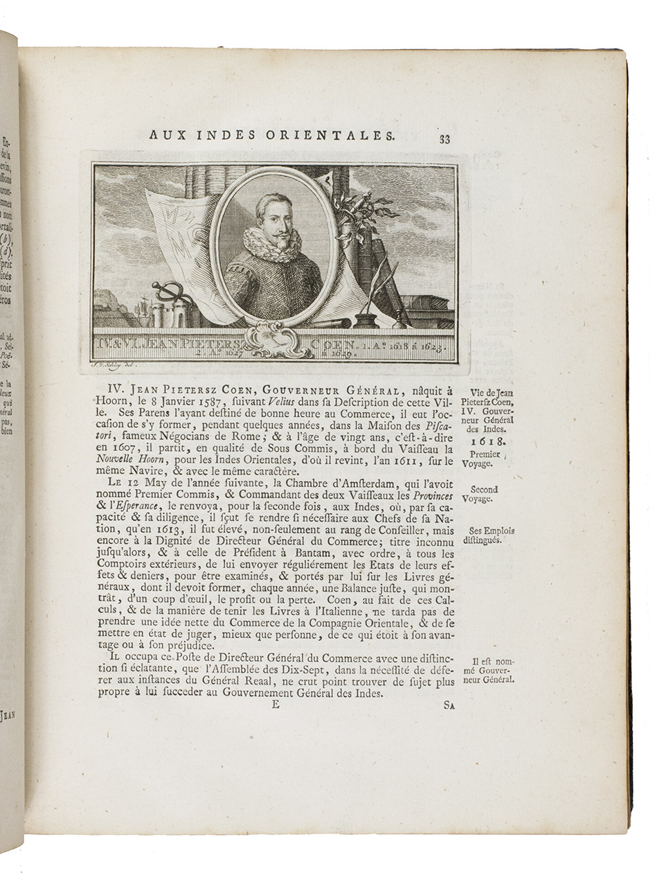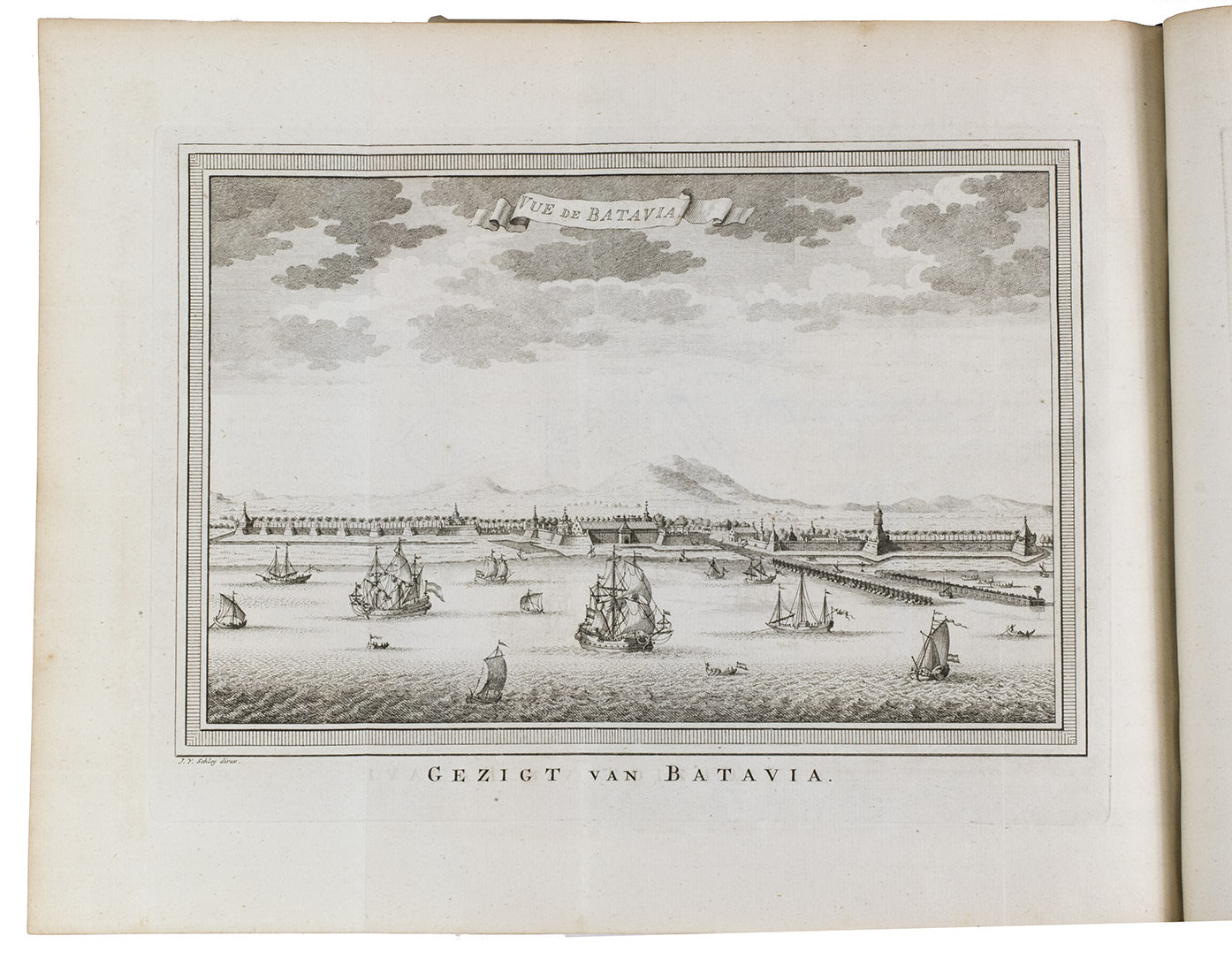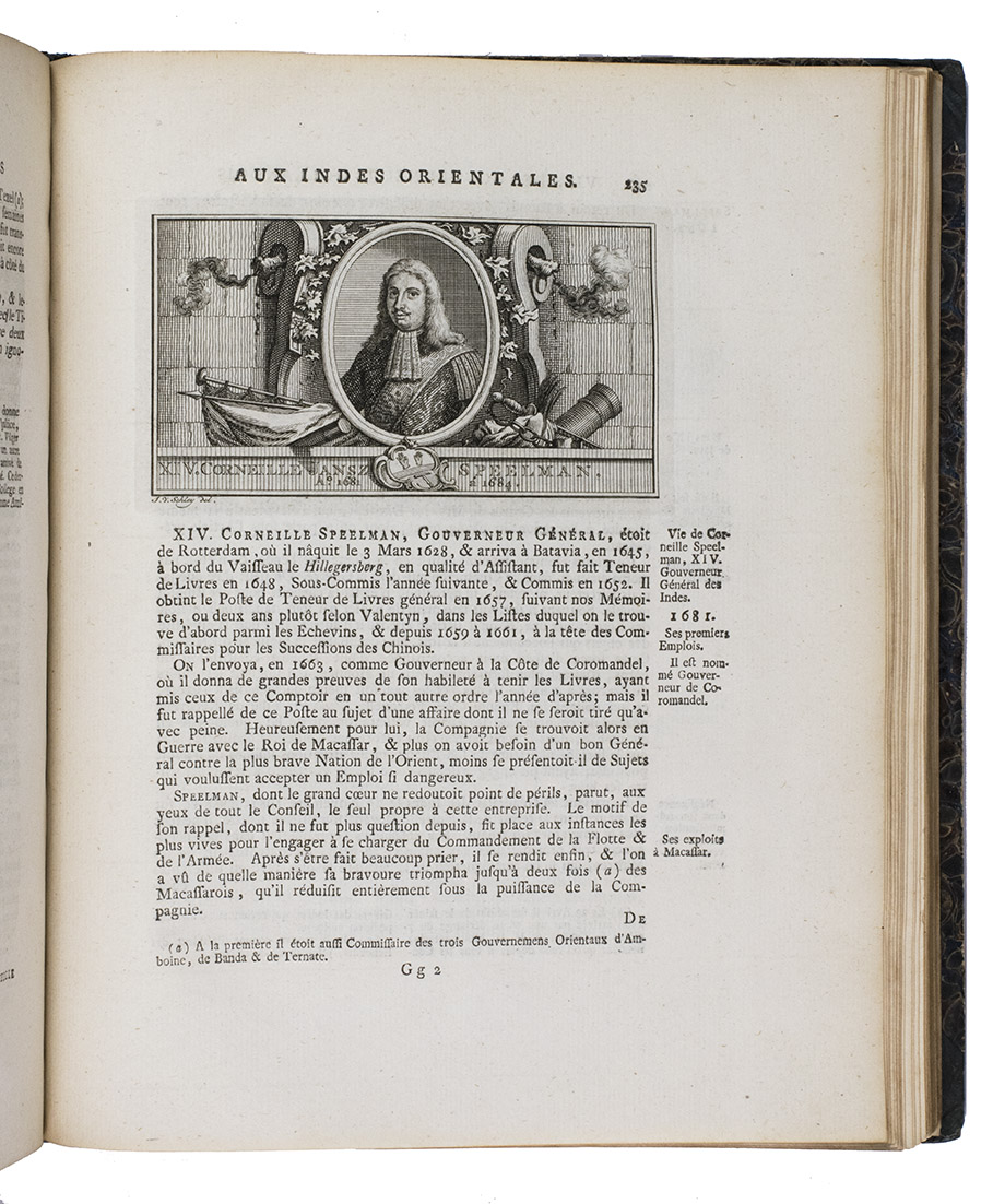 The Hague, Pieter de Hondt, 1763. Royal 4to (27.5 x 22.5 cm). With 34 engraved plates, 1 engraved allegorical headpiece and 28 numbered headpieces with portraits of the Gouvernors-General of the Dutch East Indies. All plates were drawn and presumably engraved by the artist and engraver Jacob van Schley (1715-1729). 19th-century half cloth. VI, 351, [1], 48 pp.