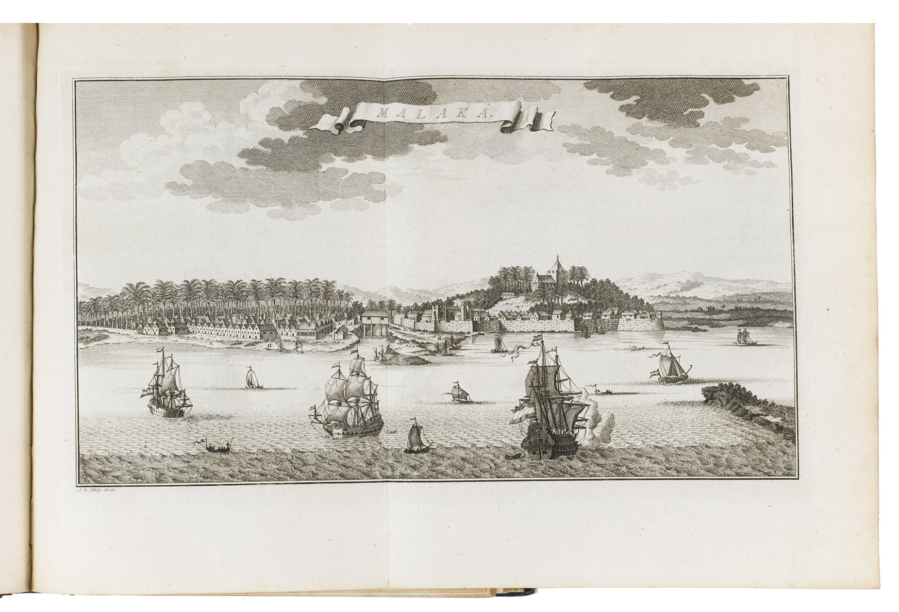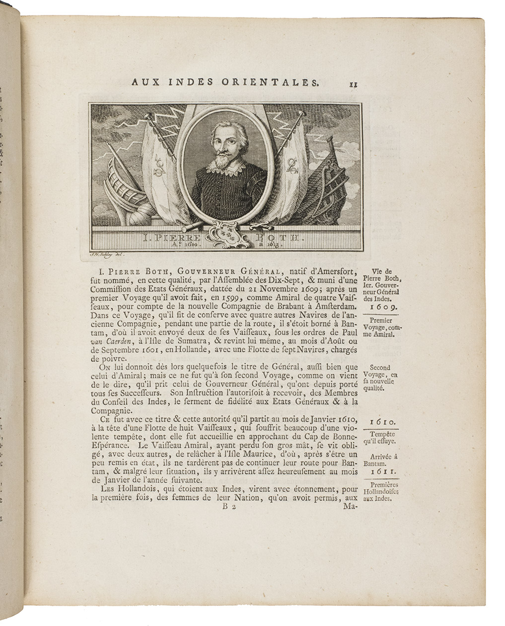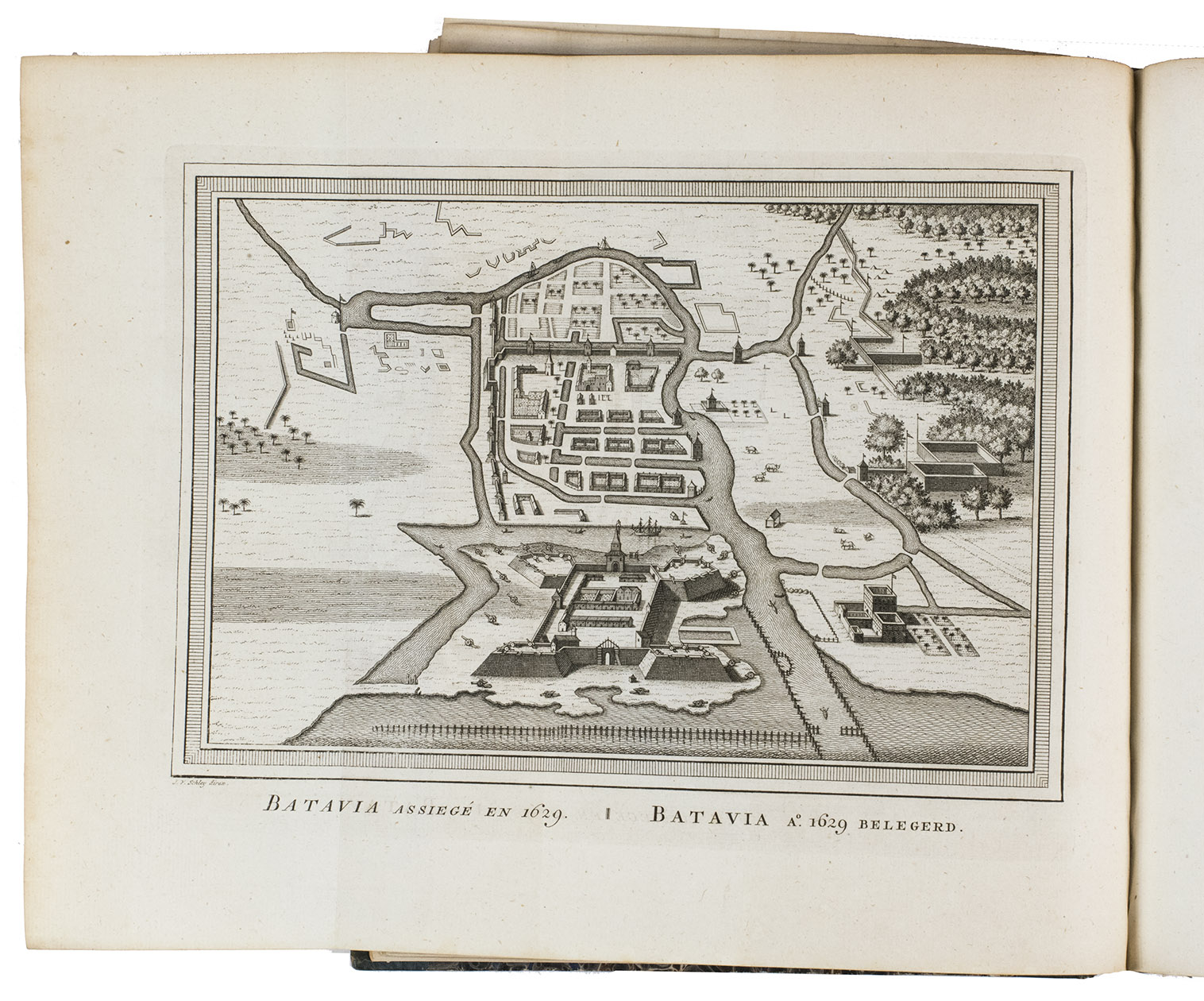 The Hague, Pieter de Hondt, 1763. Royal 4to (27.5 x 22.5 cm). With 34 engraved plates, 1 engraved allegorical headpiece and 28 numbered headpieces with portraits of the Gouvernors-General of the Dutch East Indies. All plates were drawn and presumably engraved by the artist and engraver Jacob van Schley (1715-1729). 19th-century half cloth. VI, 351, [1], 48 pp.