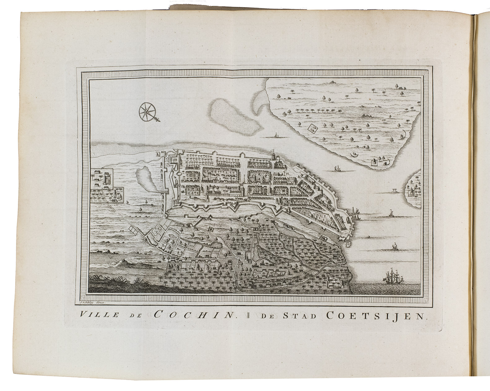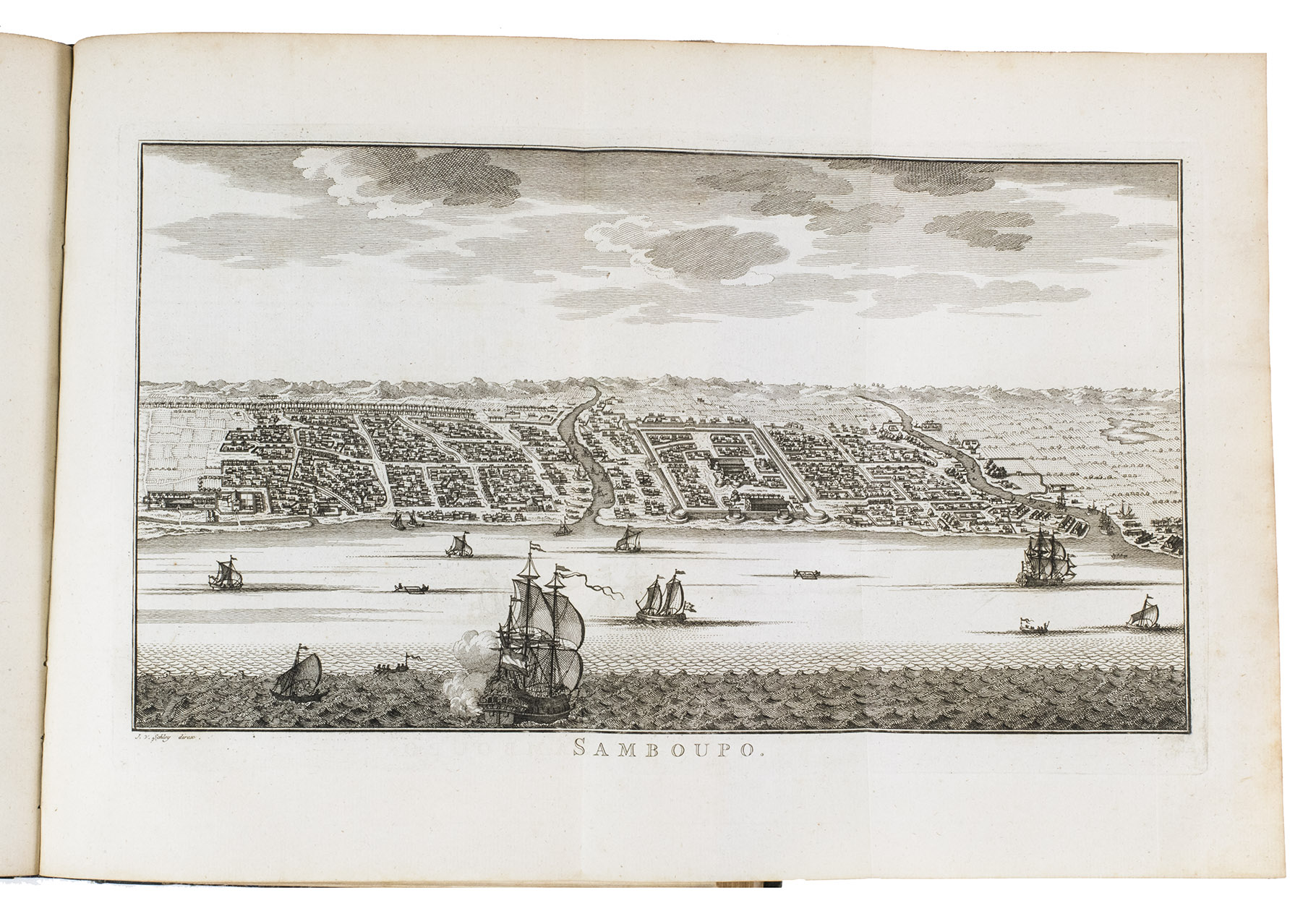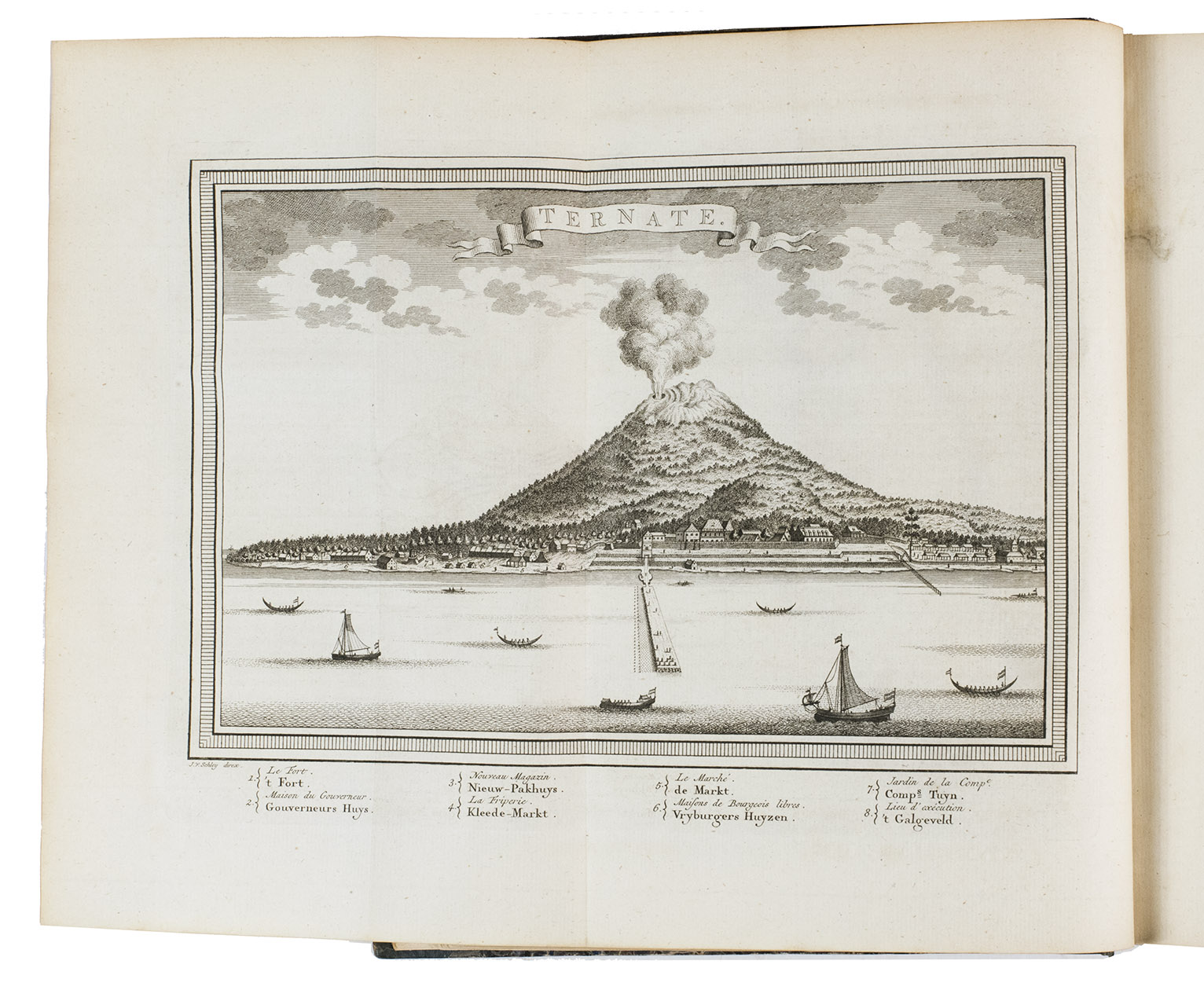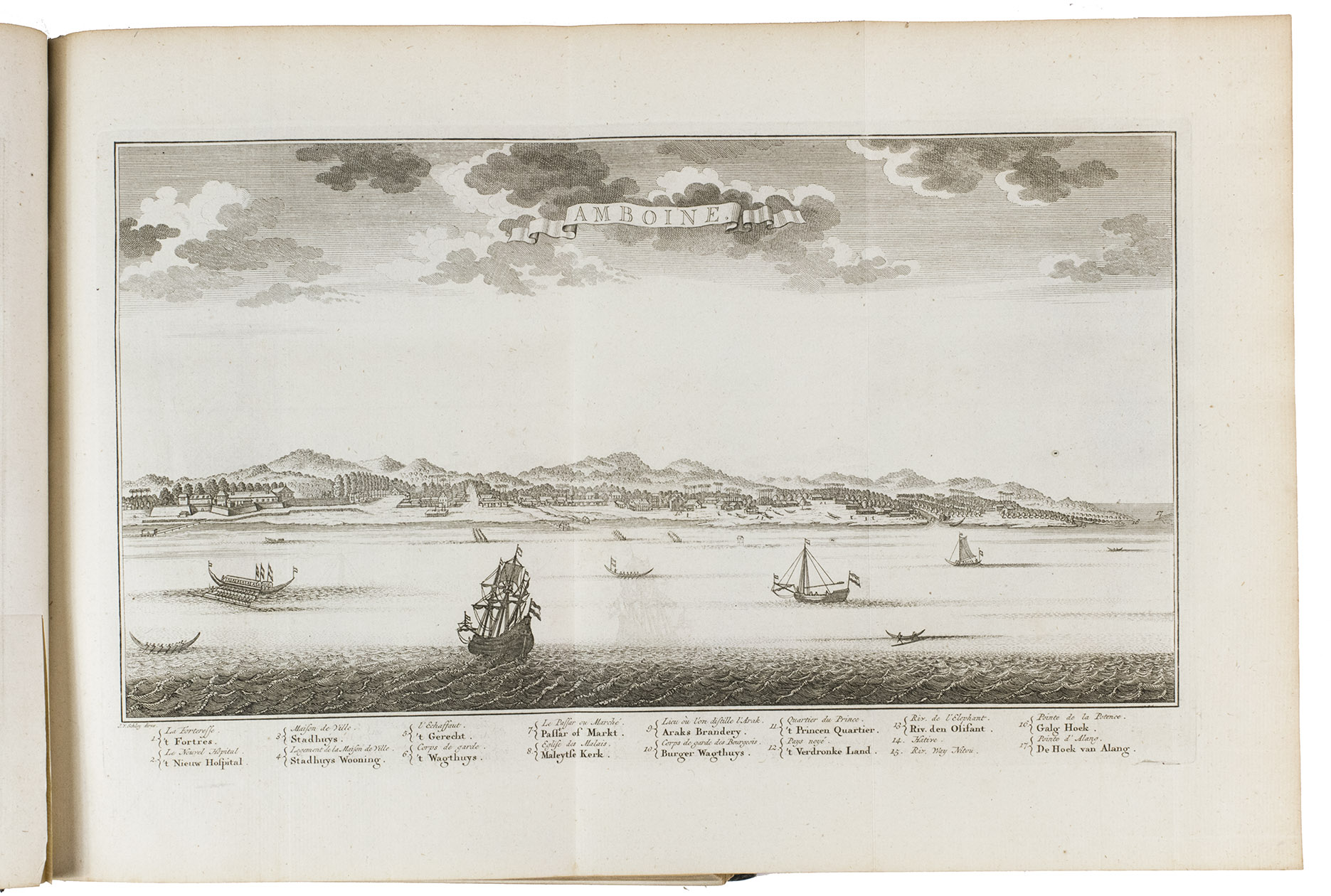 The Hague, Pieter de Hondt, 1763. Royal 4to (27.5 x 22.5 cm). With 34 engraved plates, 1 engraved allegorical headpiece and 28 numbered headpieces with portraits of the Gouvernors-General of the Dutch East Indies. All plates were drawn and presumably engraved by the artist and engraver Jacob van Schley (1715-1729). 19th-century half cloth. VI, 351, [1], 48 pp.