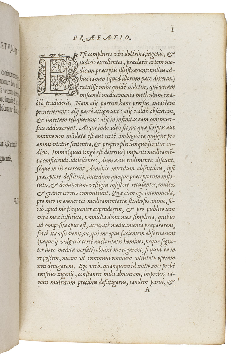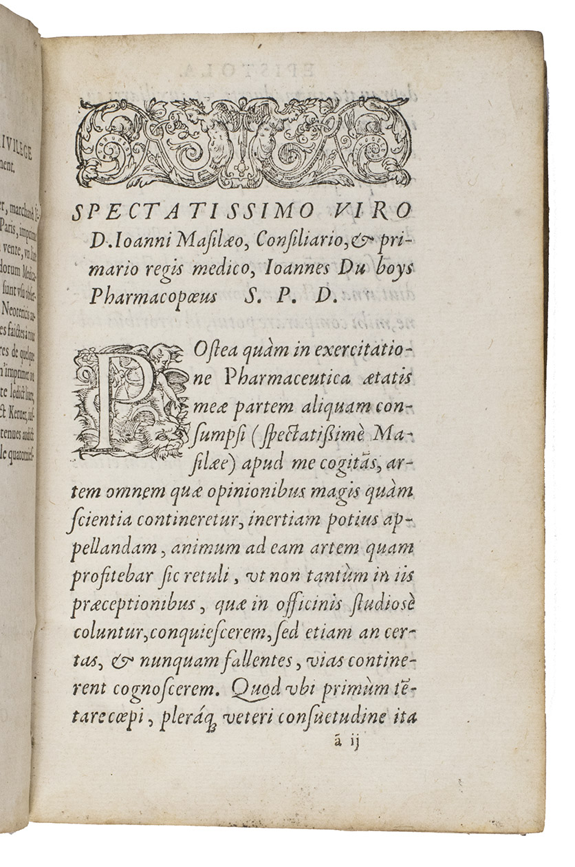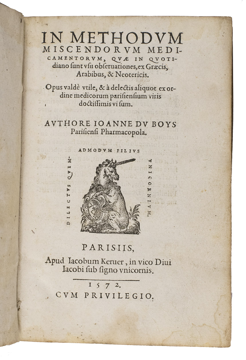 Rare first edition of a pharmaceutical work by Jean Du Boys (ca. 1500-1576), describing everyday medicine as found in the works of the ancient Greeks and Arabs. It gives recipes for different medicines and the attributes ascribed to the medicines and herbs. Jean Du Boys was born at Lille, studied at Louvain and practiced at Valenciennes. In 1562 he became professor at the recently founded University of Douai. He is the author a few other works. As he is occasionally also called Sylvius, he is not to be confused with Jacques Dubois Sylvius (1478?-1555), teacher of Vesalius.